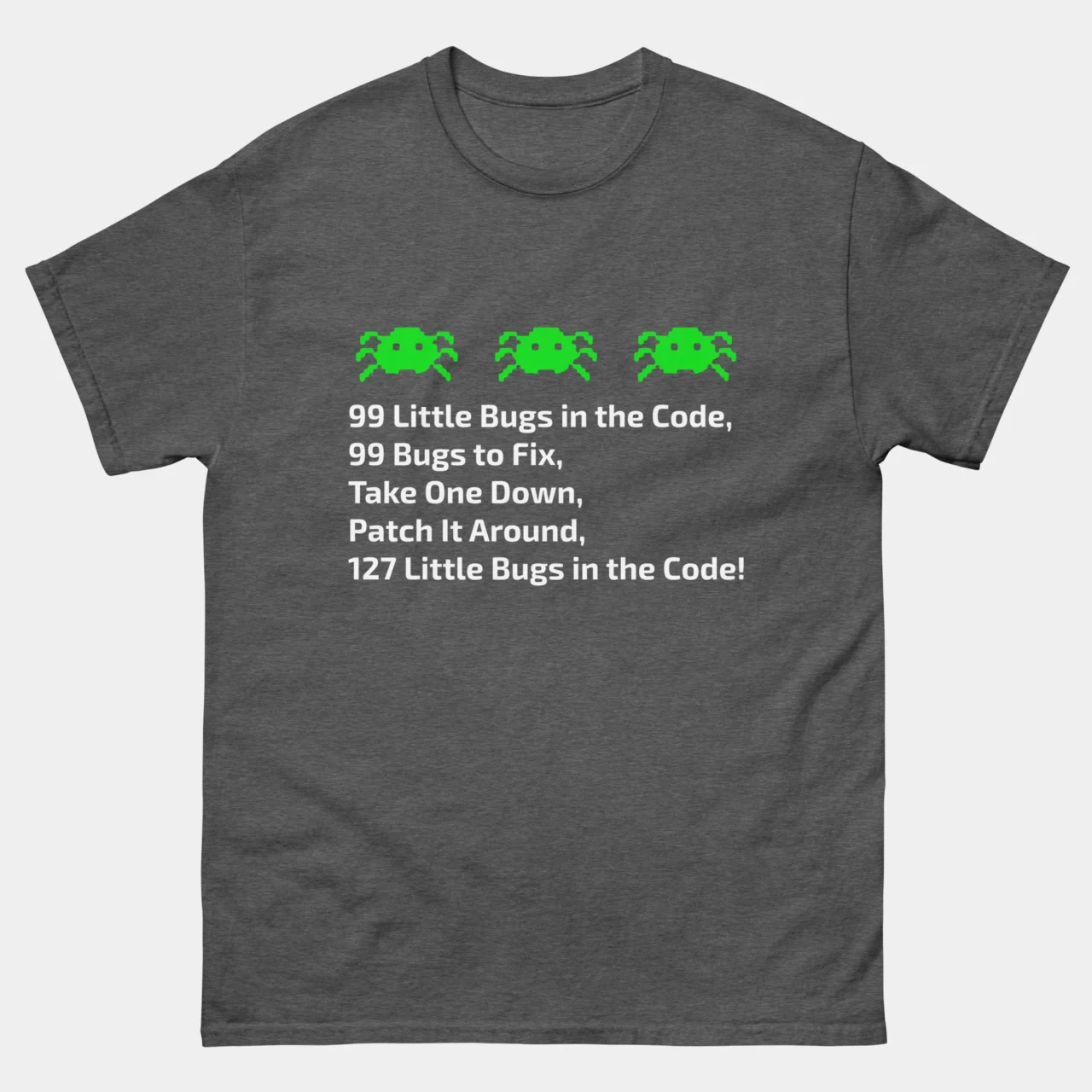 99 Little Bugs in the Code T-Shirt: “99 little bugs in the code, 99 bugs to fix, take one down, patch it around, 127 little bugs in the code.” Because debugging is never-ending! If you’ve ever spent hours fixing one issue just to break five others, this funny programming t-shirt is for you.