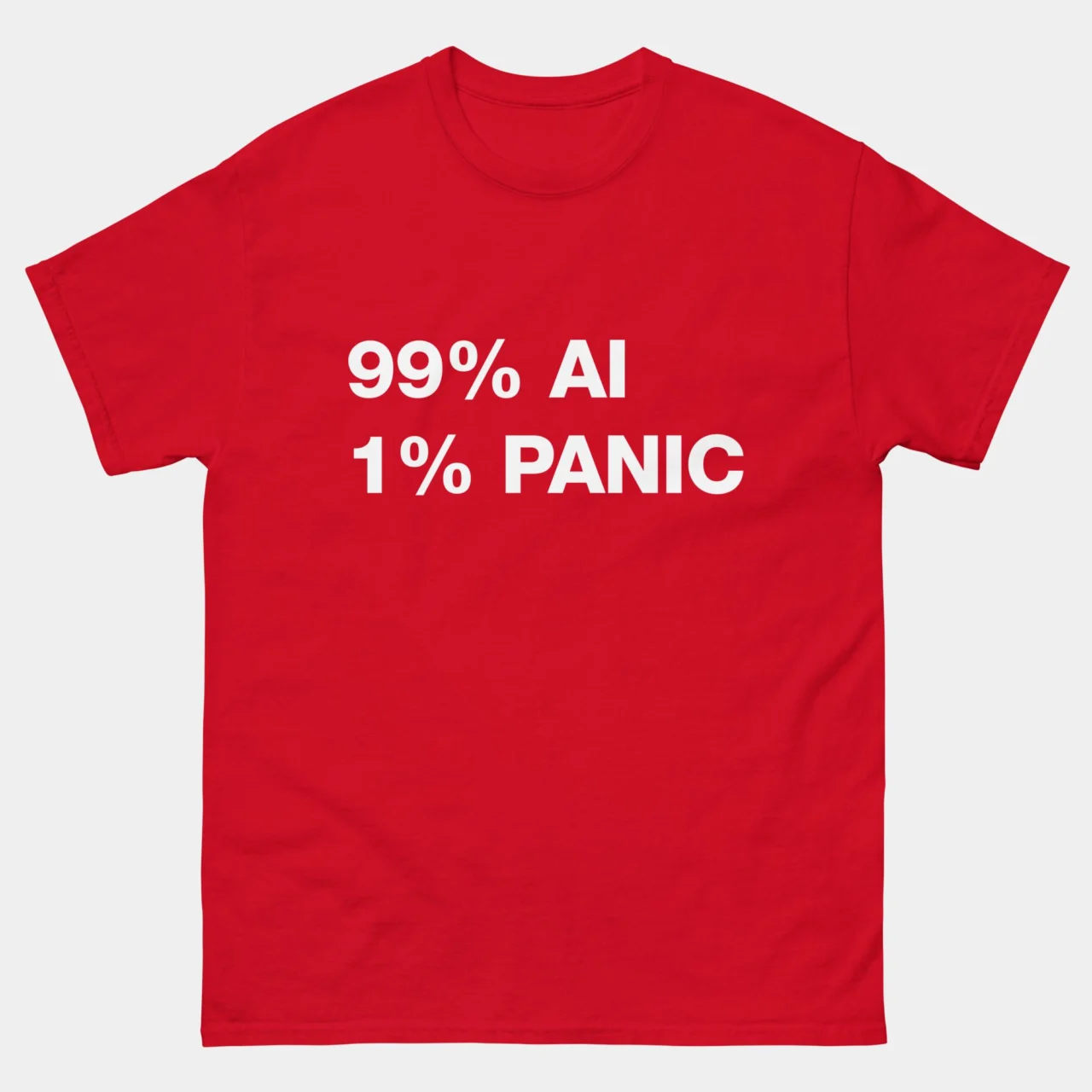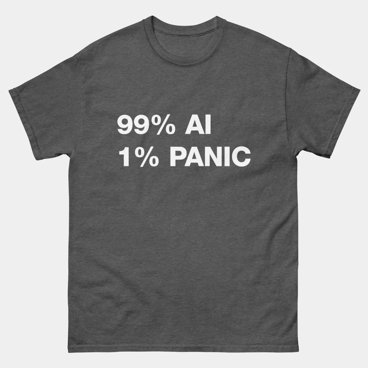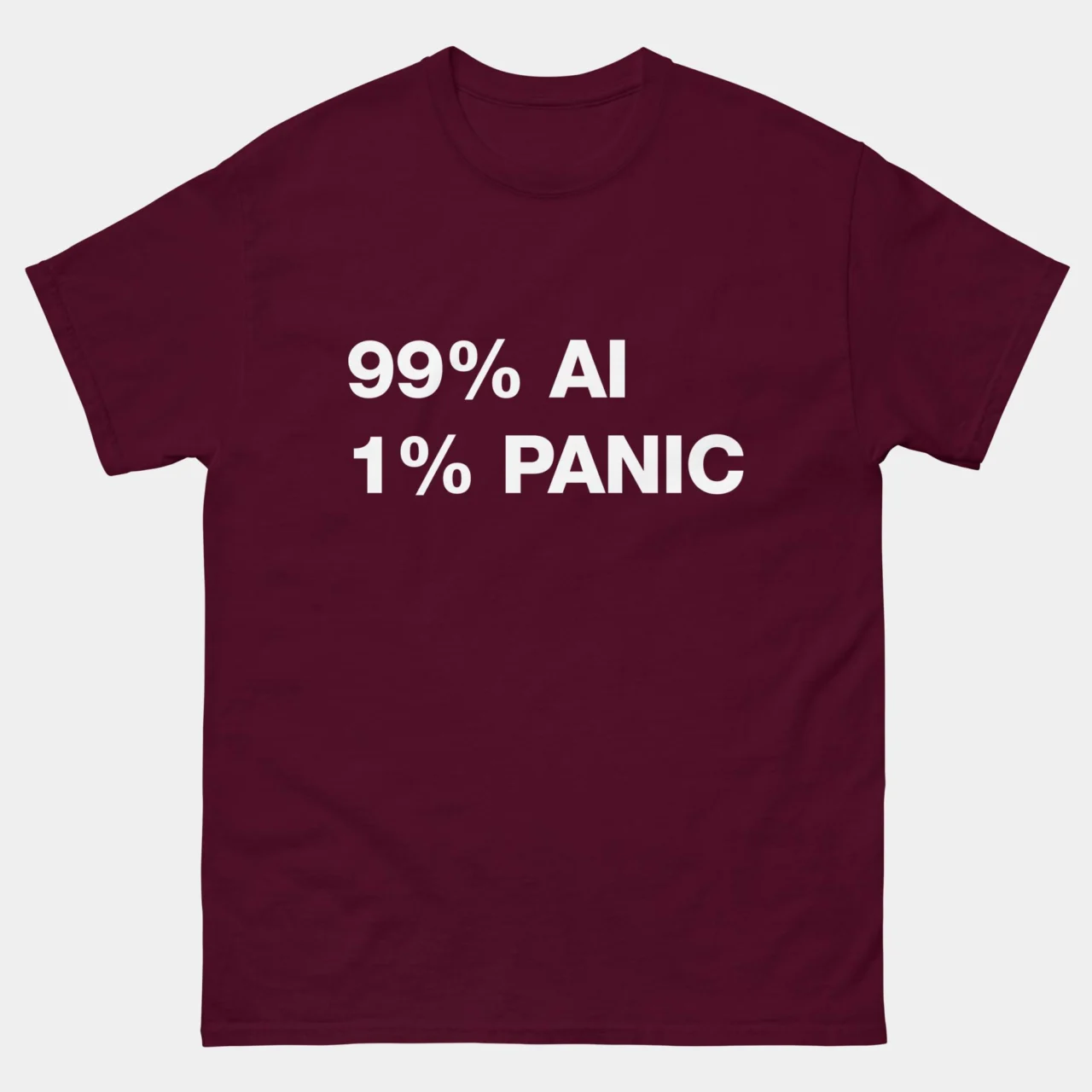 99 Percent AI 1 Percent Panic T-Shirt: Because no matter how smart AI gets, there’s always that little bit of fear that it might break everything. If you work in machine learning, AI engineering, or software automation, this tee is for you!