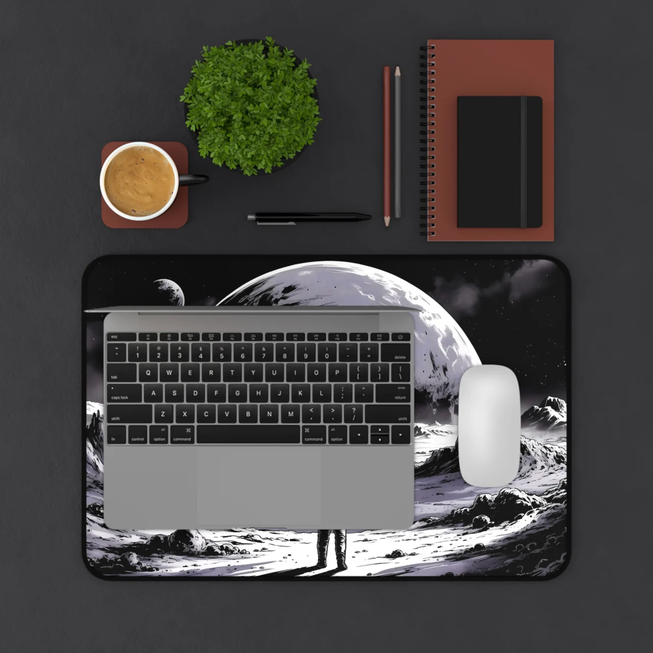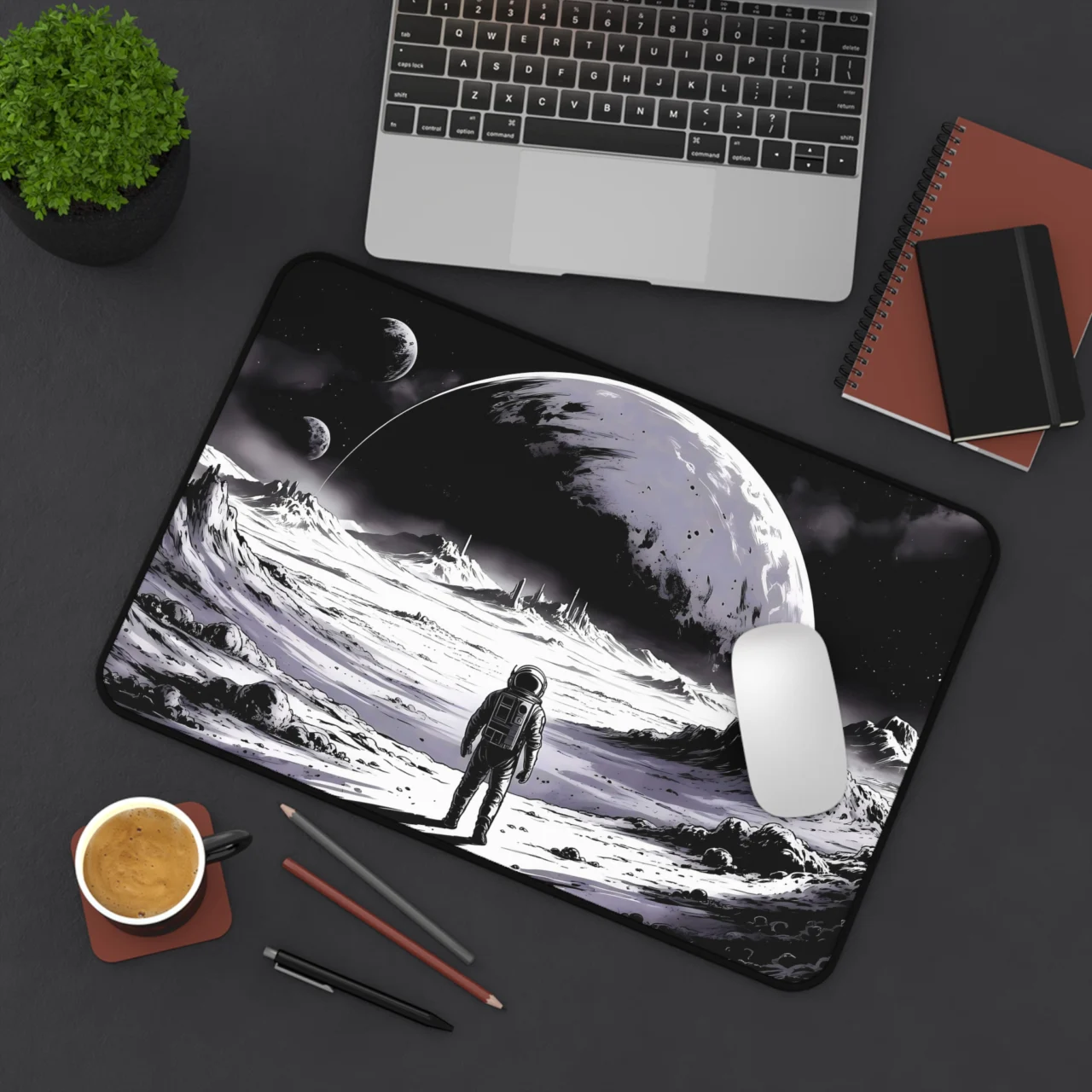 Explore the final frontier from your desktop. Step onto the lunar surface every time you sit down to work or play. This stunning, high-contrast Astronaut Moonscape Desk Mat captures the awe of space exploration in a sleek, artistic style that elevates any setup.