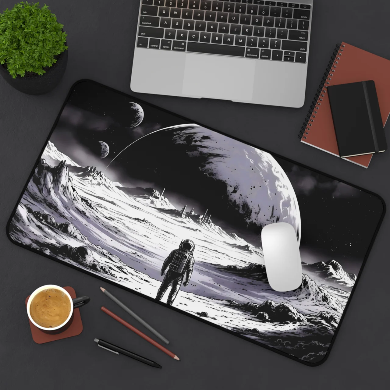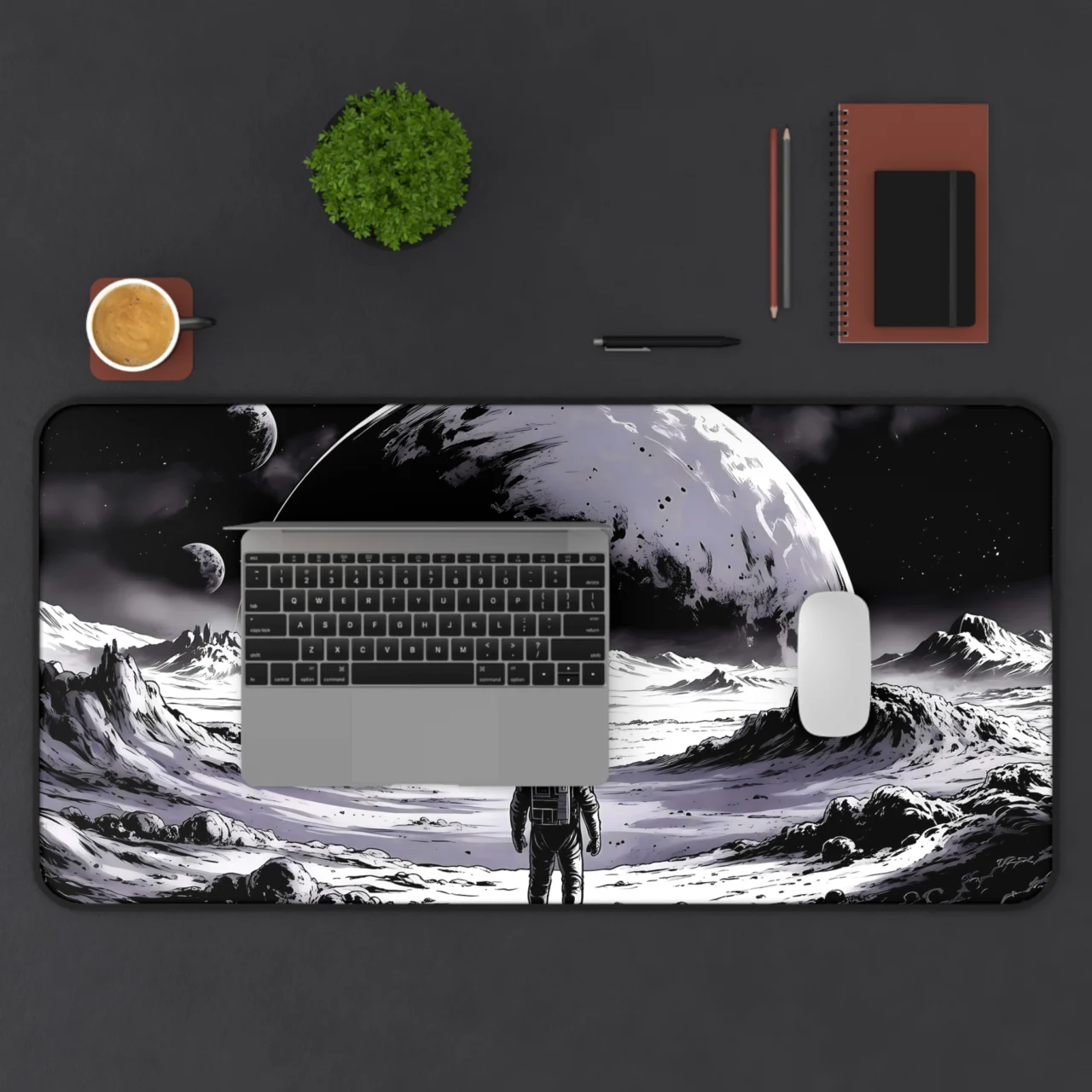 Astronaut Moonscape Desk Mat, Space Explorer Gaming Mouse Pad, Monochrome Astronaut Desk Mat, Lunar Landscape Space Mousepad, Sci-Fi Moon Surface Desk Pad, Large Extended Gaming Mat, Minimalist Space Decor