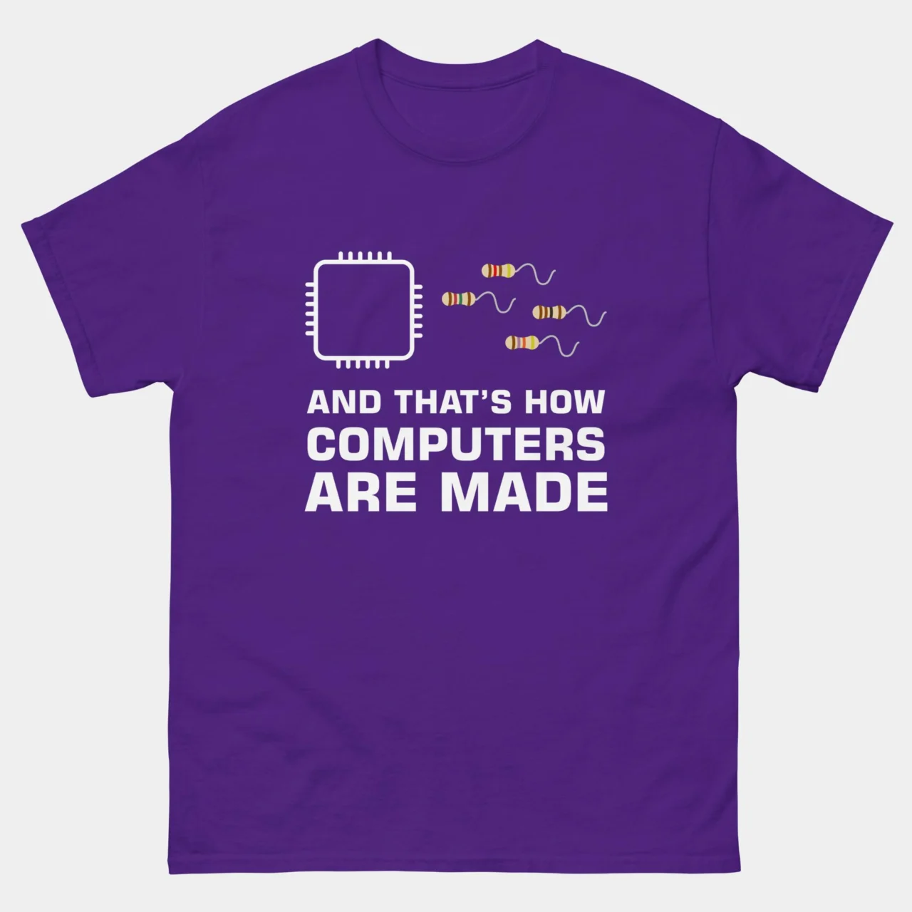 Buy Chip Resistor Funny Computer Engineer T-Shirt. A clever geek joke brought to life, resistors swimming like spermatozoa towards a CPU. This Chip Resistor funny computer engineer tee is perfect for engineers, programmers, tech nerds, and science jokesters who love witty circuit humor.