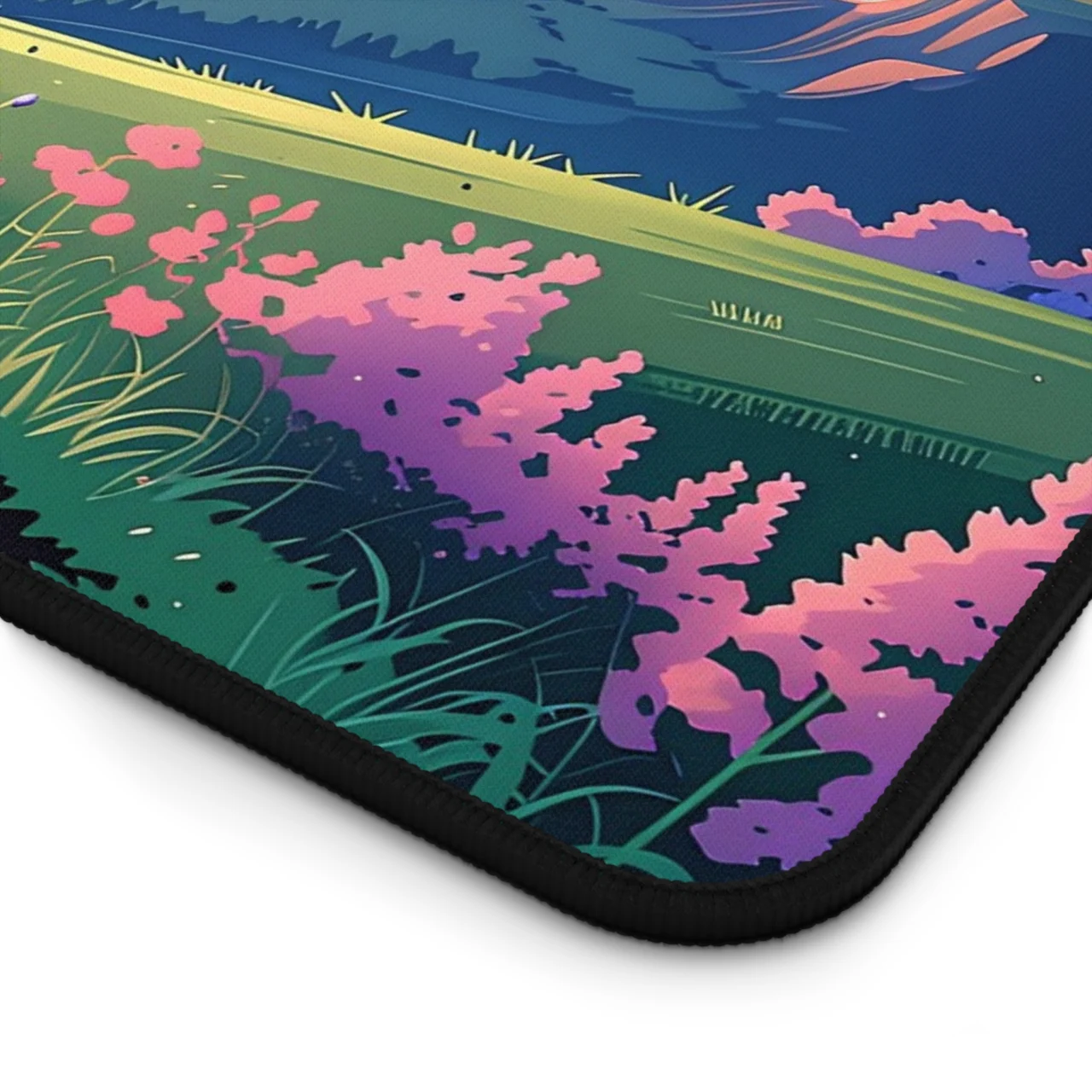 • Vibrant Pastel Palette: A beautiful blend of soft purples, pinks, and oranges in the sky contrasts with the rich greens and pink wildflowers of the meadow, creating a calming visual for high-stress workdays.