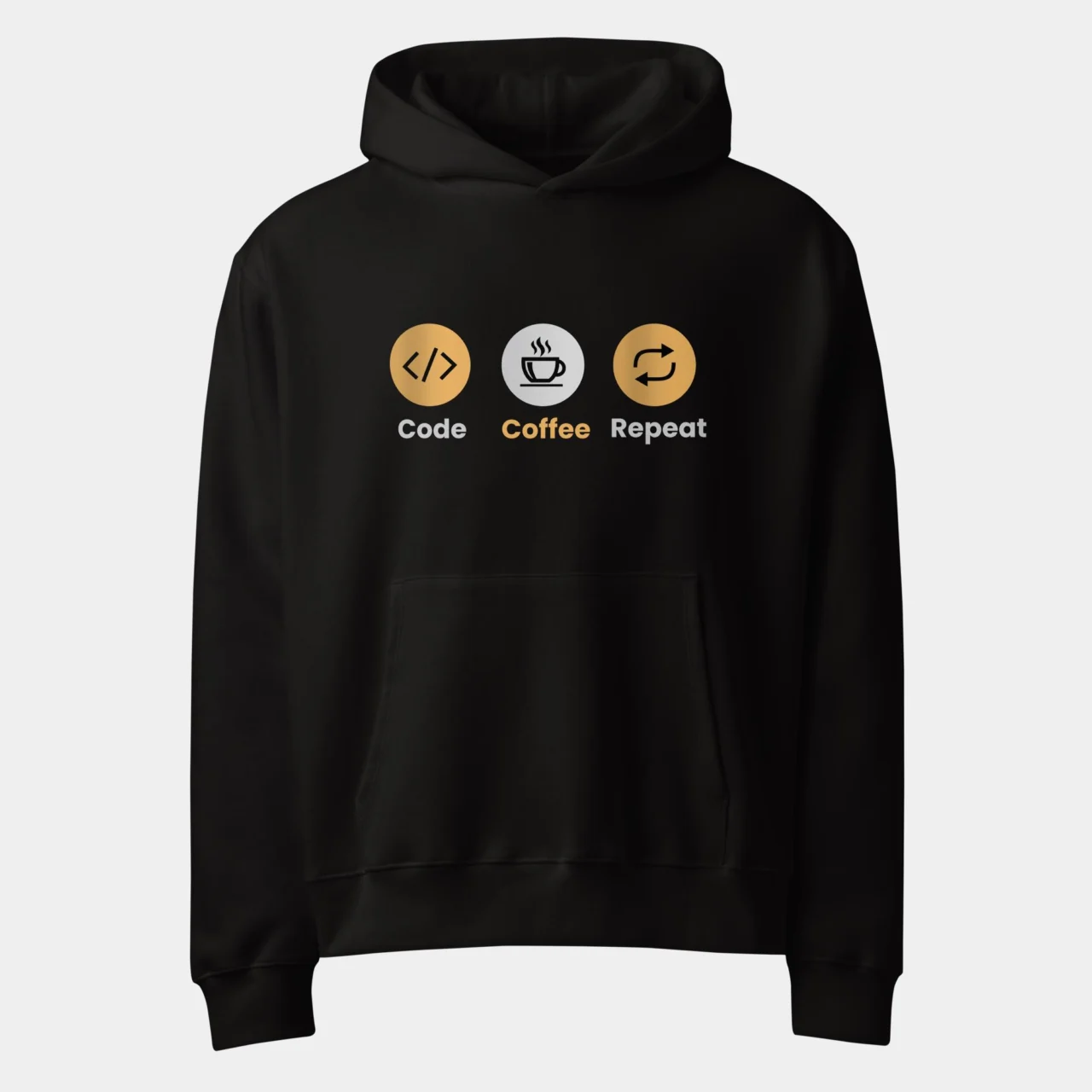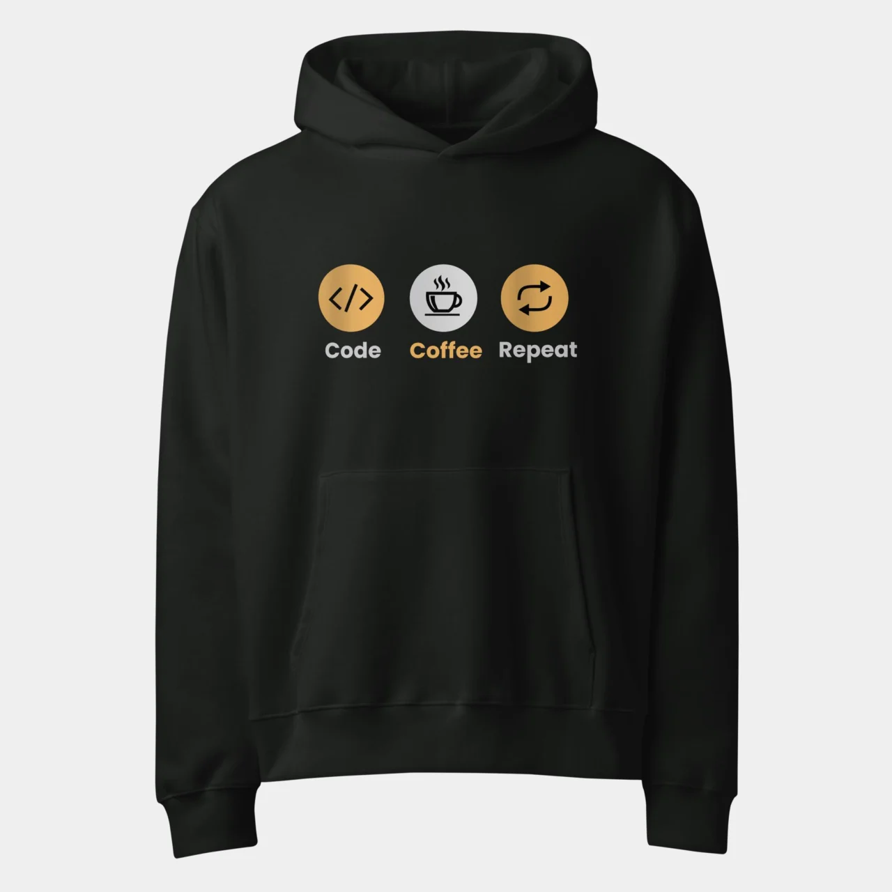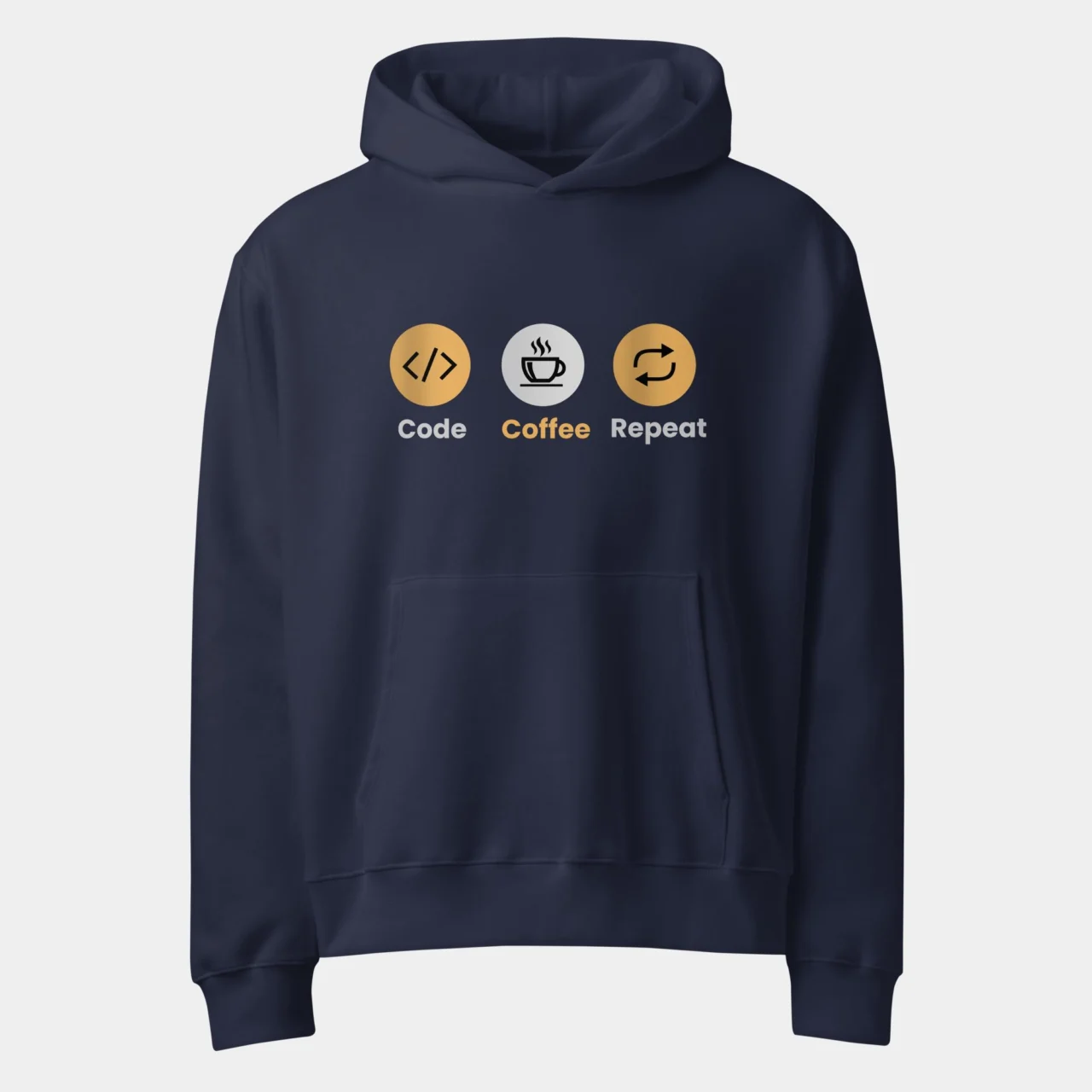 Code Coffee Repeat Oversized Hoodie – Funny Programmer Life Pullover – Computer Technology STEM Gift – Developer Coding Humor – Heavyweight Fleece