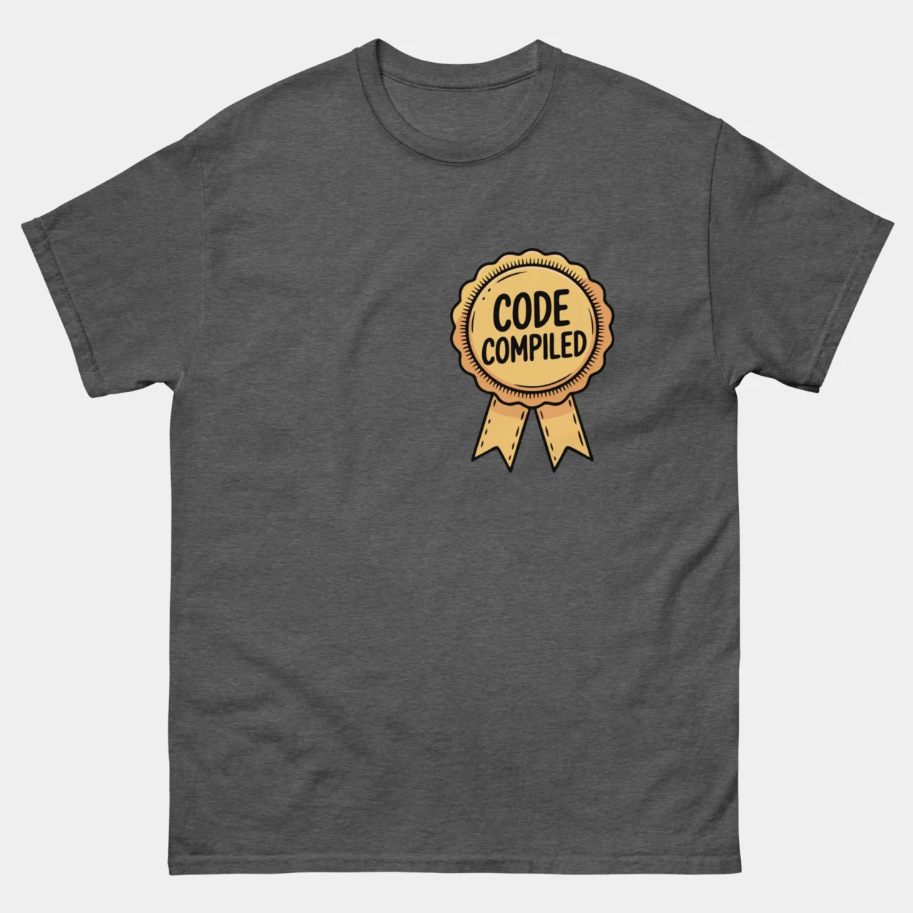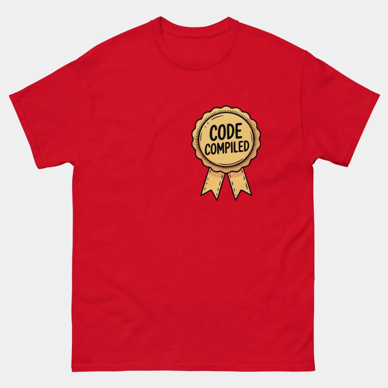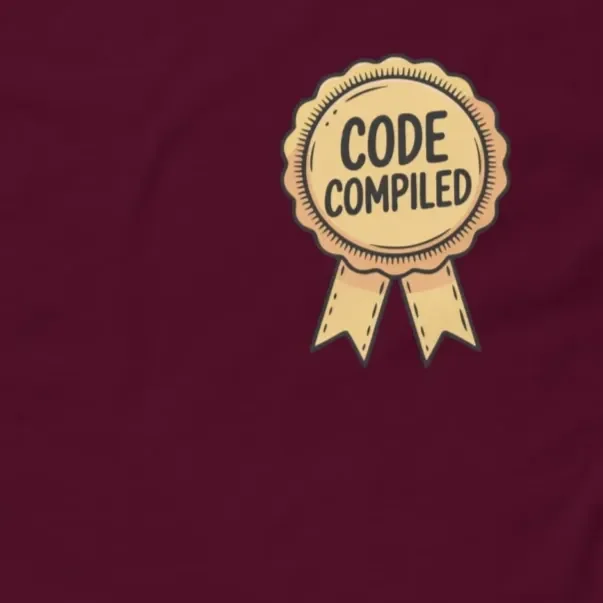 Because sometimes, just getting it to run is a major achievement. This sophisticated maroon Code Compiled Funny Programmer T-shirt features a classic gold-style ribbon badge on the chest, marking a victory every coder understands:
