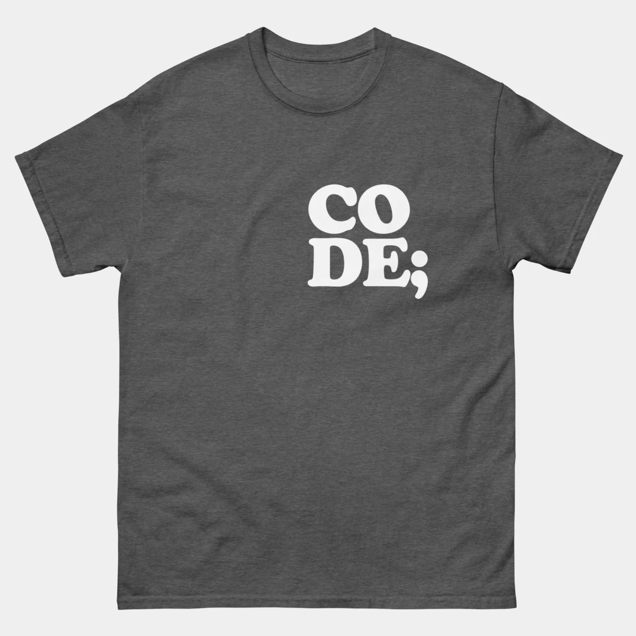 Syntax as Style: Featuring the word “CODE” split across two lines and finished with a classic semi-colon, this design is a nod to the essential punctuation that keeps the digital world running.