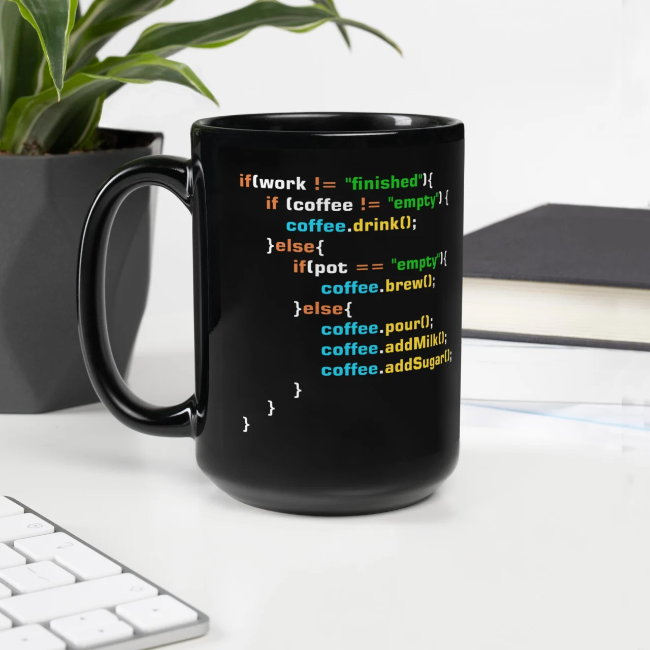 Coffee Code Logic Mug – Funny Programmer Coffee Cup – “If Work Not Finished” Coding Humor – Software Developer Debugging Drinkware – Black Glossy Ceramic