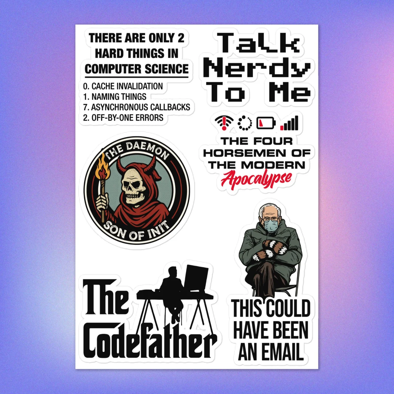 #ComputerScienceSticker #Codefather #TalkNerdyToMe #DaemonSonOfInit #HardThingsInCS #ProgrammerPopCulture #GeekLaptopDecals #FourHorsemenOfApocalypse #EmailHumor #DevOps