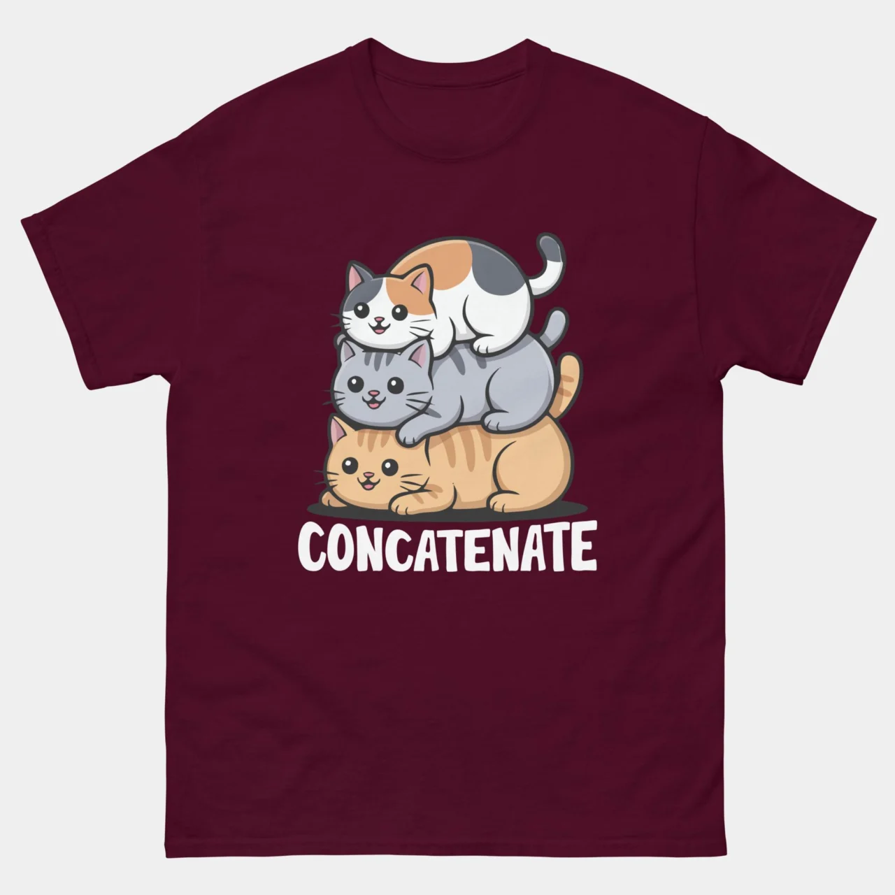 The Ultimate Literal Pun: This design features three chubby, smiling cats stacked directly on top of one another—a calico on top, a gray tabby in the middle, and a large ginger cat on the bottom—perfectly illustrating the concept of “concatenation”.