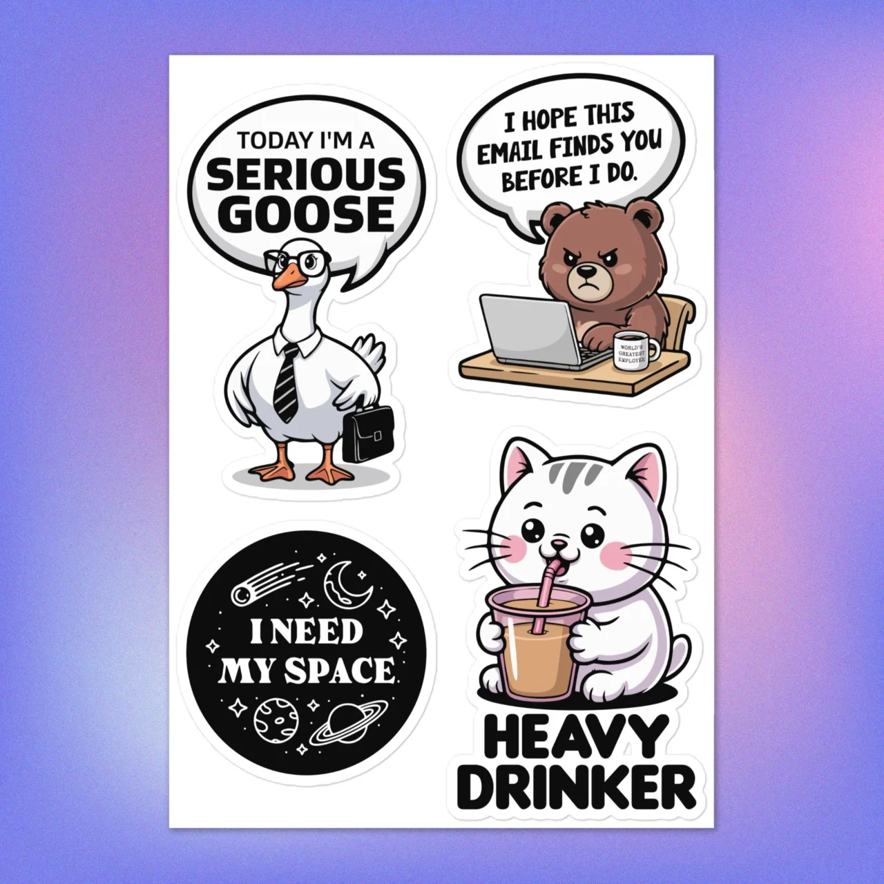 Highlights: Features the classic “I NEED MY SPACE” galaxy graphic (for every exhausted introvert) and the “HEAVY DRINKER” cat (fueled by coffee or boba).