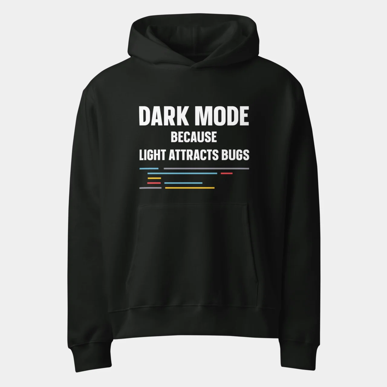 Dark Mode Because Light Attracts Bugs Oversized Hoodie – Funny Programmer Coder Pullover – Software Developer Tech Humor Gift – Heavyweight Fleece