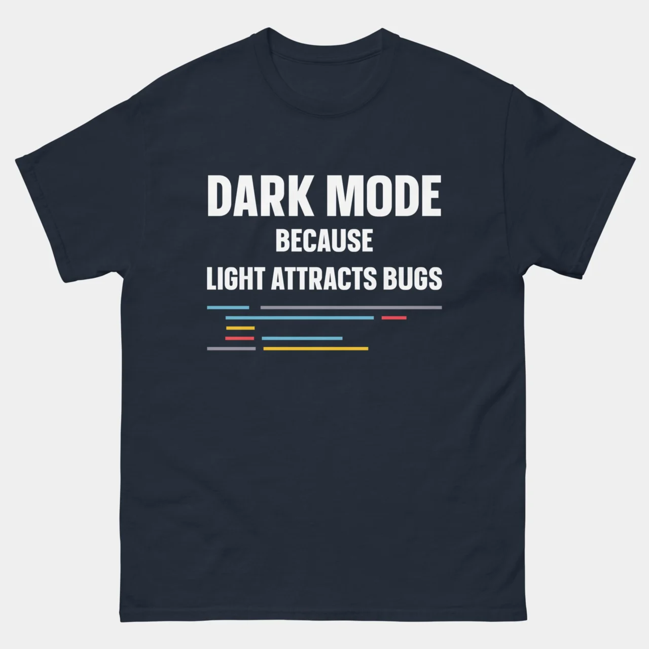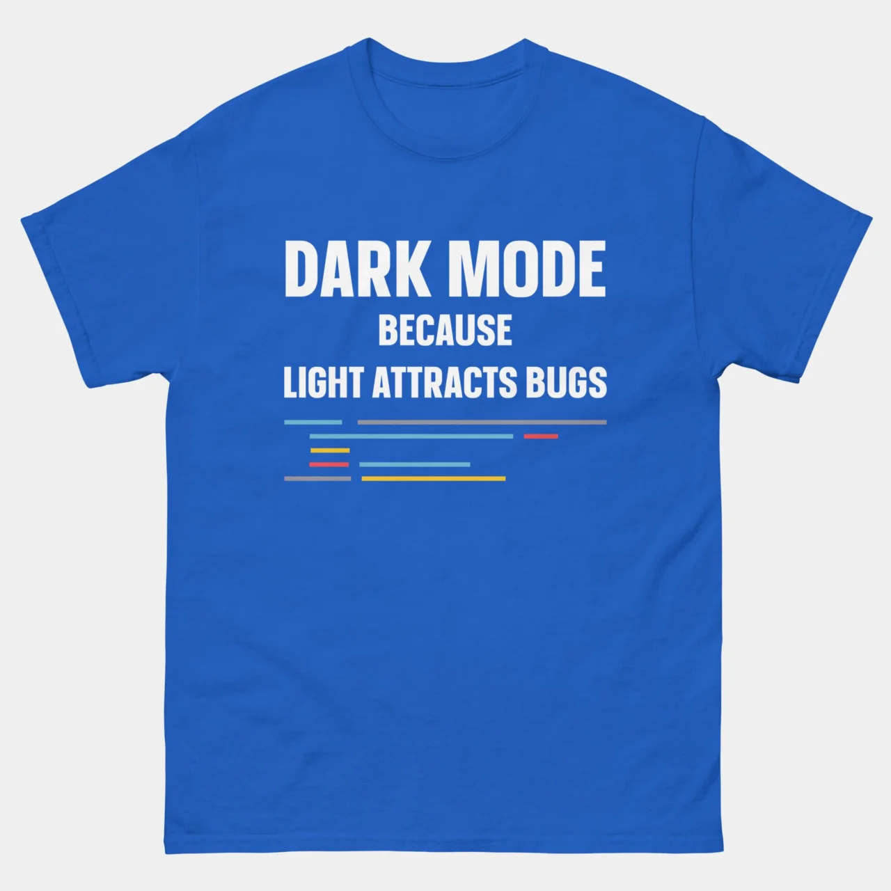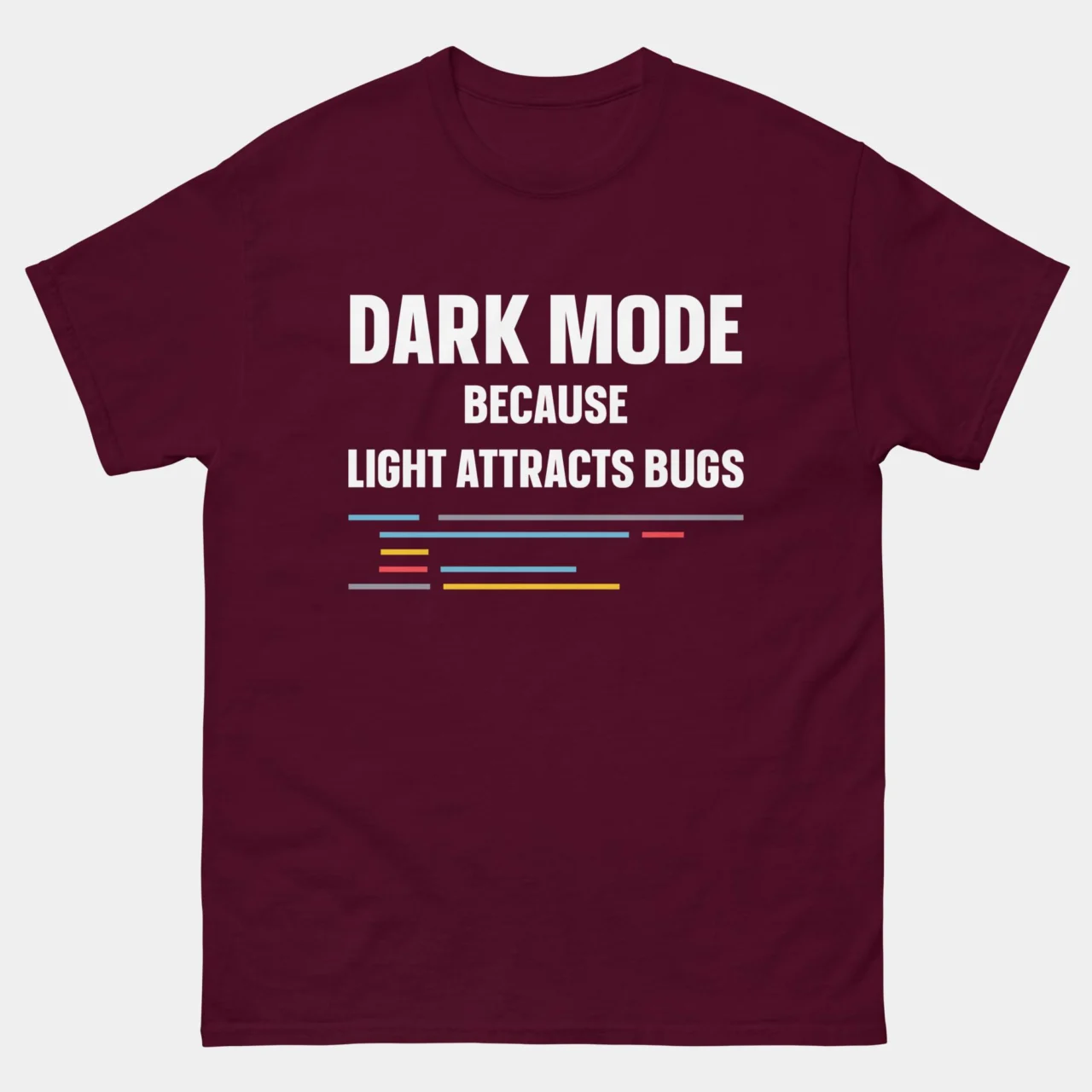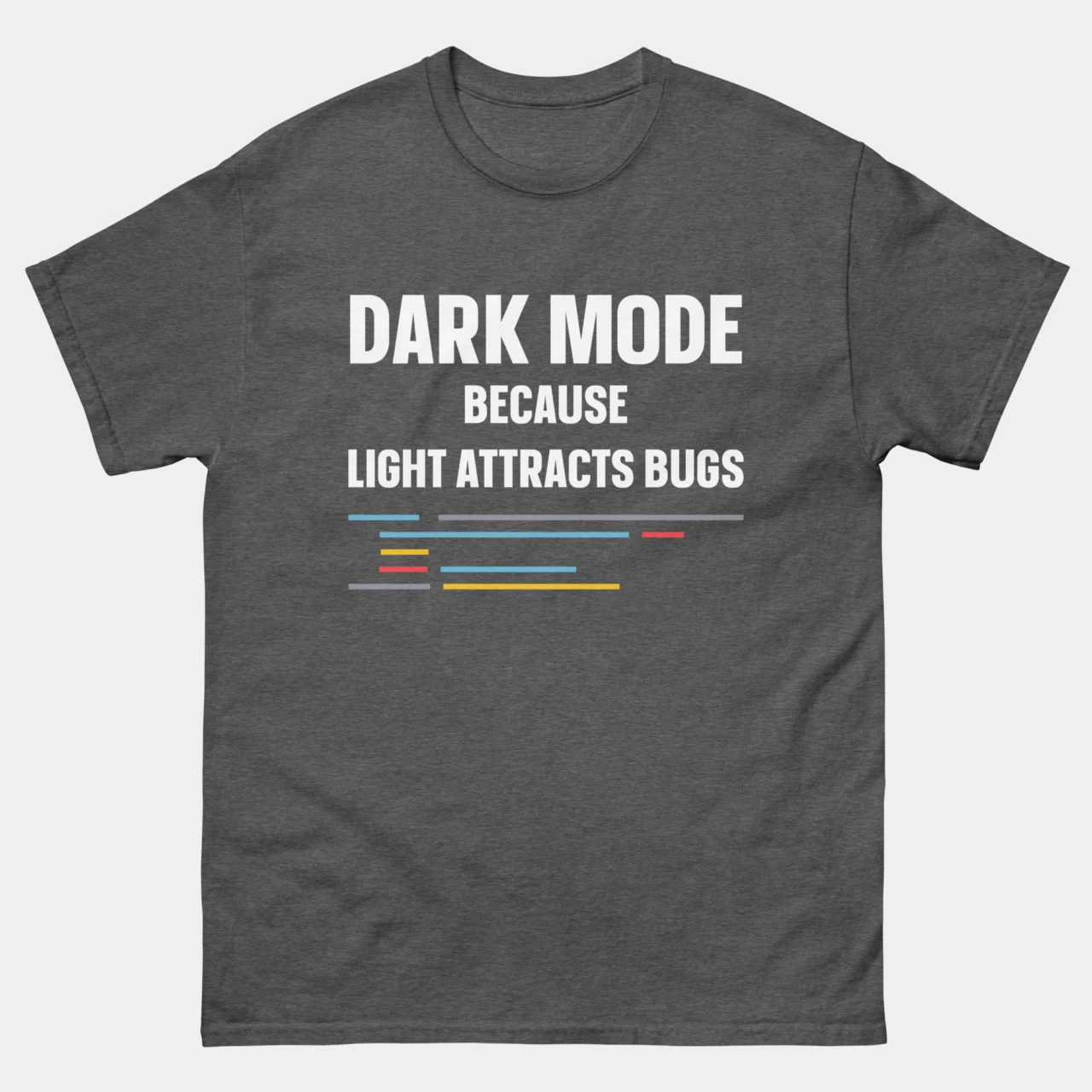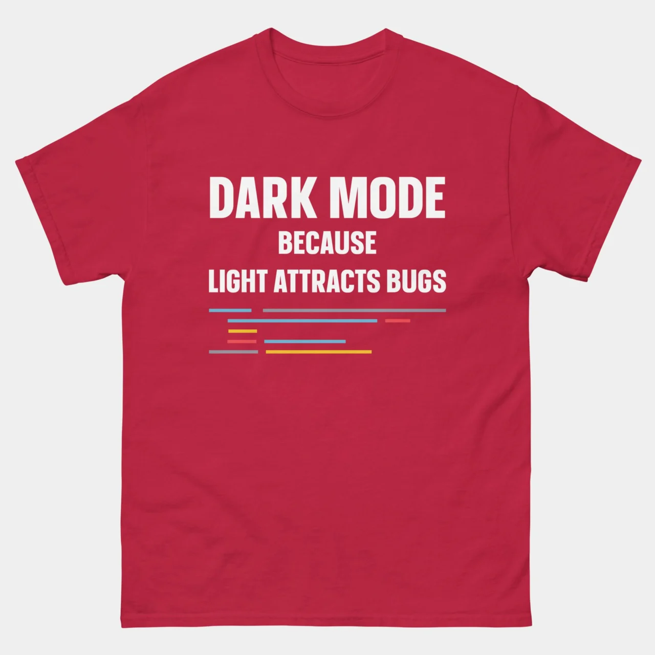 Dark Mode Because Light Attracts Bugs T-Shirt! This shirt is designed for geeky developers, programmers, and coders who appreciate the functionality and aesthetics of dark mode in software applications. With a funny and geeky design, it features the text “Dark Mode Because Light Attracts Bugs,” highlighting the play on words and the practicality of using dark mode to minimize distractions and potential bugs.