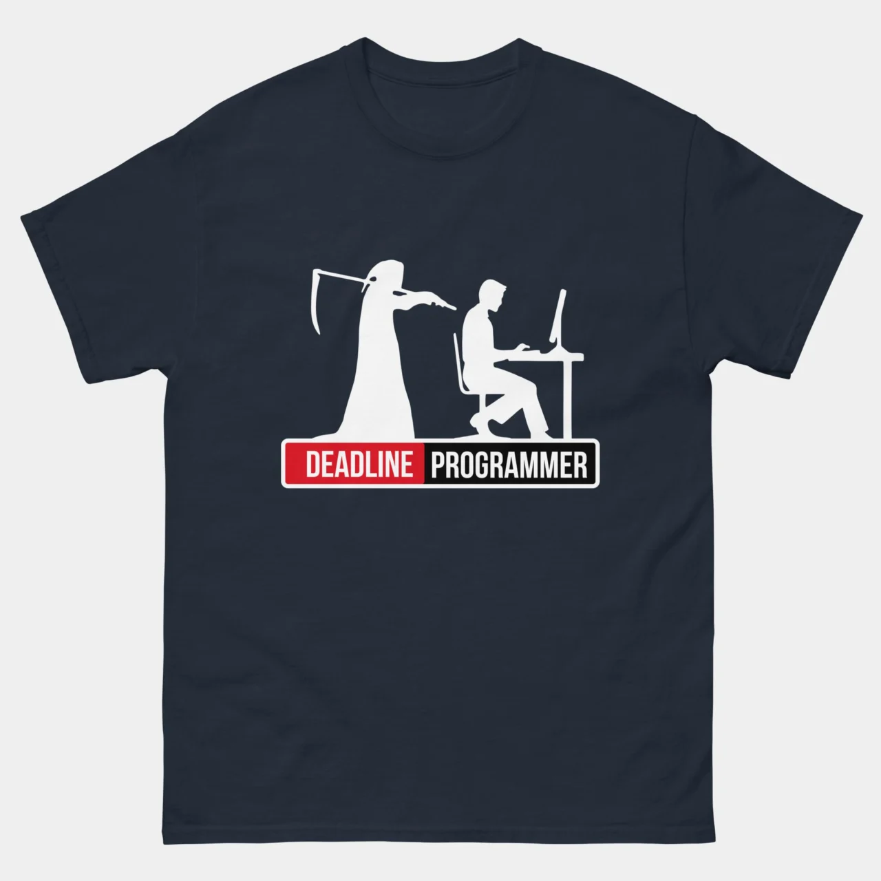 Deadline Programmer Funny T-Shirt: When deadlines come knocking, it’s time to code like your life depends on it! This funny programmer t-shirt features the Grim Reaper looming over a deadline, making it a perfect gift for software developers, IT professionals, and coding enthusiasts who have survived crunch time.
