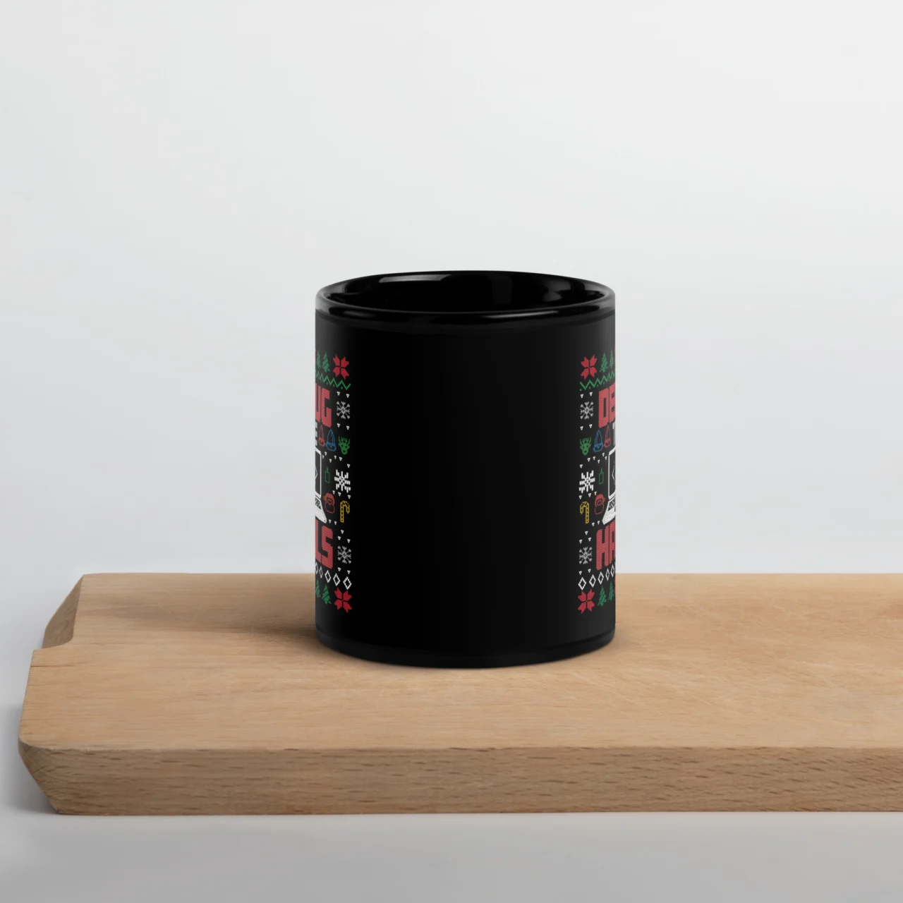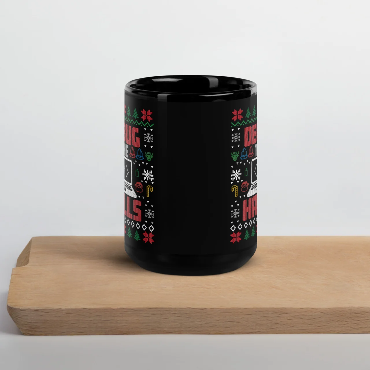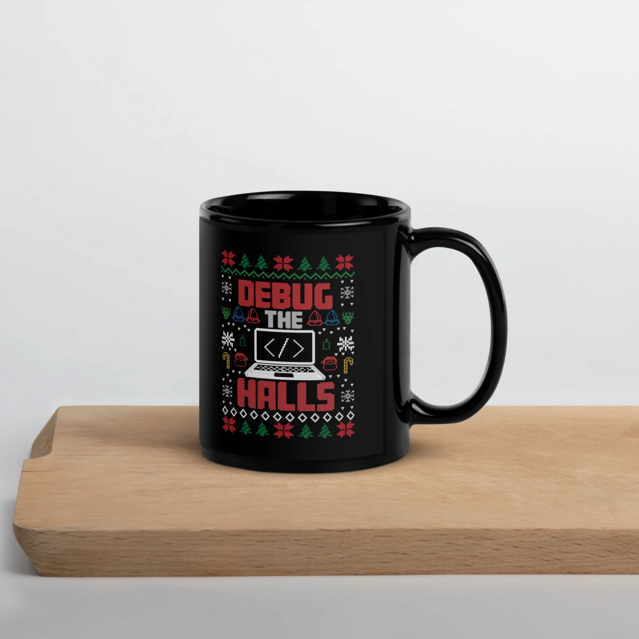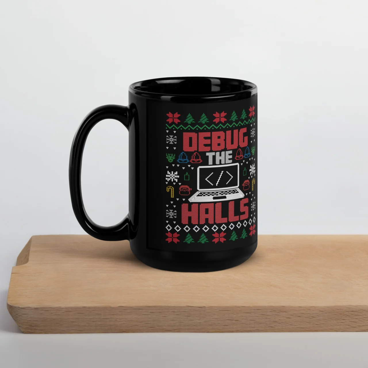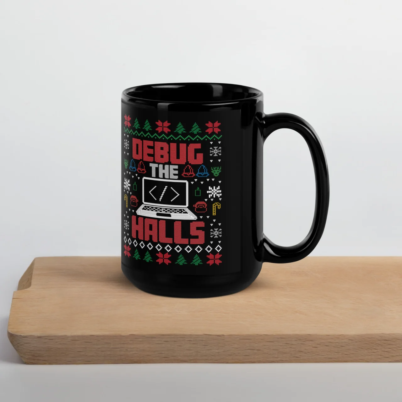 Deck the halls with bugs and bad code… just kidding! This black ceramic mug features a festive “Ugly Christmas Sweater” pattern surrounding the pun: “DEBUG THE HALLS“.