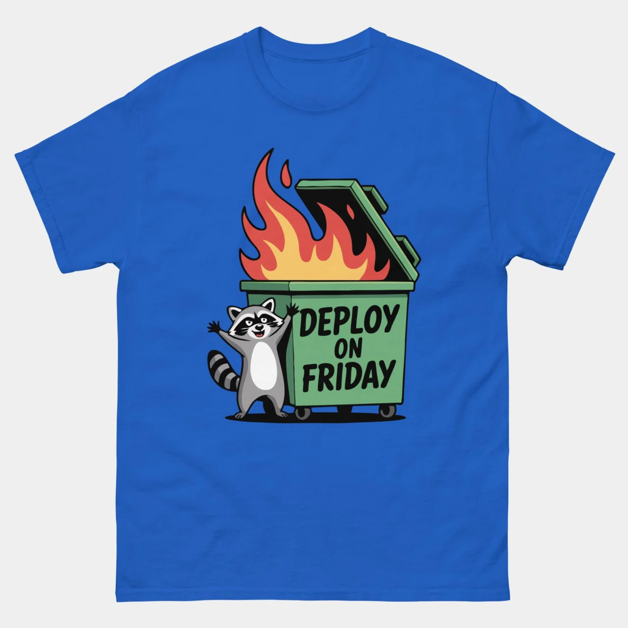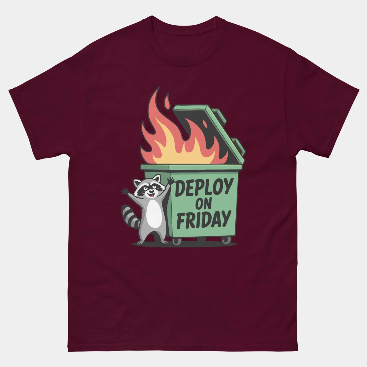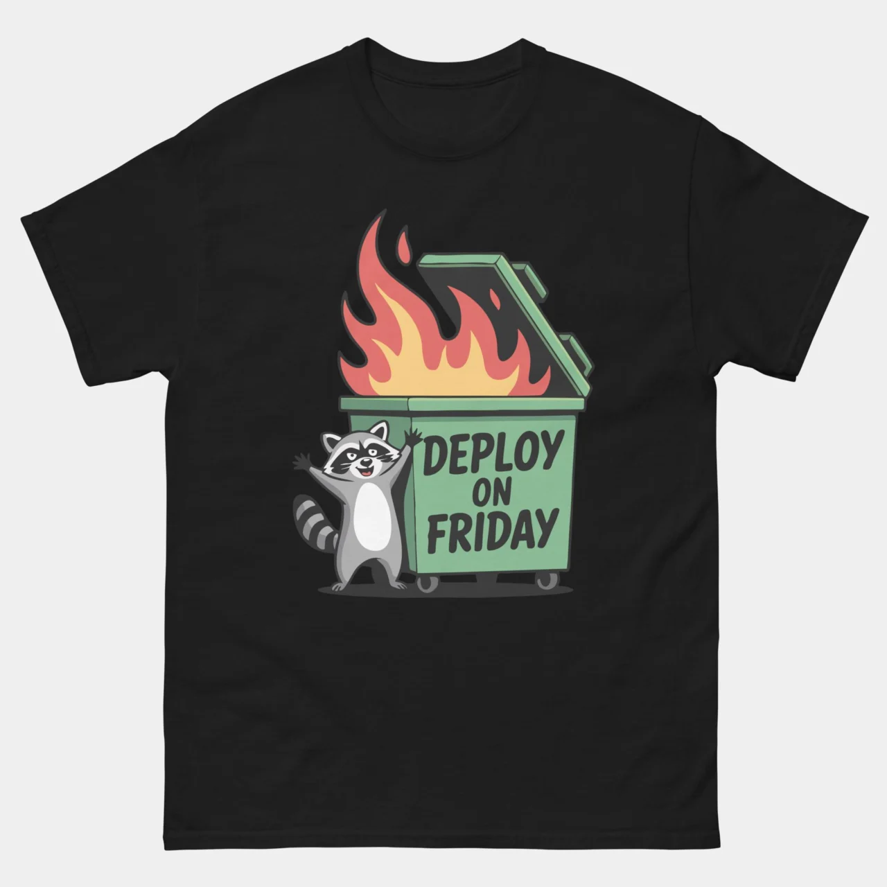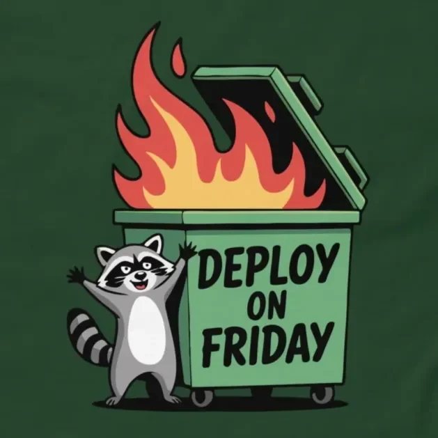 #DeployOnFriday #DumpsterFire #RaccoonLife #DevOpsHumor #ProgrammerProblems #TechFashion #SoftwareEngineering #CodeChaos #SysAdminLife #TrashPanda