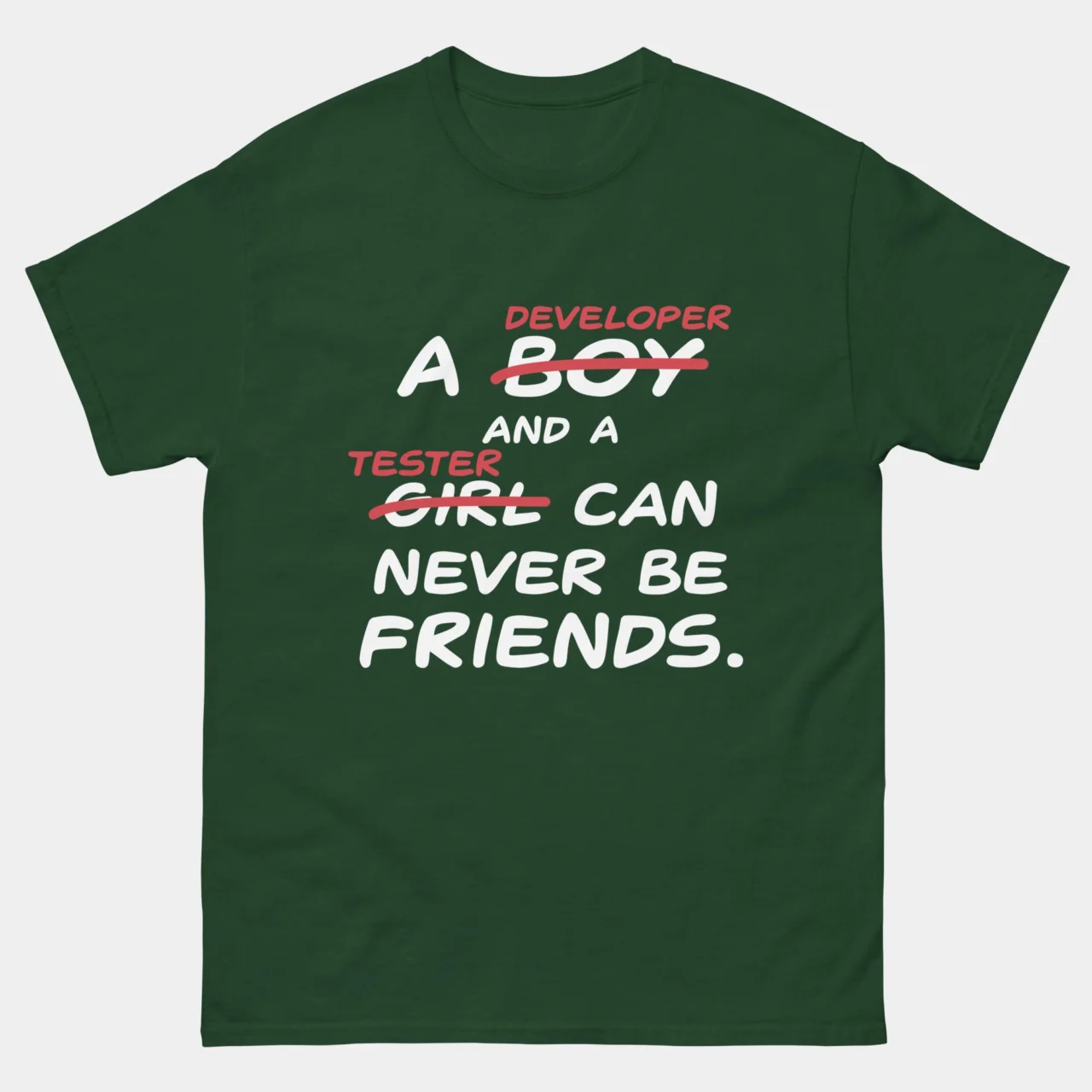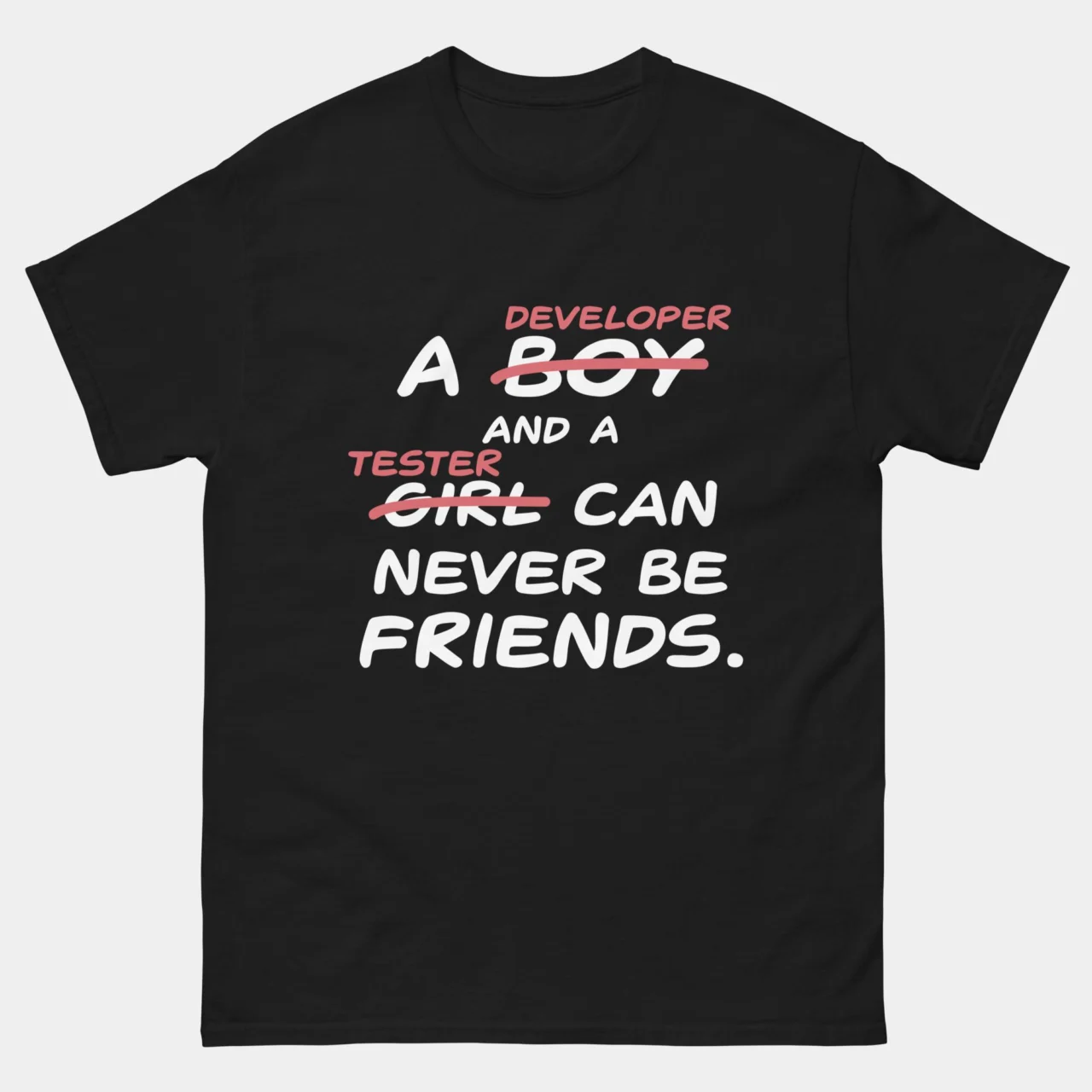 A Clever “Code Edit” Pun: The design takes a classic romantic cliché and “debugs” it by crossing out “BOY” and “GIRL” in red and replacing them with “DEVELOPER” and “TESTER“.