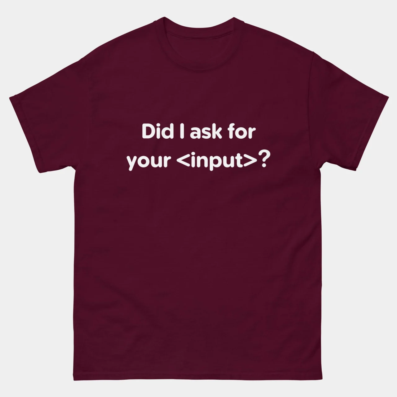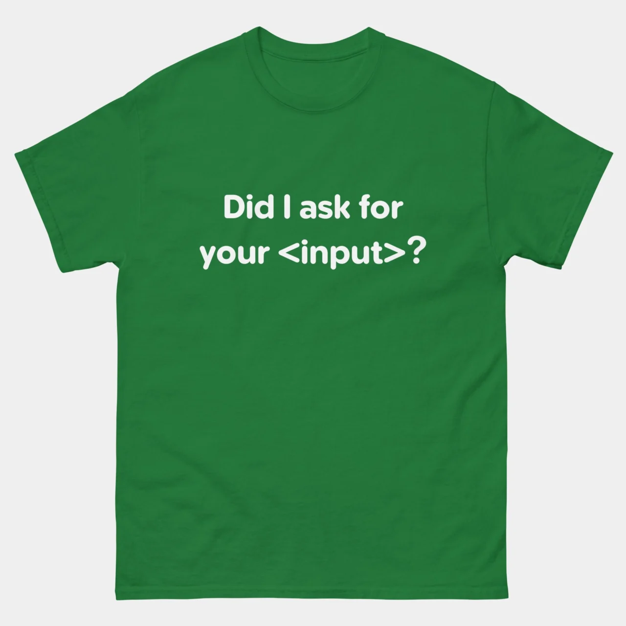 #DidIAaskForYourInput #HTMLHumor #FrontendLife #FunnyDevShirt #ProgrammerPuns