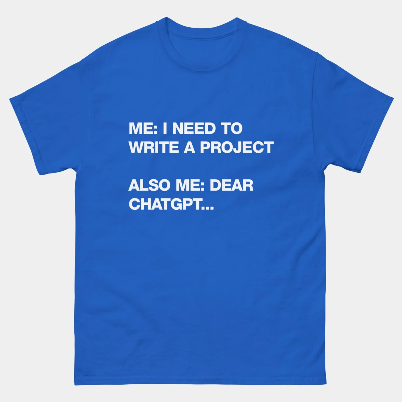 Funny AI Developer T-Shirt: “I need to write a project, also me: Dear ChatGPT.” If you’re a developer, student, or programmer who relies on AI for inspiration (or full code blocks!), this funny AI programming t-shirt is perfect for you.