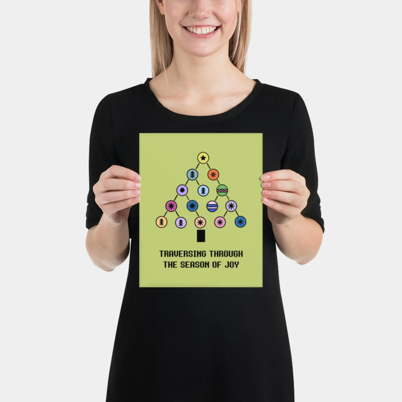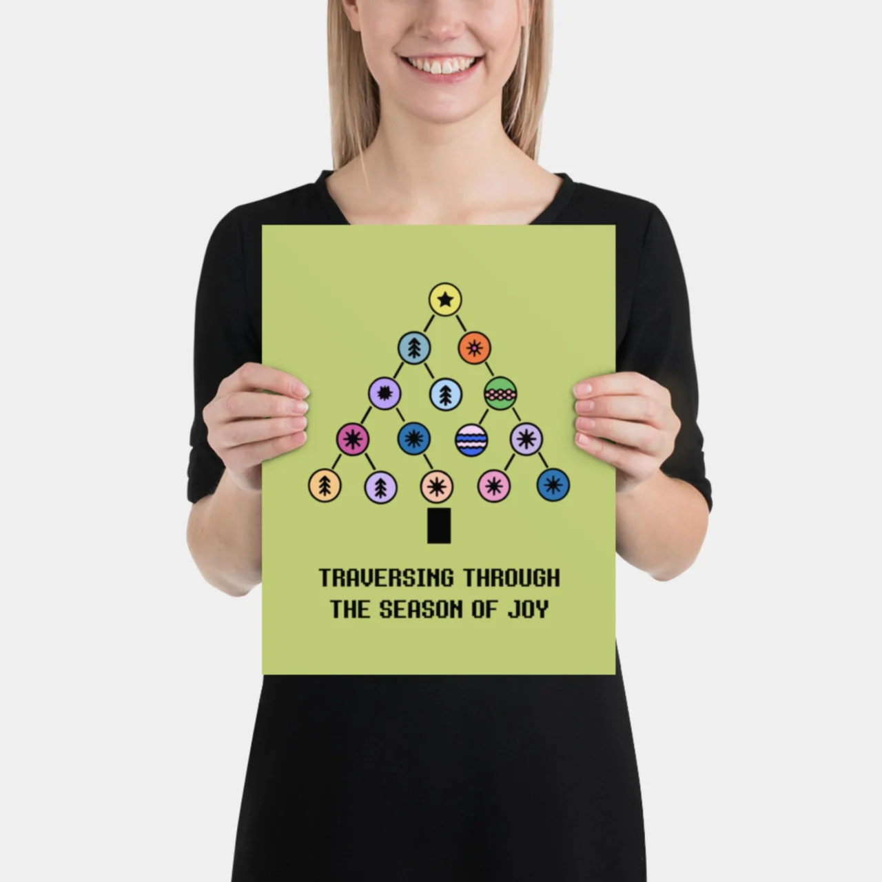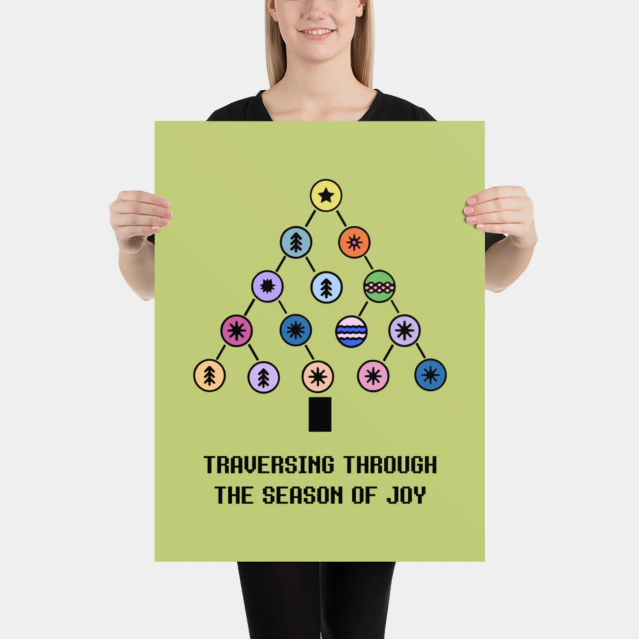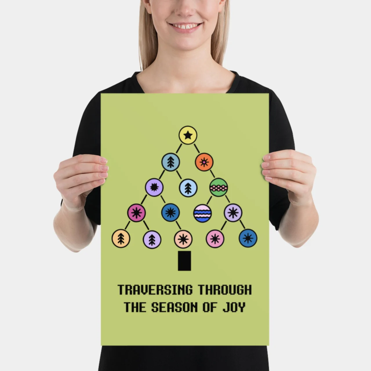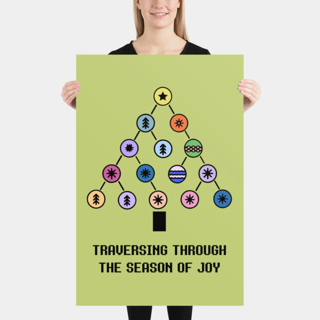 The perfect piece of Holiday Decor for the developer, engineer, or computer science student! This festive poster features a Binary Tree decorated as a Christmas tree, illustrating the classic concept of “Traversing Through the Season of Joy“.