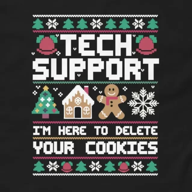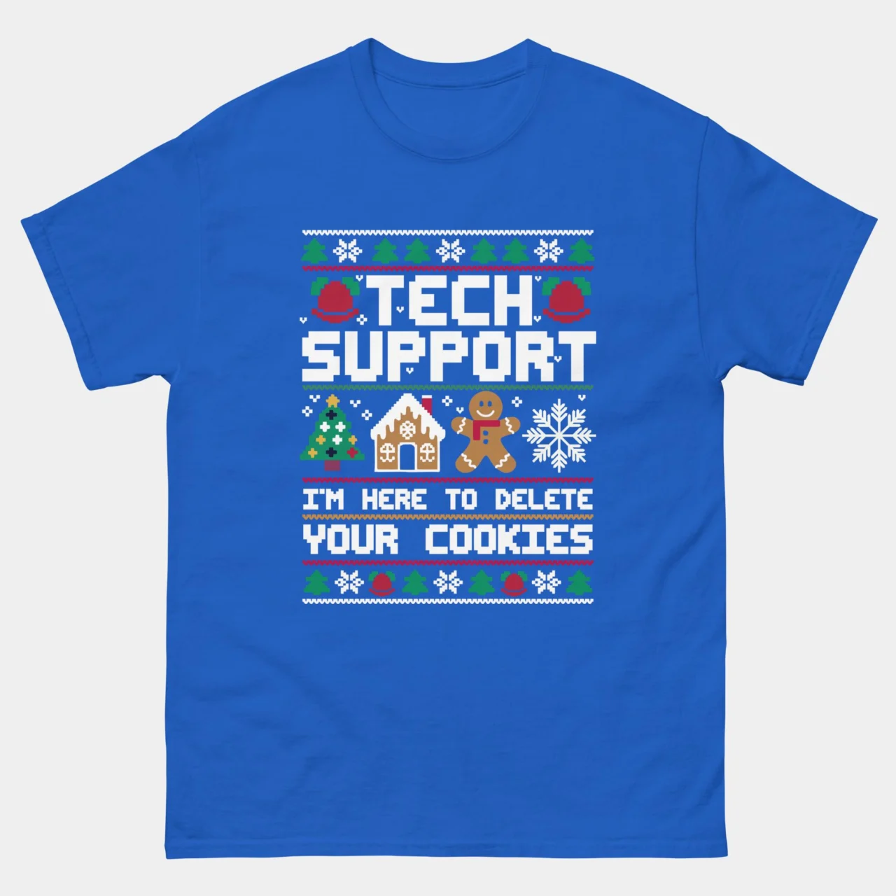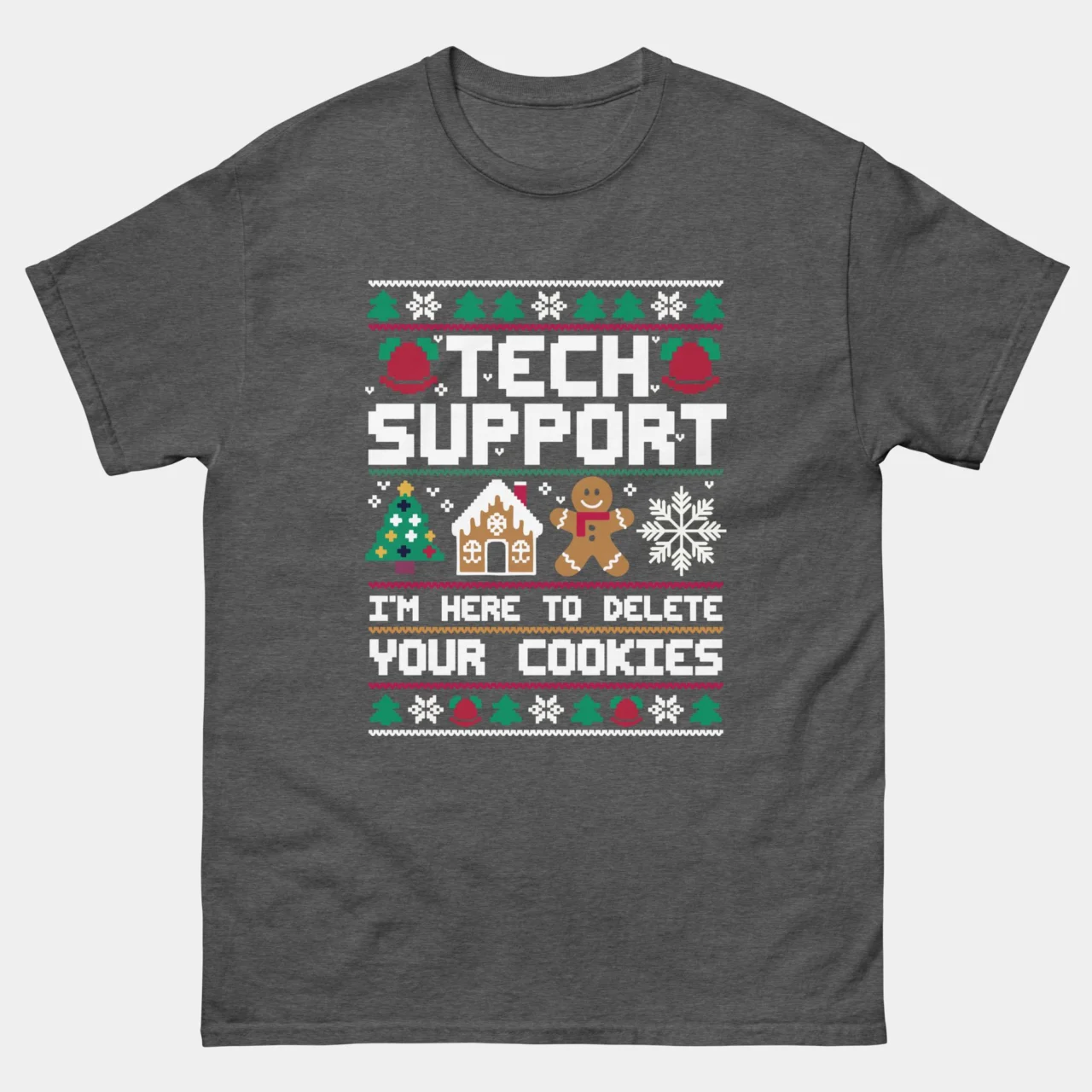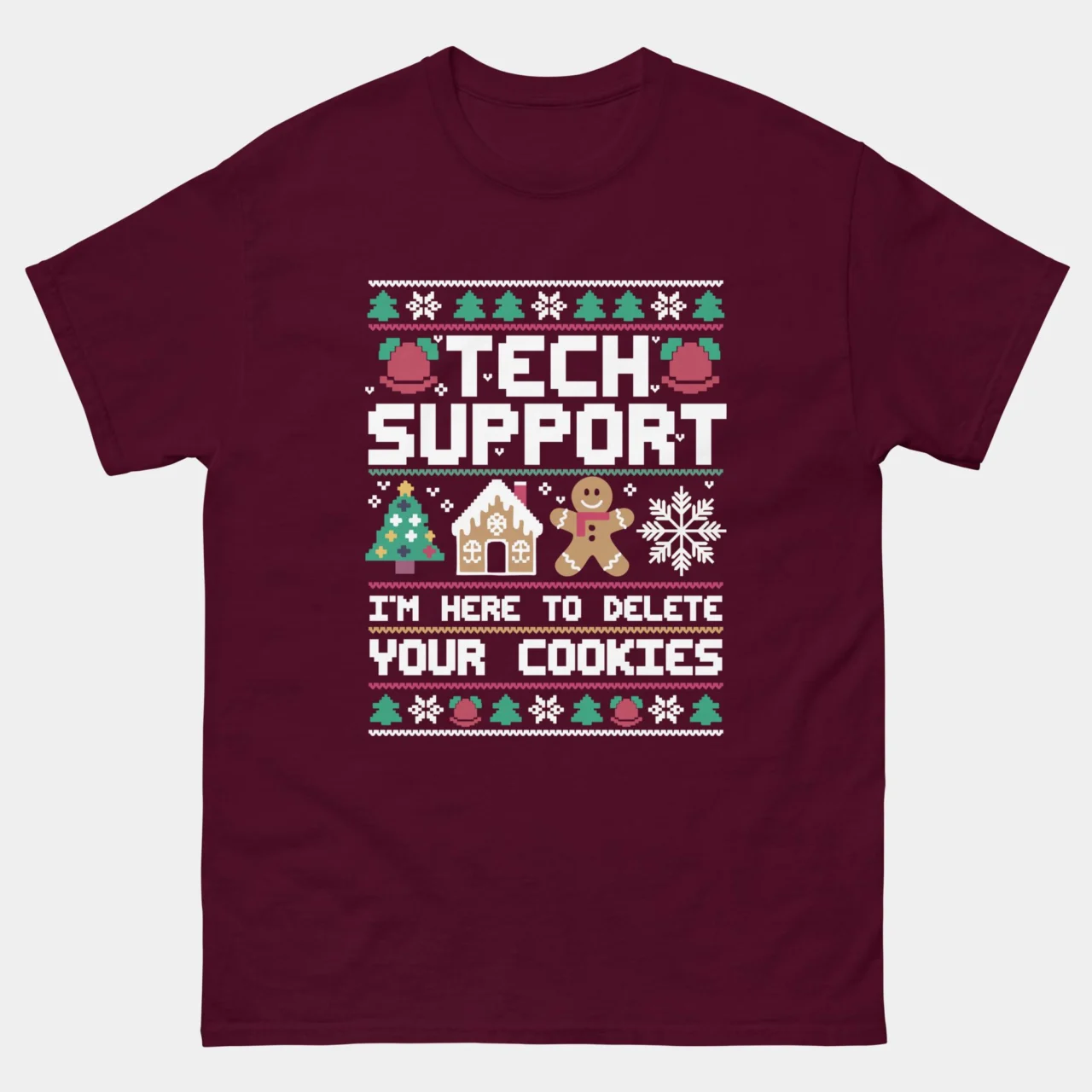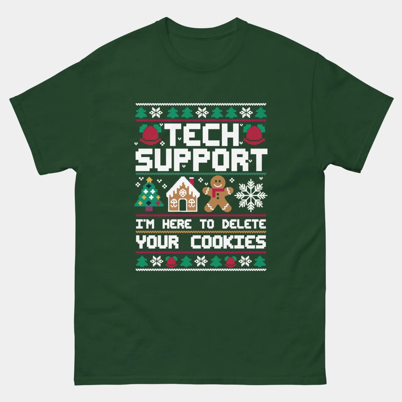 #TechSupportShirt #DeleteYourCookies #FunnyITGuy #UglySweaterTee #ProgrammerChristmas #TechHolidayGift #SecretSantaTech #WebDeveloperGift #CodingHumor #ChristmasApparel