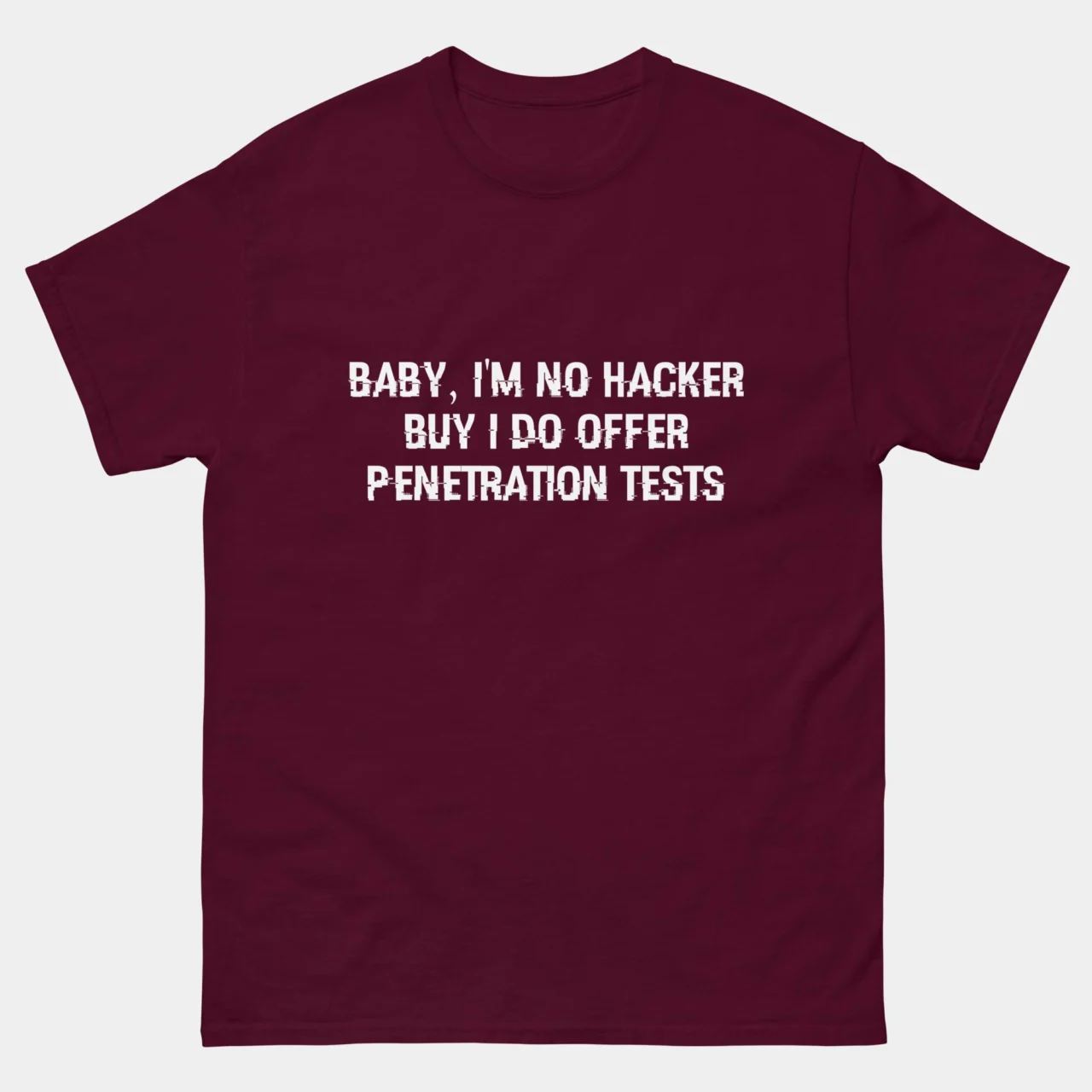 Funny Penetration Tester T-Shirt: “Baby, I’m no hacker, but I do offer penetration testing.” A funny cybersecurity pun for those who live and breathe ethical hacking. If you’re a penetration tester, security analyst, or white-hat hacker, this tee is for you!