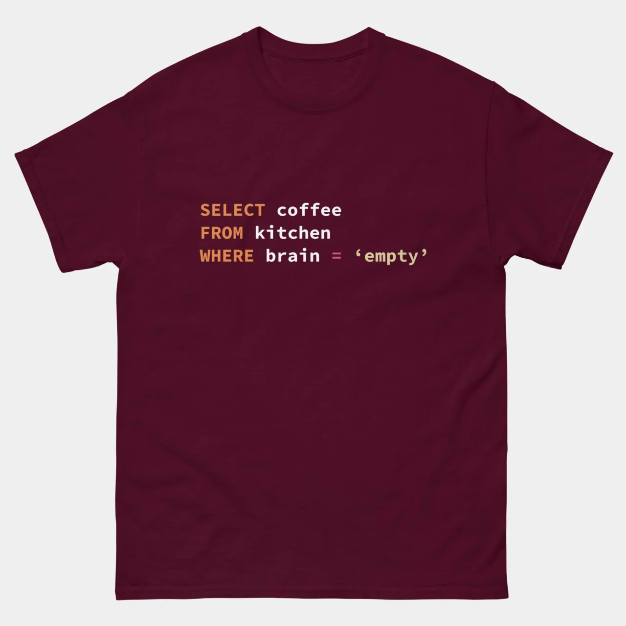Funny SQL Developer Shirt – SELECT coffee FROM kitchen WHERE brain = 'empty';