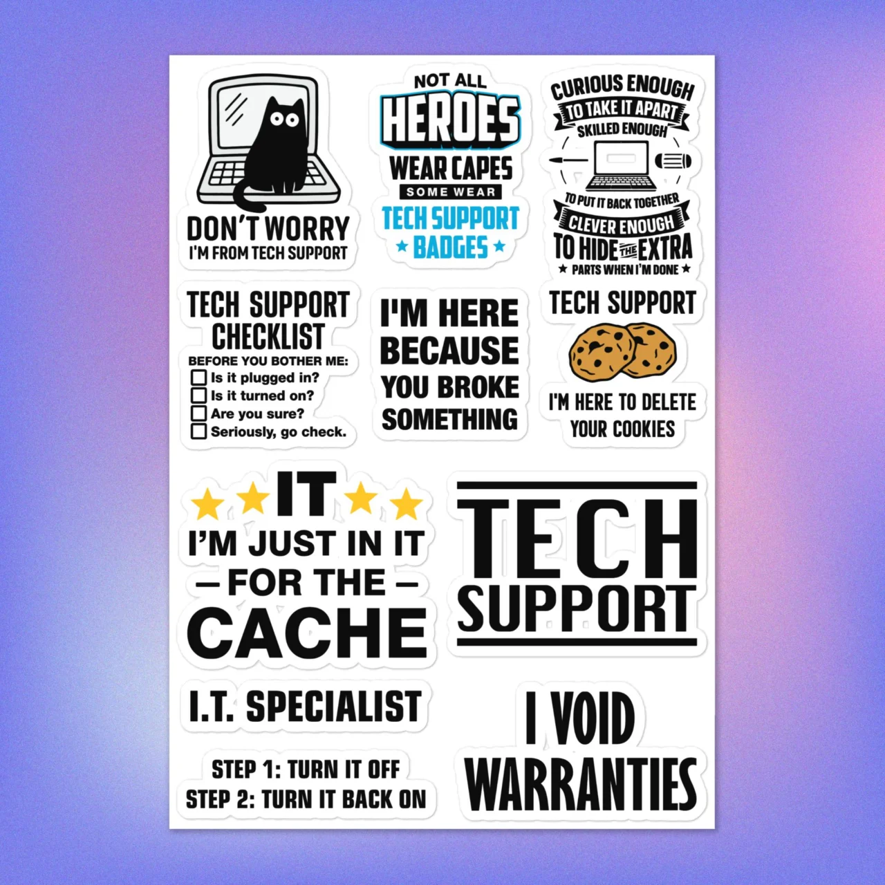 This sheet is packed with iconic tech humor, including: the beloved “Don’t Worry I’m From Tech Support Funny Cat on Computer,” the essential “Tech Support Checklist (Is It Plugged In?),” and the boastful “I Void Warranties.” You’ll also find the accurate description: “I’m Here Because You Broke Something.”