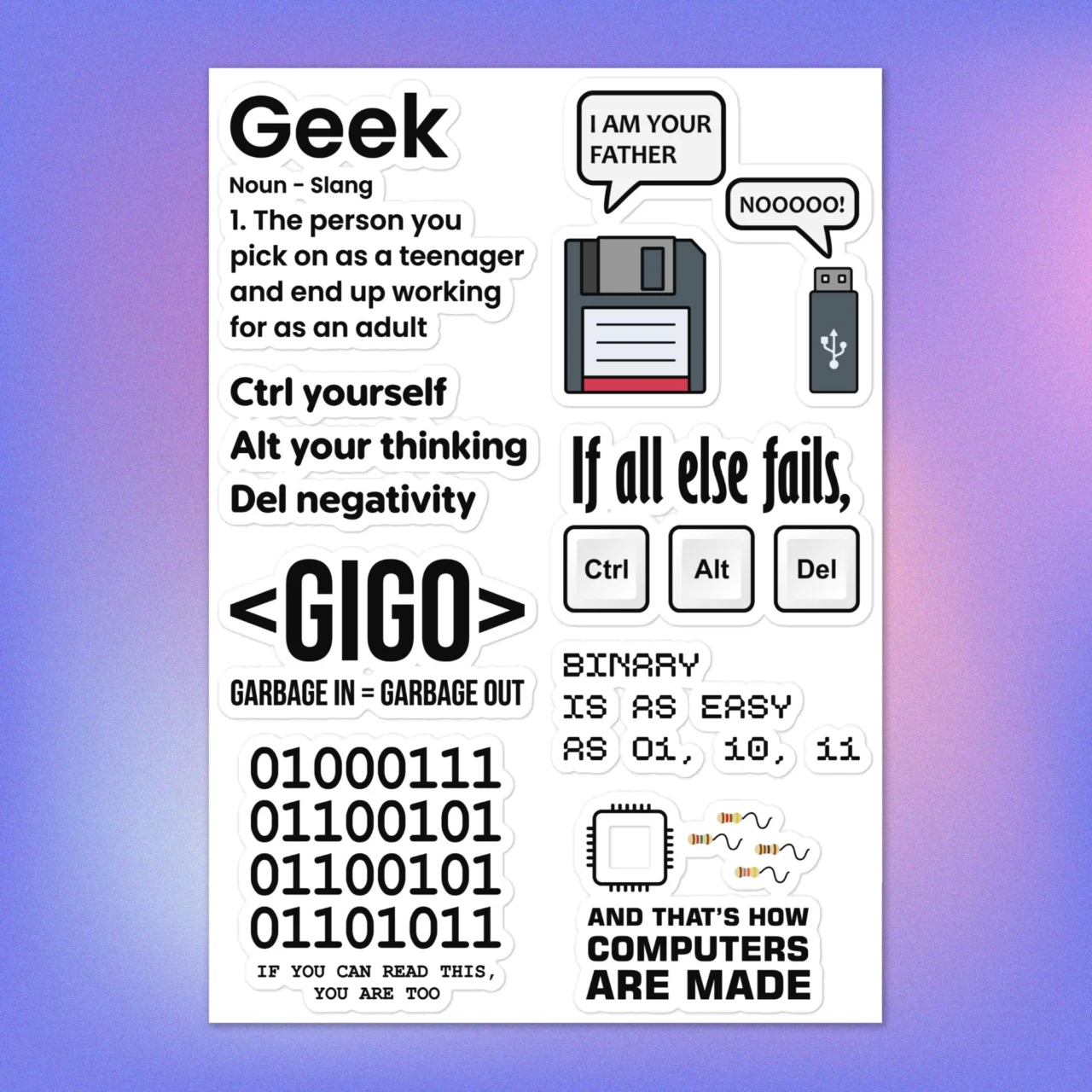 Level up your hardware with the ultimate geek survival kit. This high-quality Geek Tech Sticker Pack features iconic tech jokes and classic hardware references that only true nerds will appreciate: