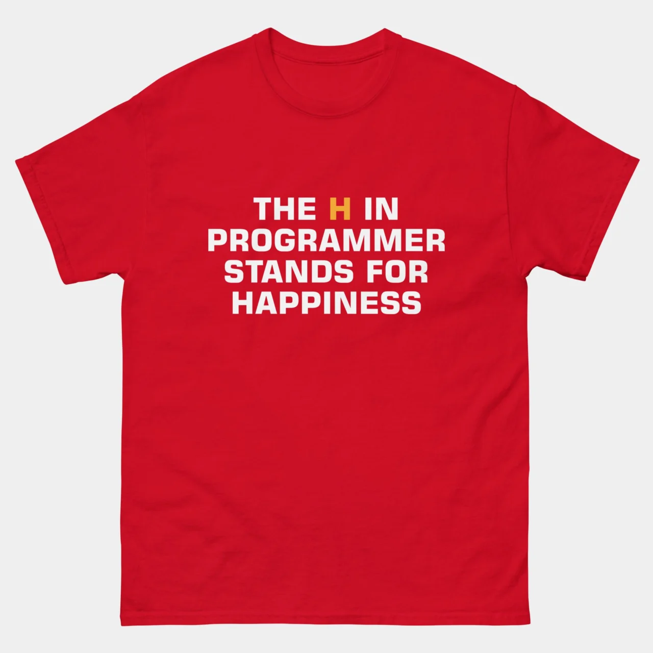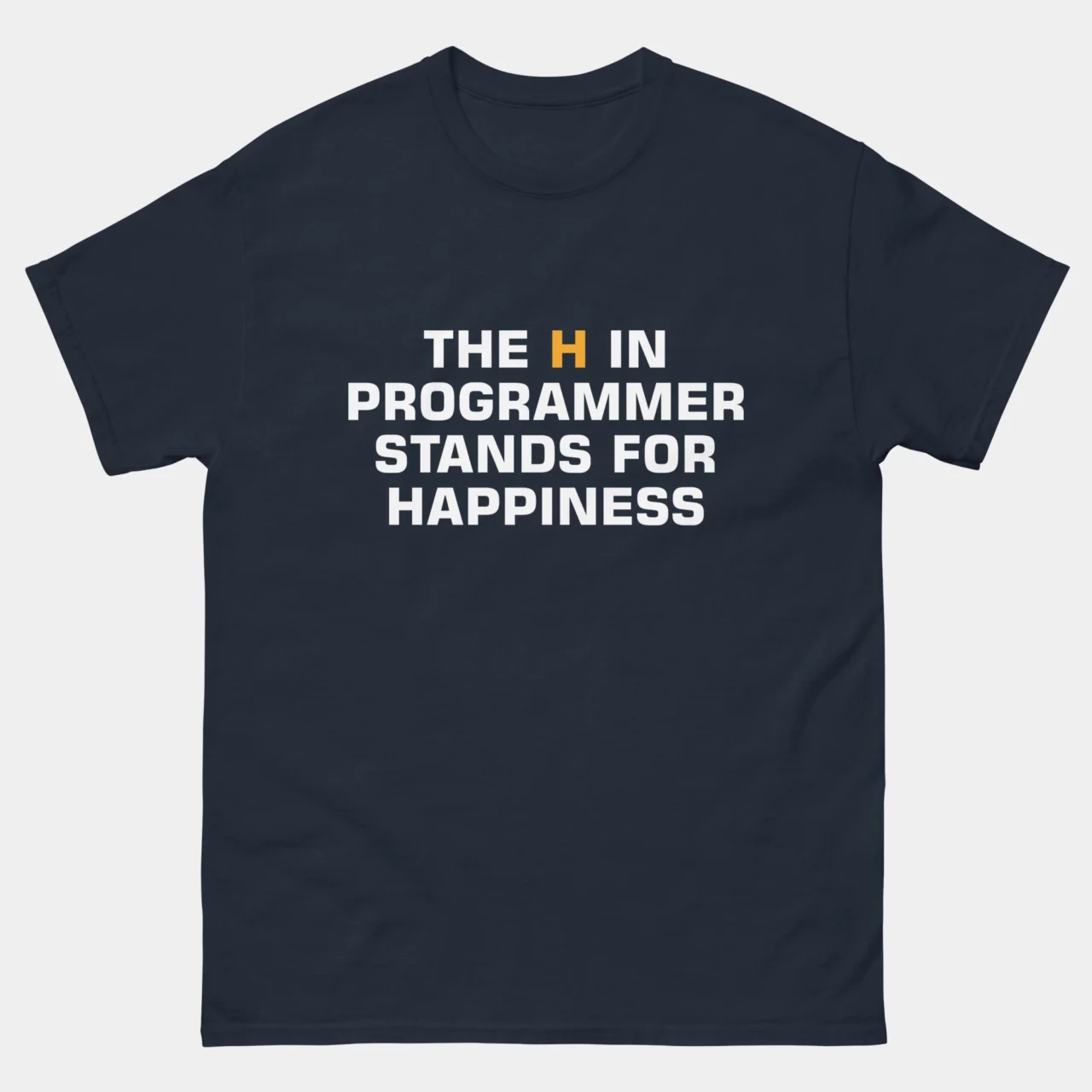 H In Programmer Stands For Happiness Shirt – (Yes, we know there’s no ‘H’… that’s the joke!)