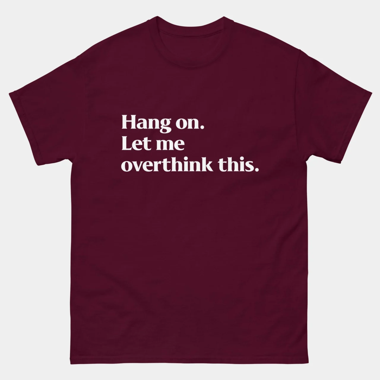 For when you need just a few more hours (or days) to weigh every possible outcome. This classic black Hang On Let Me Overthink This T-Shirt features the unofficial motto of perfectionists and analysts everywhere: