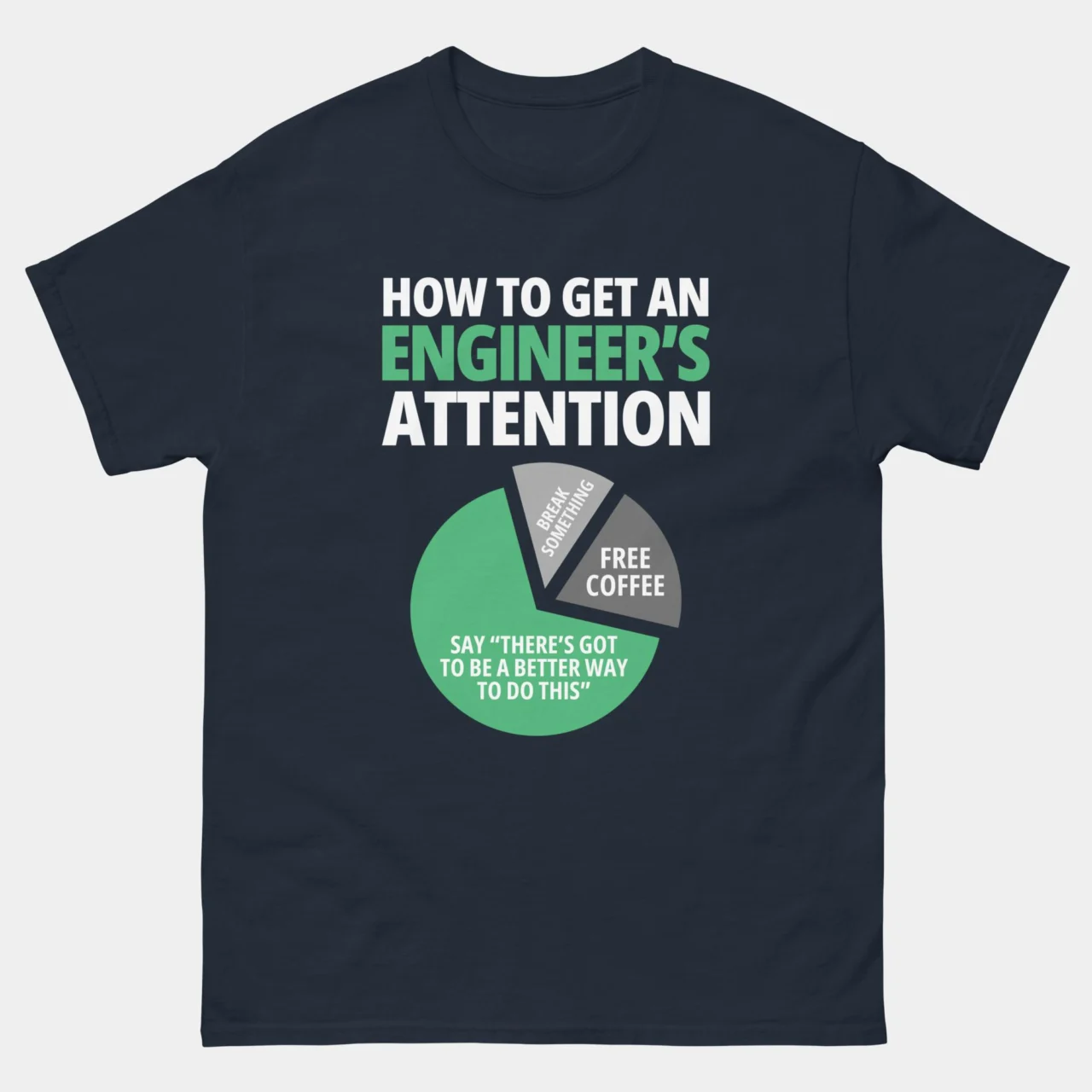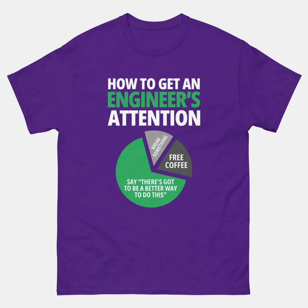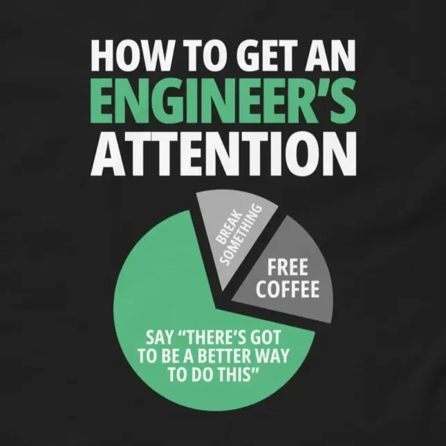 For the person who finds it impossible to walk away from an inefficient process. This classic How To Get An Engineer’s Attention T-Shirt breaks down the science of capturing an engineer’s focus through a relatable data visualization: