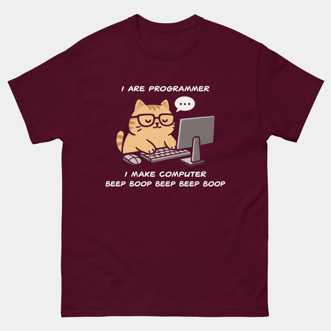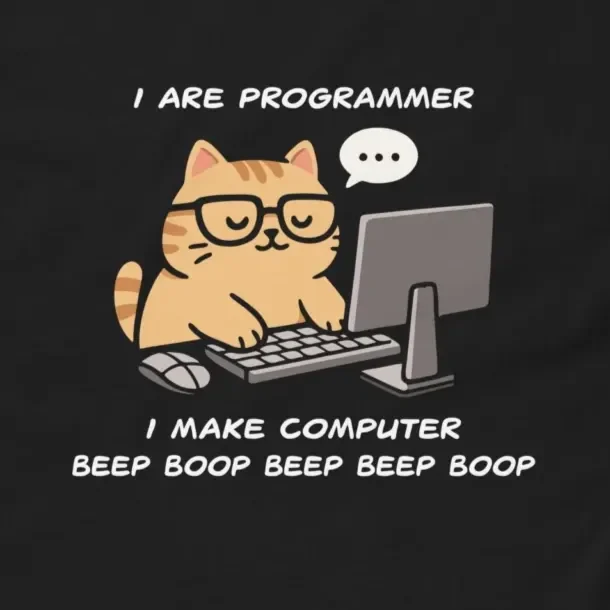 Ever feel like your complex code boils down to just making a machine go “beep boop”? Embrace the simple side of software engineering with this hilarious and adorable I Are Programmer Funny Cat T-shirt. Featuring a scholarly orange cat in glasses working diligently at a desktop computer, the text reads: