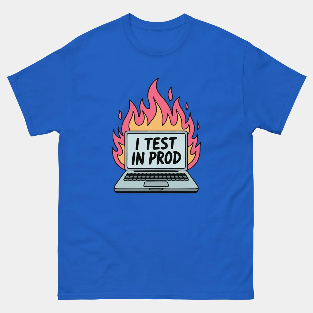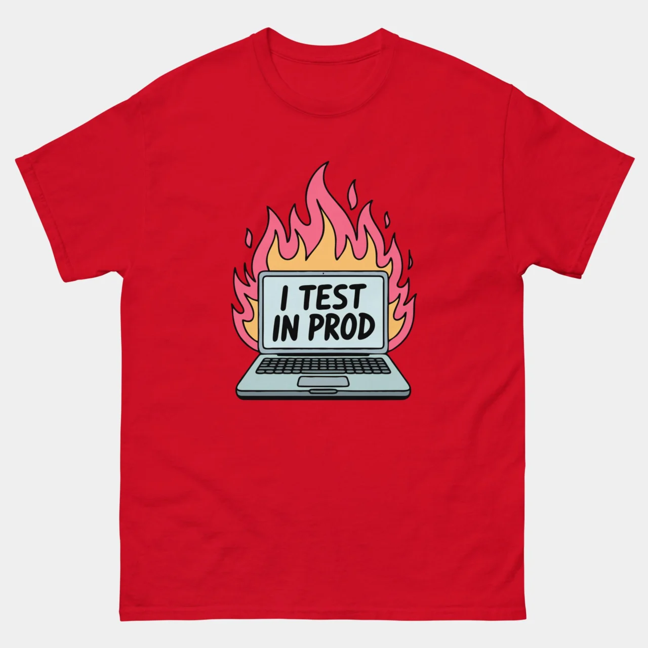For the developer who treats every push to main like a walk through fire. This striking black I Test In Prod Funny Programmer T-shirt features a classic laptop engulfed in vibrant pink and orange flames, with a bold message on the screen: