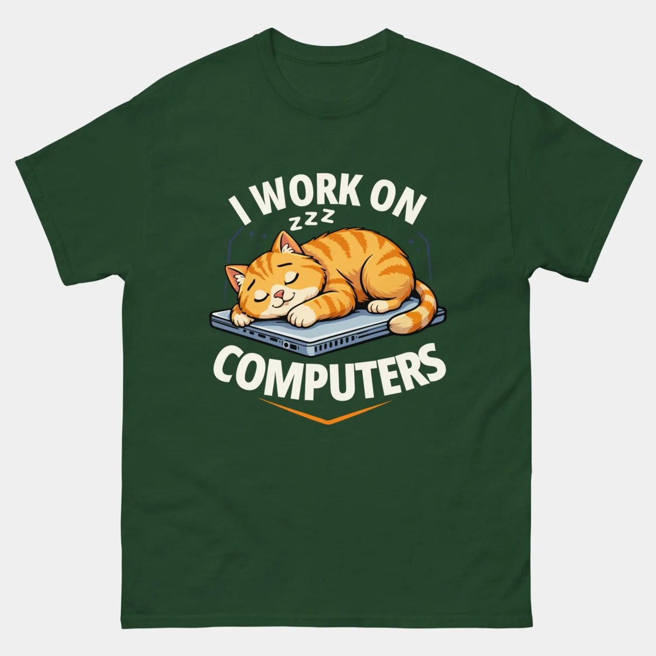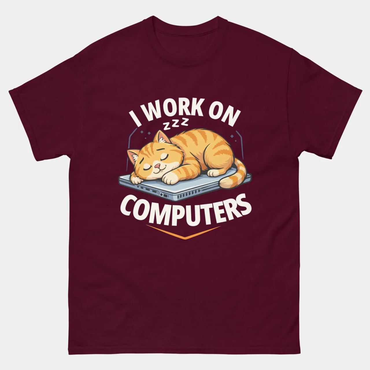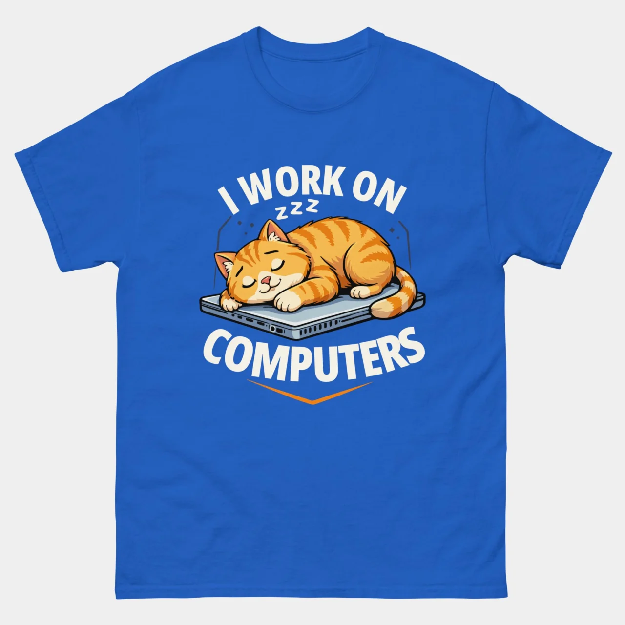 Bold Arched Typography: The text “I WORK ON” and “COMPUTERS” frames the cat in thick, white sans-serif block lettering, making the joke clear even from a distance.