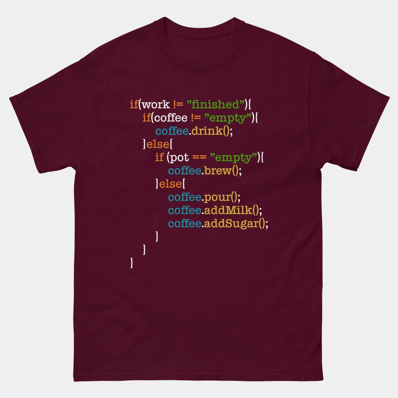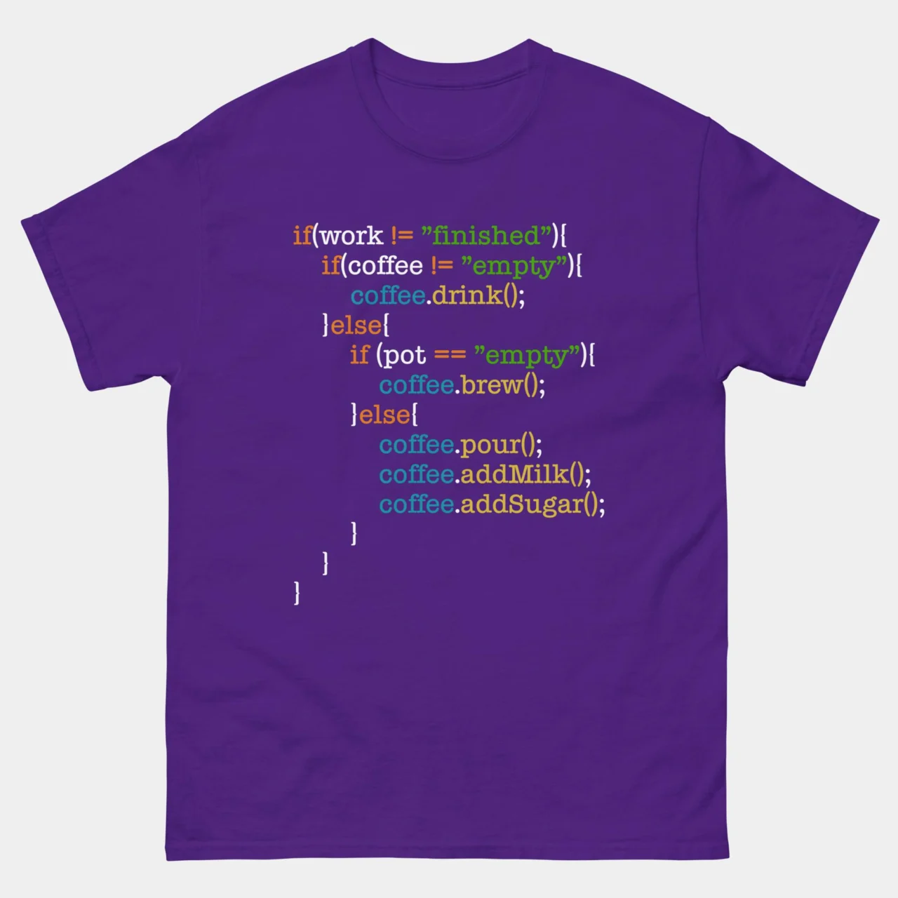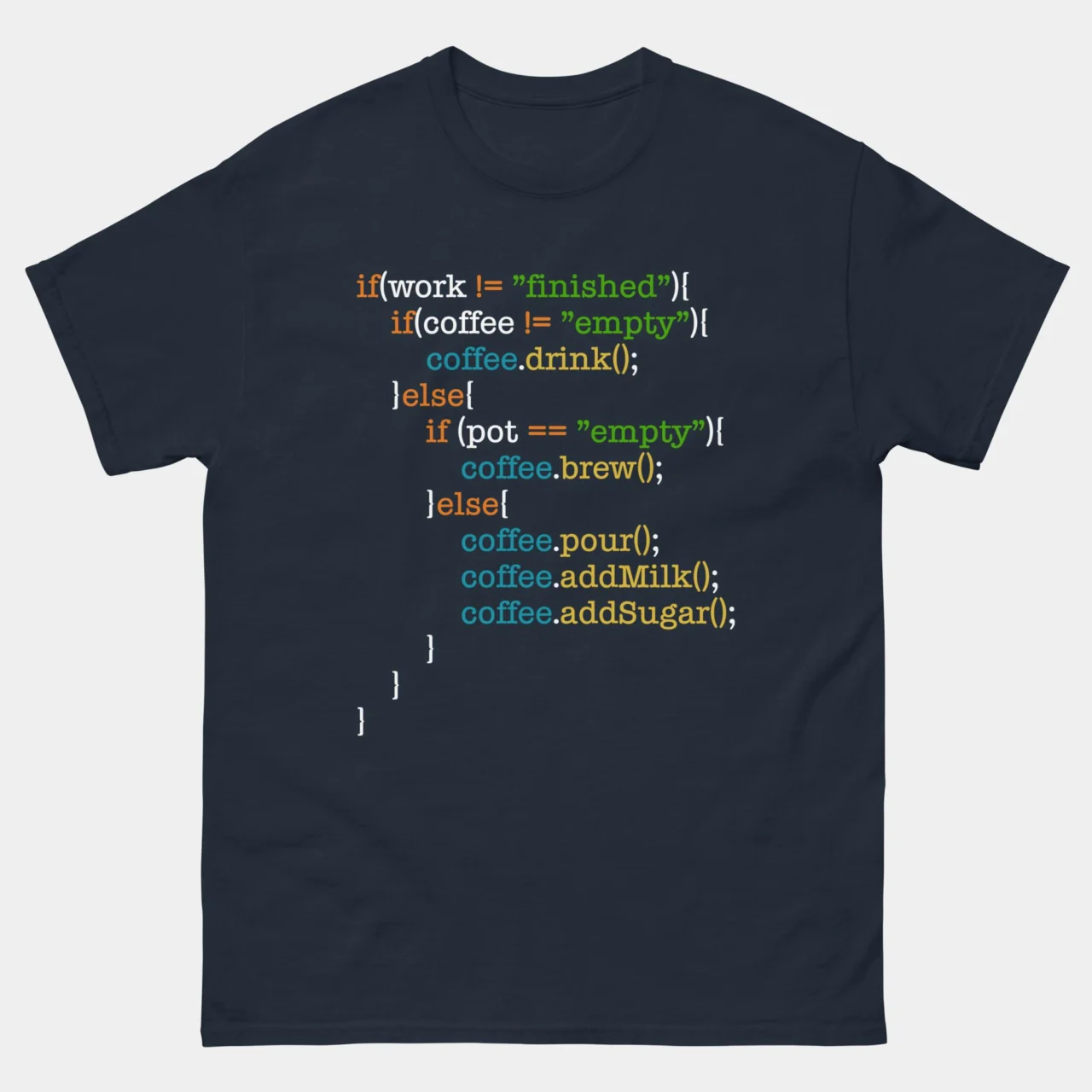 Made with comfort and style in mind, this t-shirt is perfect for showcasing your dedication to both coding and caffeine. Additionally, it humorously outlines the steps to make the perfect cup of coffee: “If Pot Is Empty, Brew Coffee, Pour Coffee, Add Milk, Add Sugar,” resembling a code algorithm. Whether you’re coding late into the night, attending hackathons, or simply want to express your love for coffee and code, this tee is a must-have addition to your collection. Embrace the programmer’s lifestyle with this trendy and amusing t-shirt!
