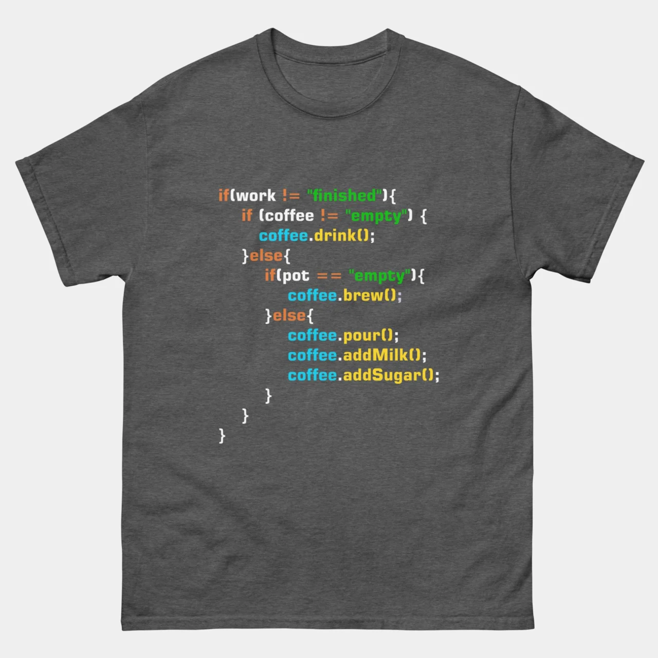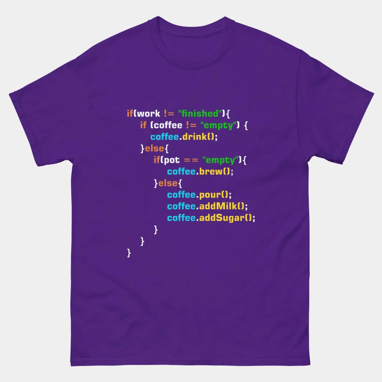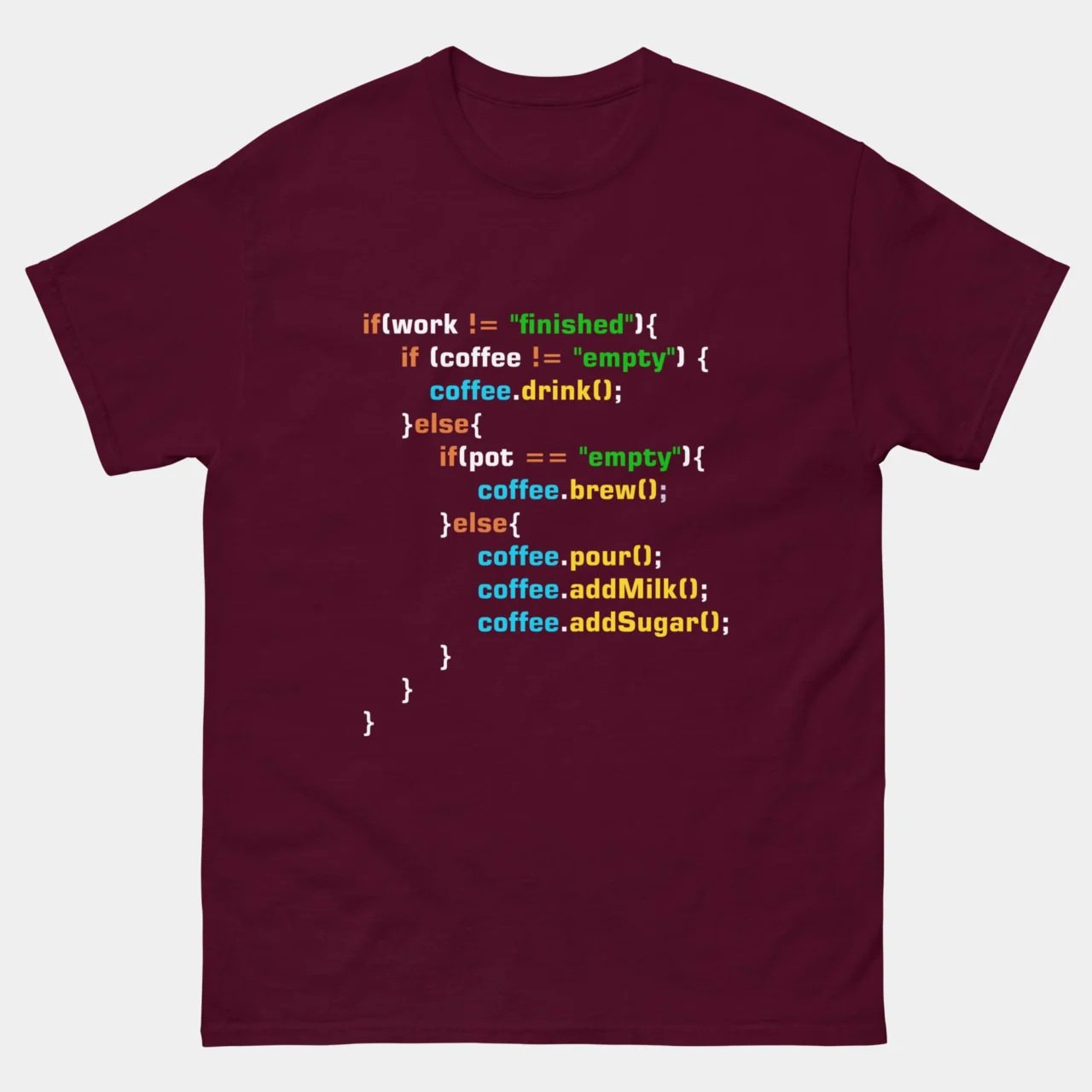 This hilarious pseudo-code tee is for developers who run their daily logic strictly on caffeine. Featuring a never-ending loop of “brew, pour, drink, repeat,” it’s perfect for coders who treat coffee like source control.