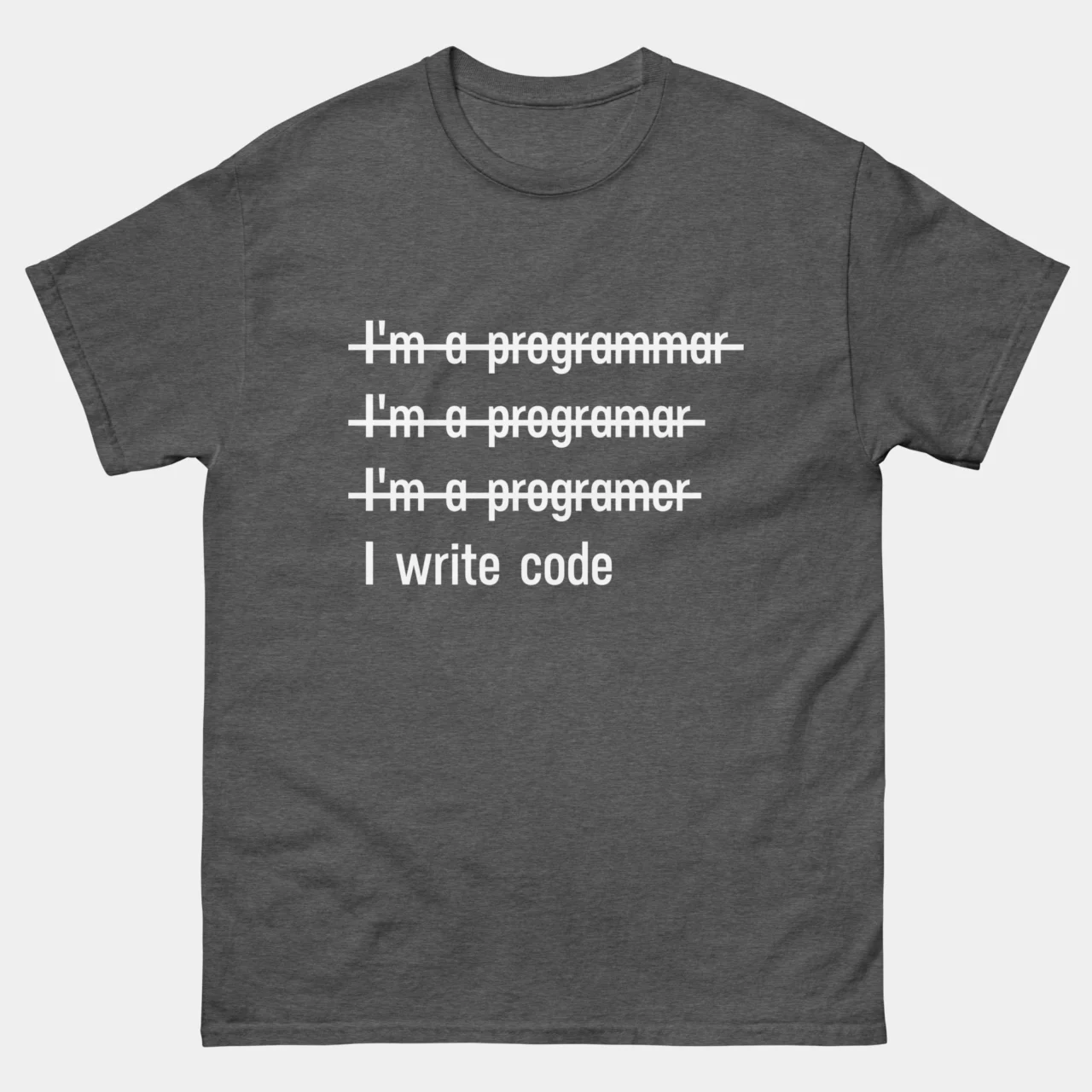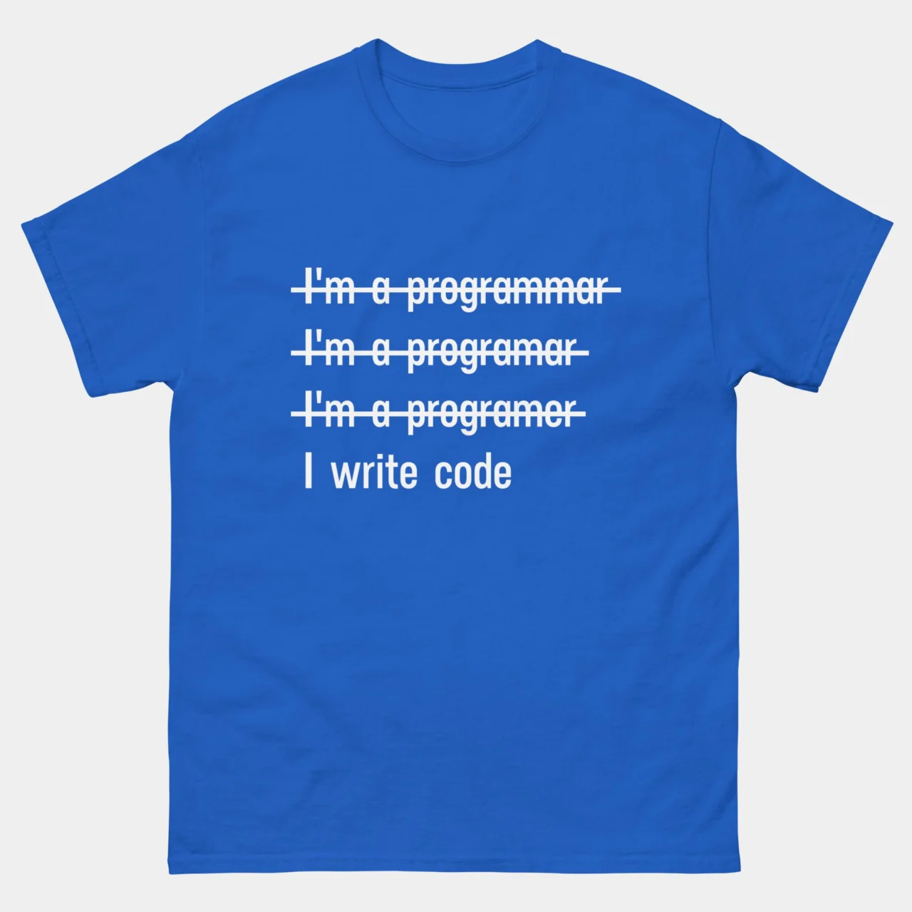 Im a Programmer I Write Code T-Shirt – “I’m a programmar, i’m a programar. I mean programer. I write code.”