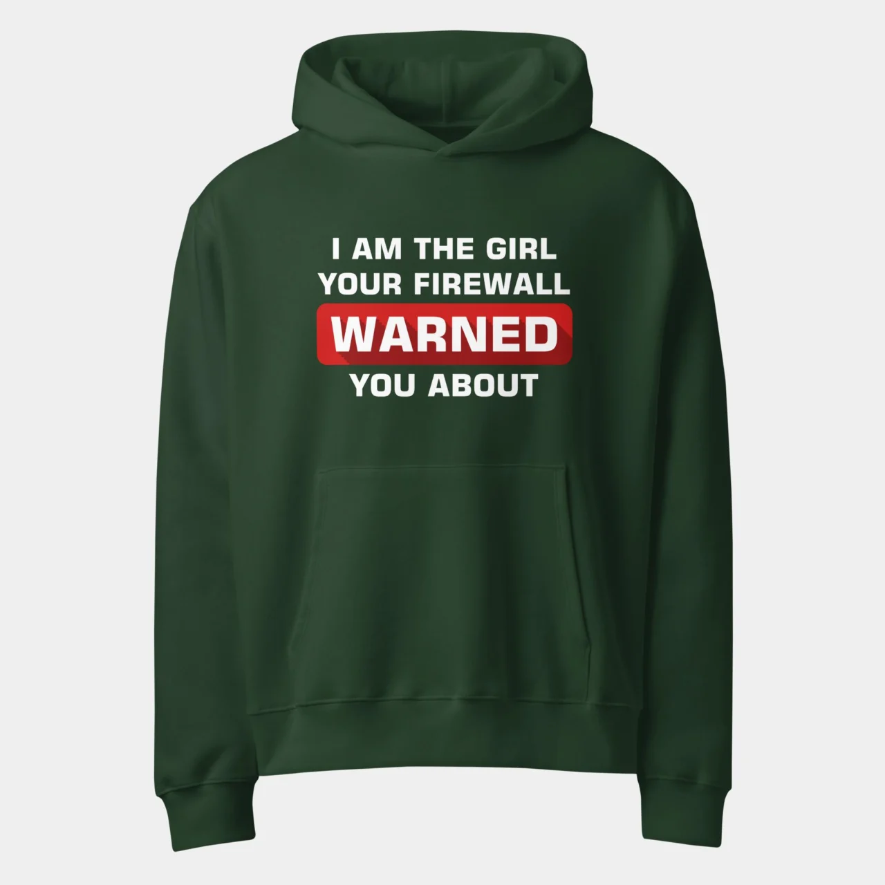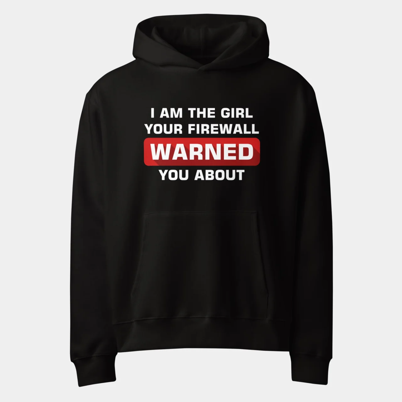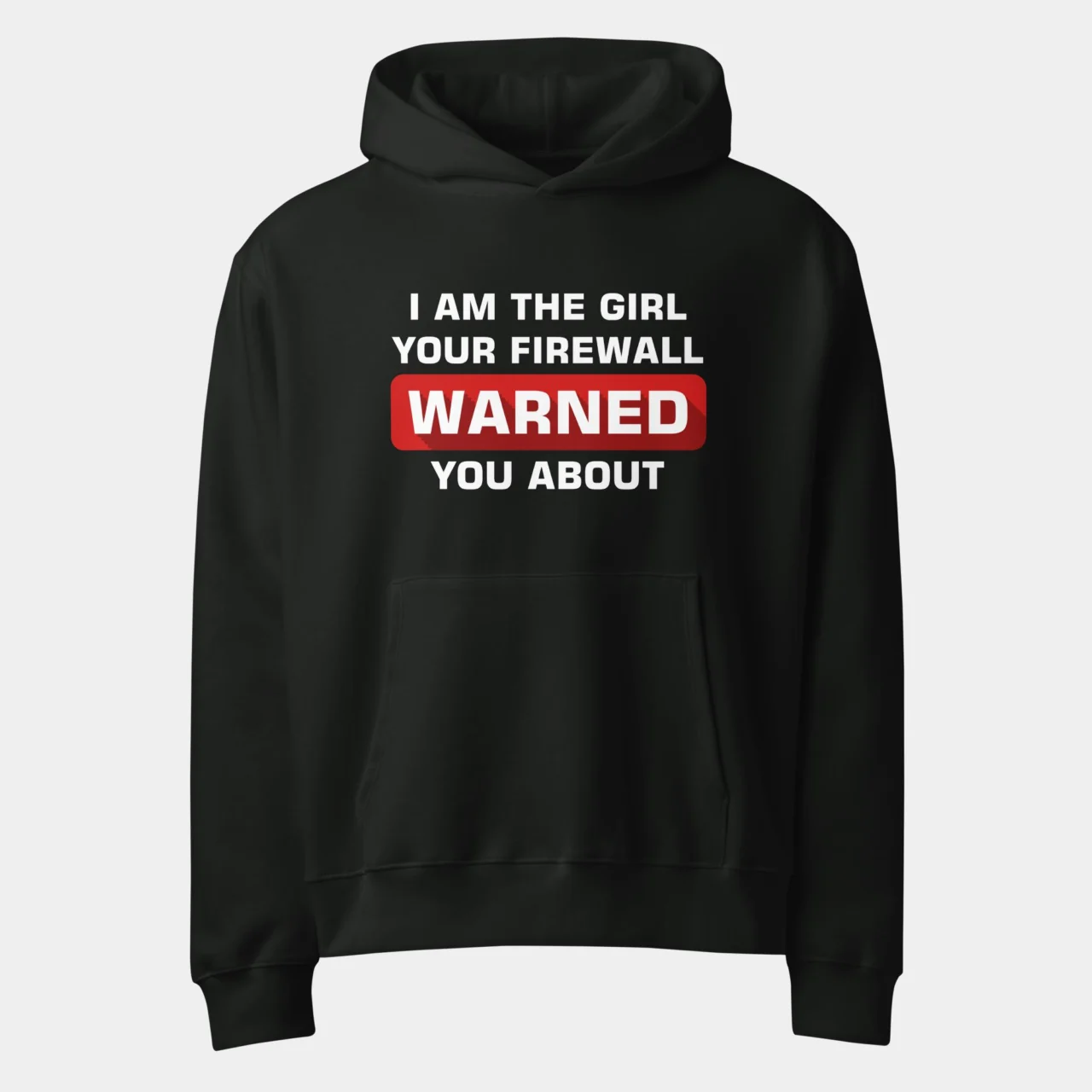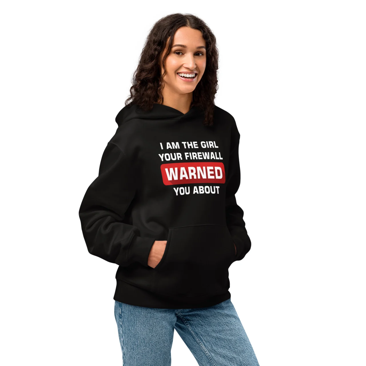I’m The Girl Your Firewall Warned You About Oversized Hoodie – Funny Women’s Cybersecurity Hacker Pullover – Female IT Security Gift – Heavyweight Fleece
