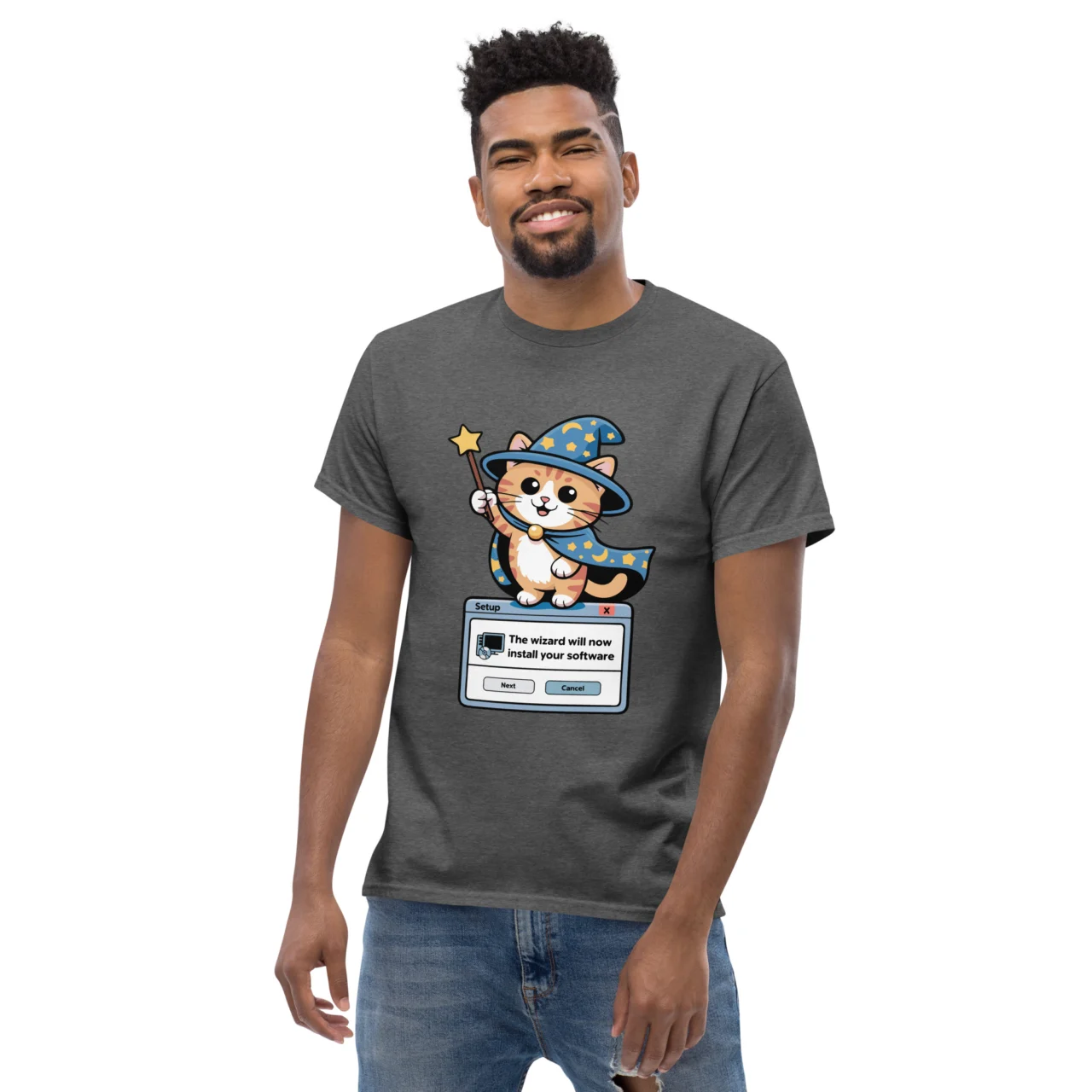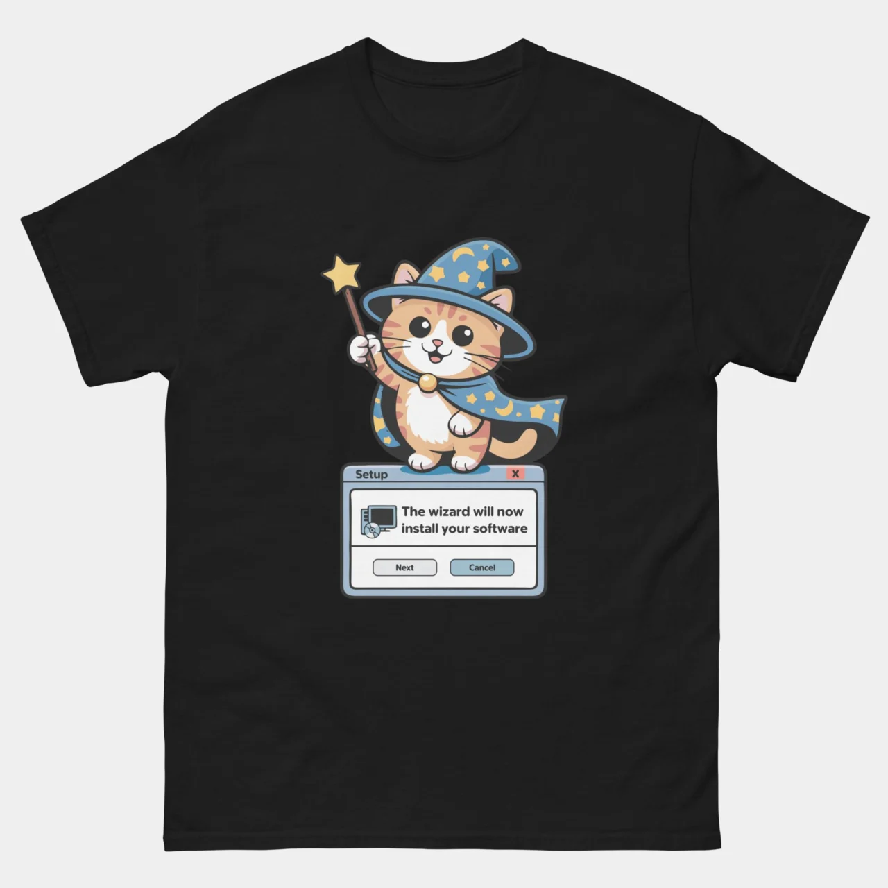 The most helpful setup assistant you’ll ever encounter has finally arrived. This classic dark heather Installation Wizard Funny Cat T-shirt features an adorable orange tabby kitten dressed in a star-speckled wizard hat and cape, standing atop a retro “Setup” window:
