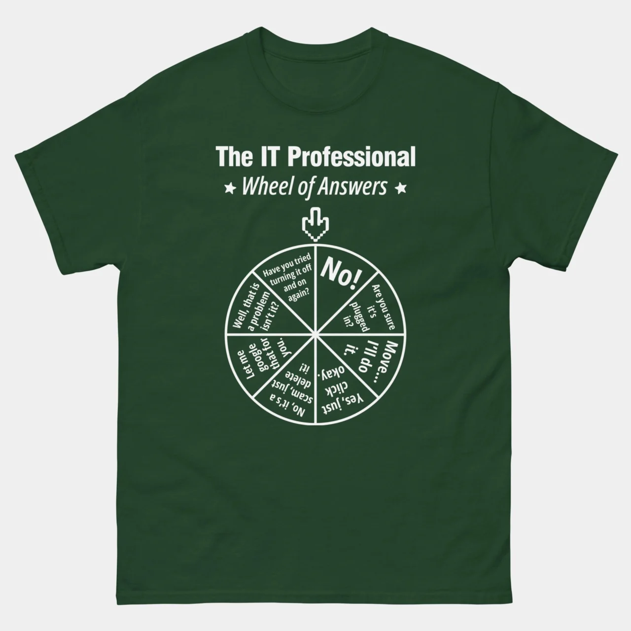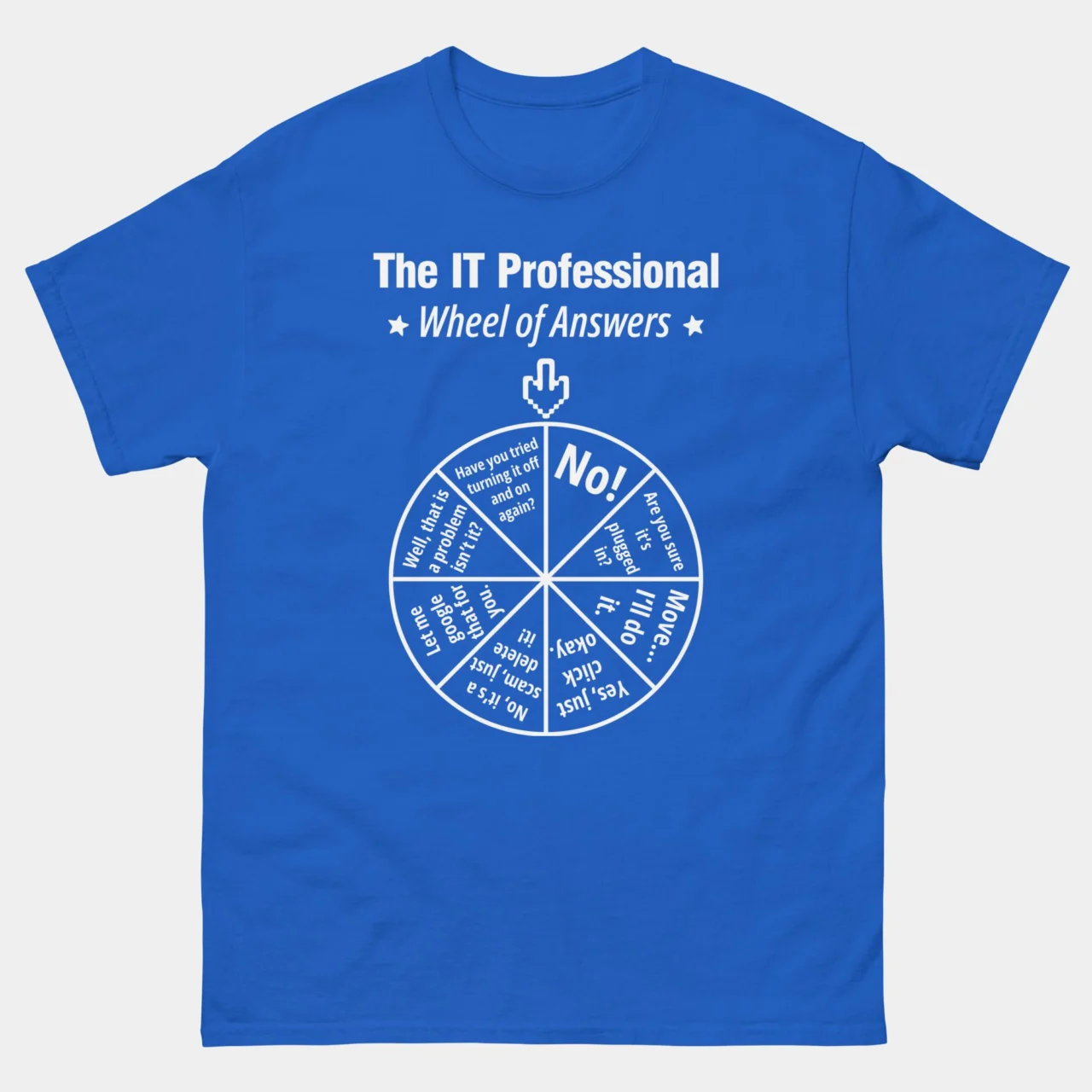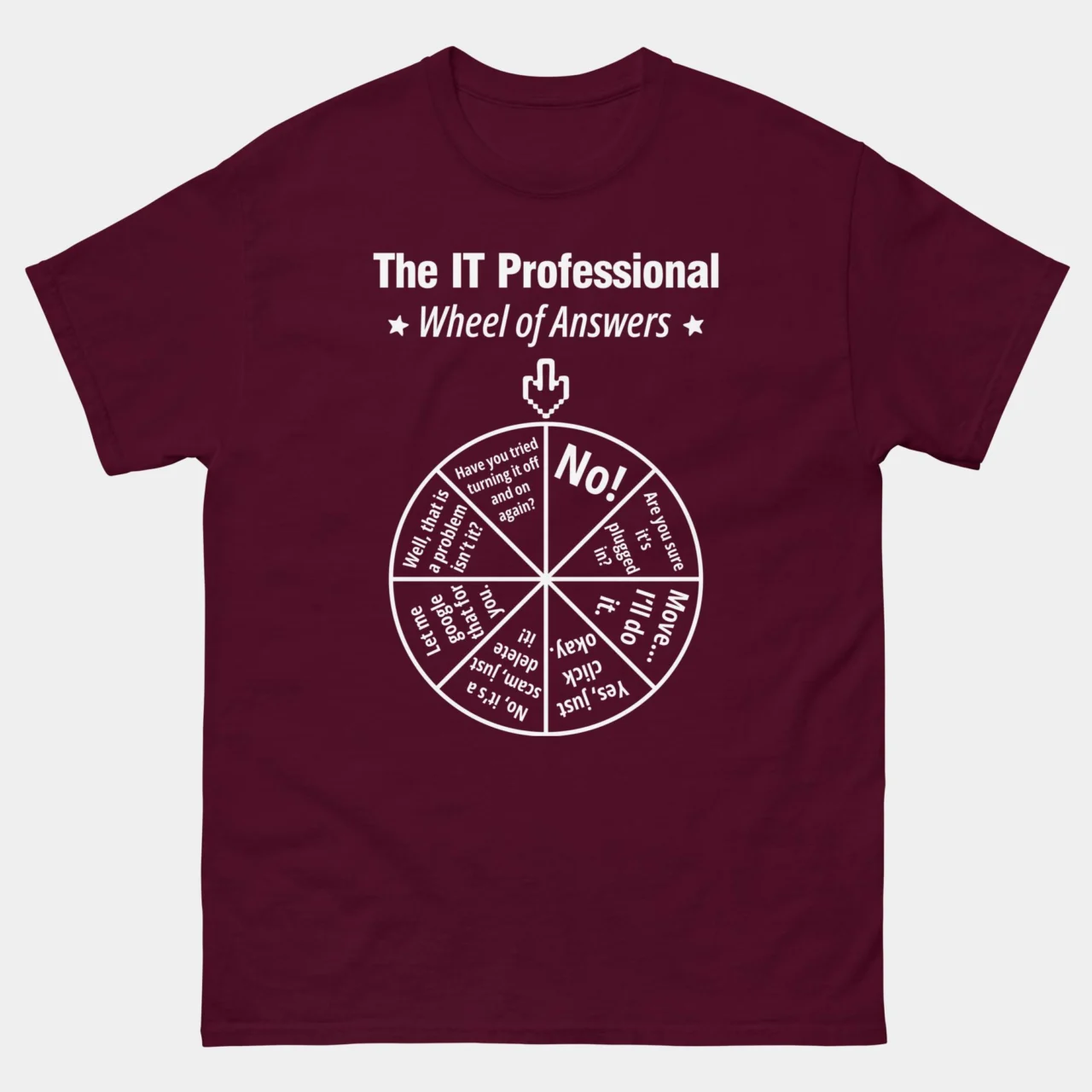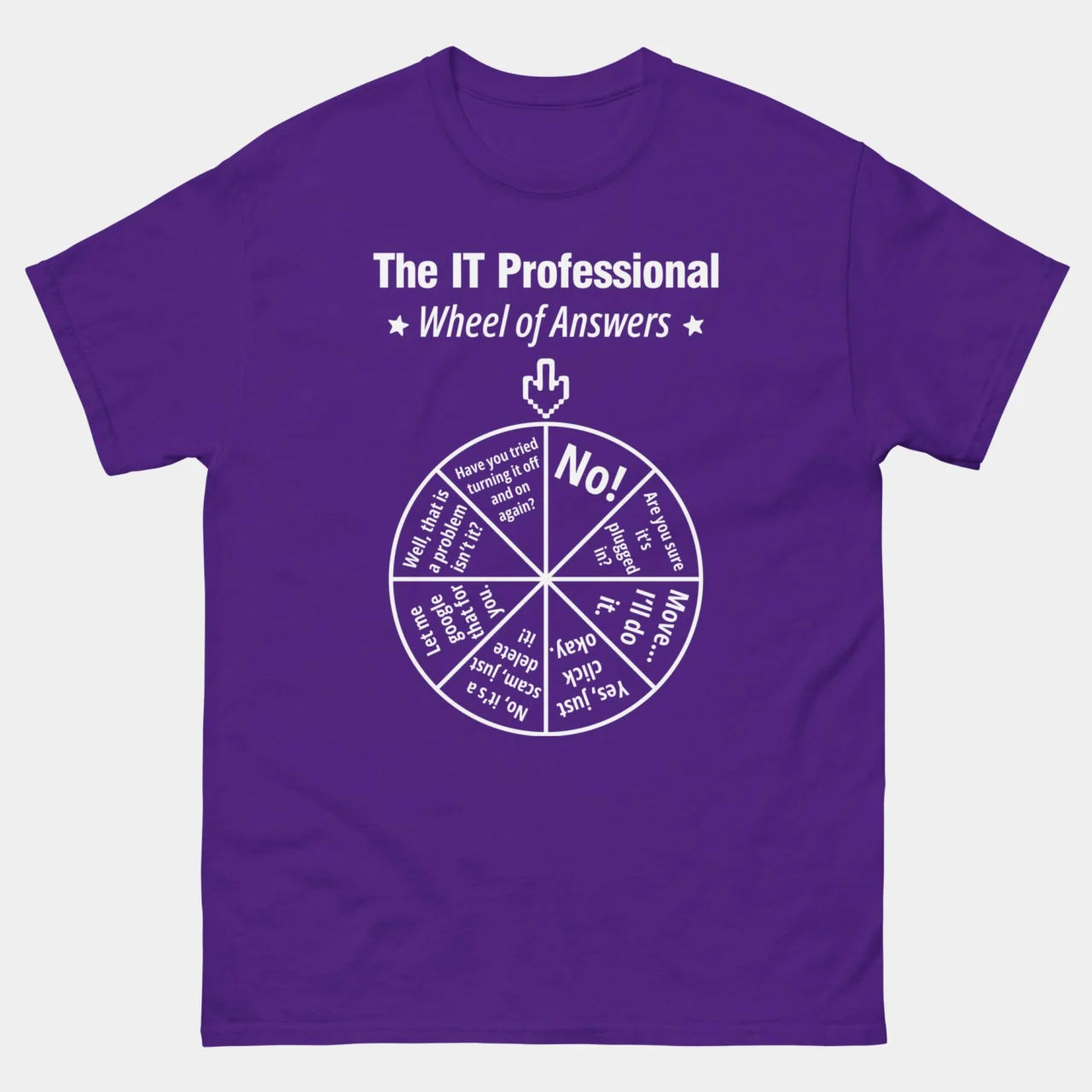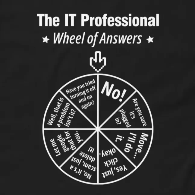 For when you’ve reached your “have you tried turning it off and on again” limit for the day. This black IT Professional Wheel of Answers T-Shirt features the ultimate decision-making tool for every technical support specialist: