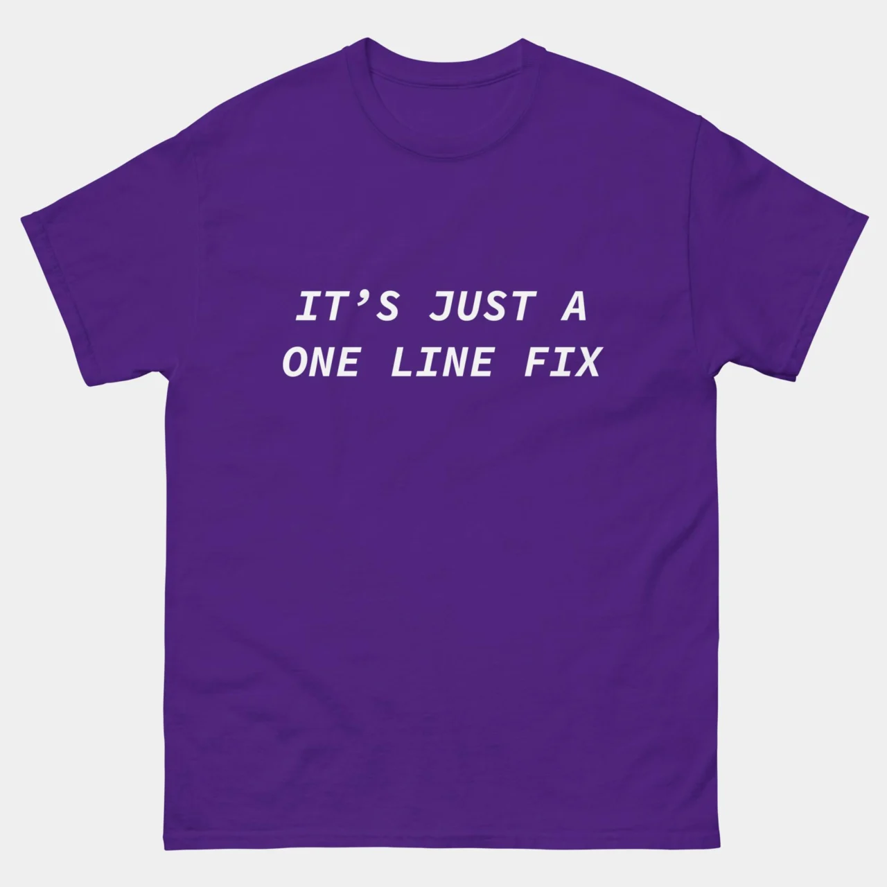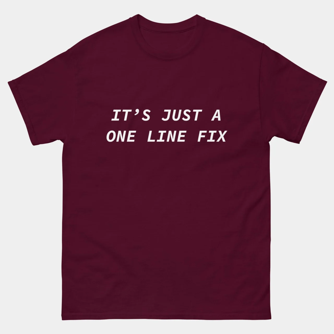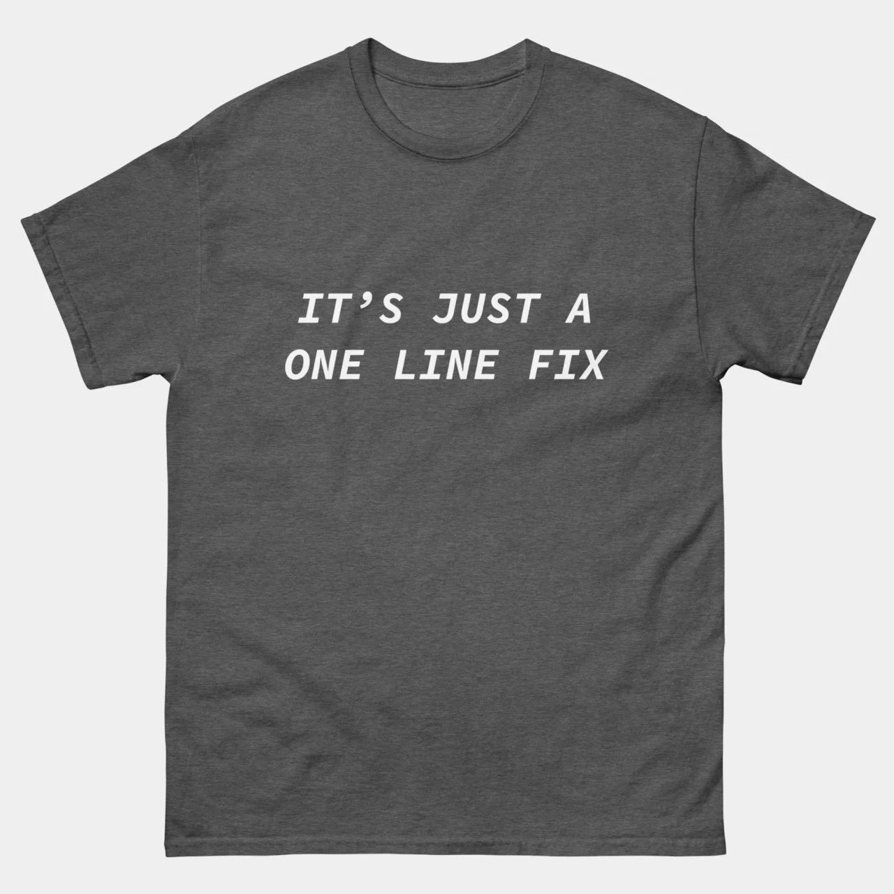 Its Just a One-Line Fix T-Shirt: “Its just a one-line fix”—the biggest lie in programming! Every developer knows that one tiny code change can break everything, and this funny coding t-shirt perfectly captures the sarcasm of debugging and troubleshooting.