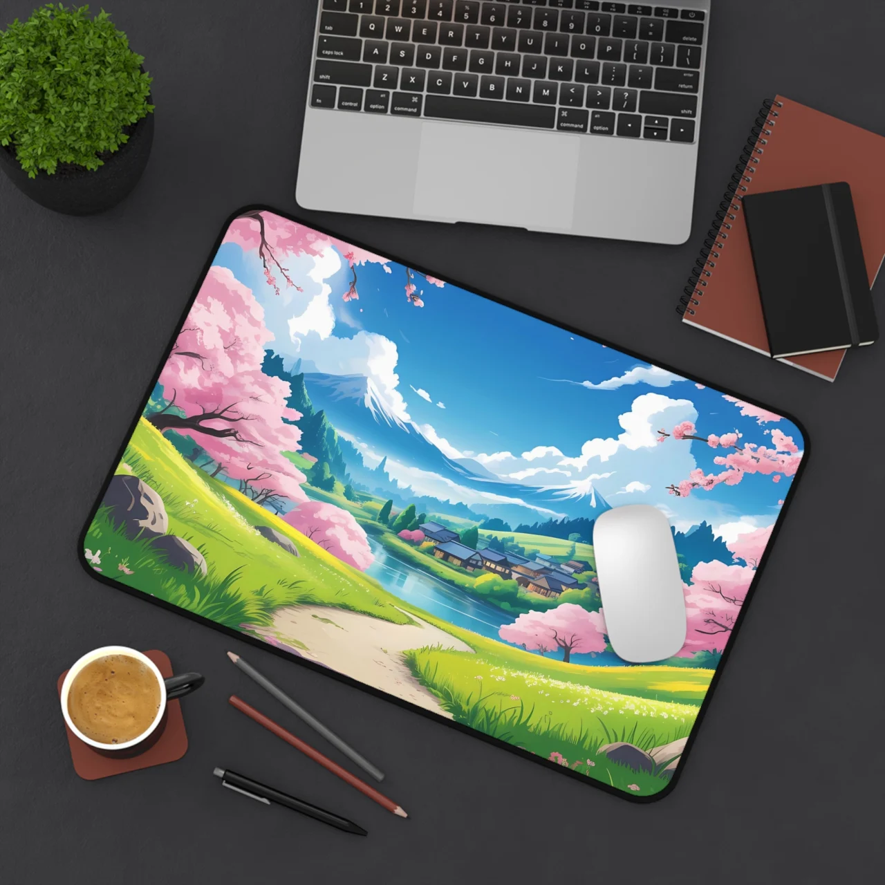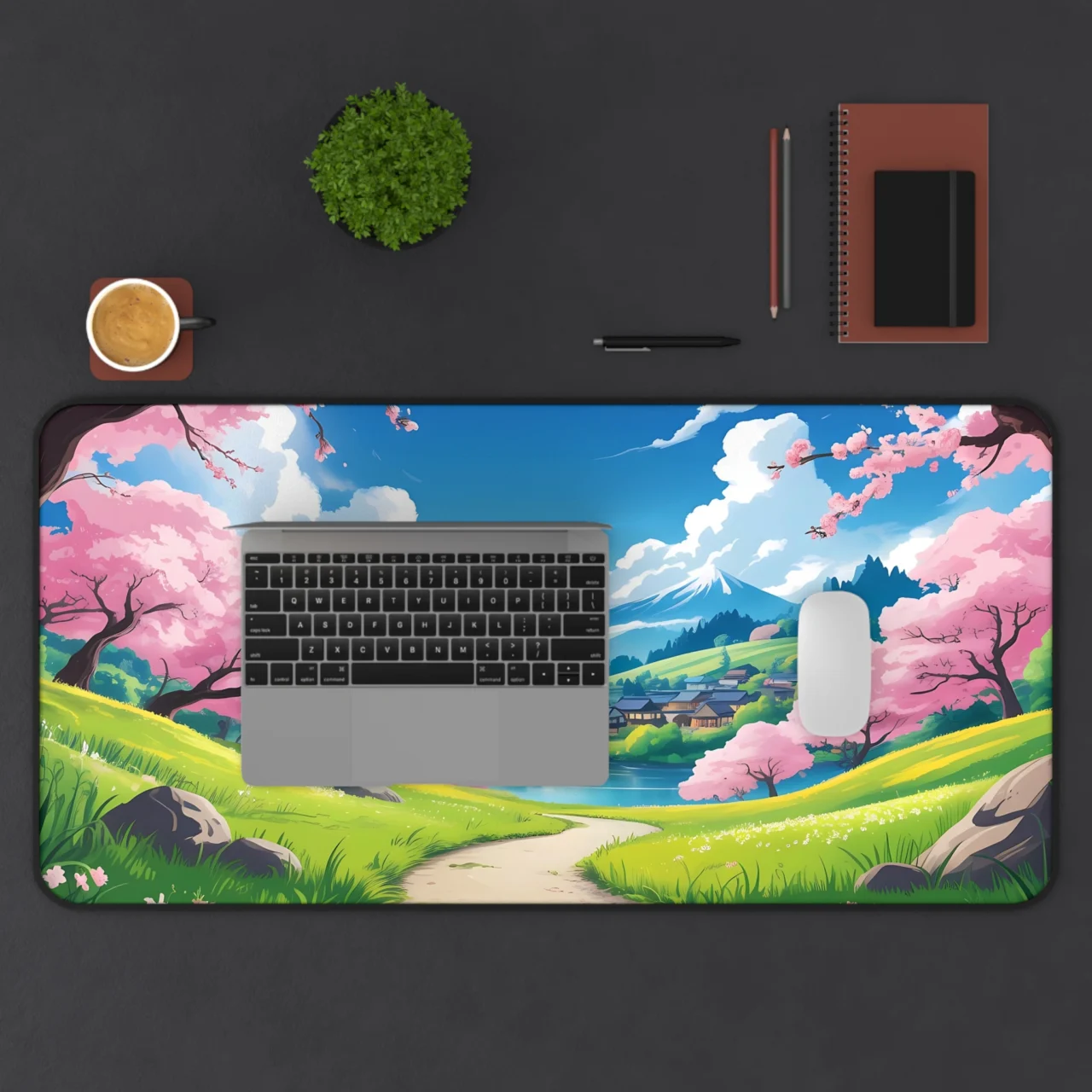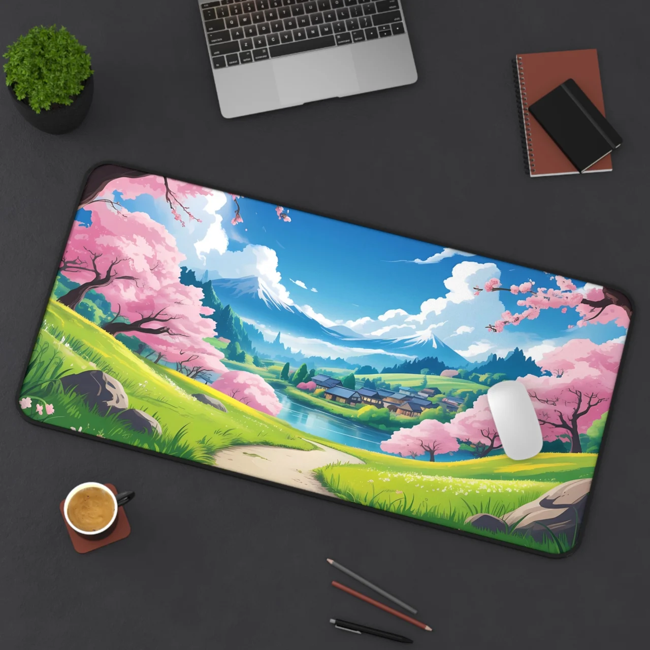 This isn’t just a mat; it’s a piece of pure serenity. Imagine a crisp spring morning, walking past vibrant pink cherry blossom trees (Sakura), with the majestic Mount Fuji towering in the distance, overlooking a quaint village. The bright colors, lush greens, and stunning blue sky captured in this anime-style landscape create an instantly uplifting and peaceful environment. It’s the perfect blend of Japanese aesthetic and cheerful nature.