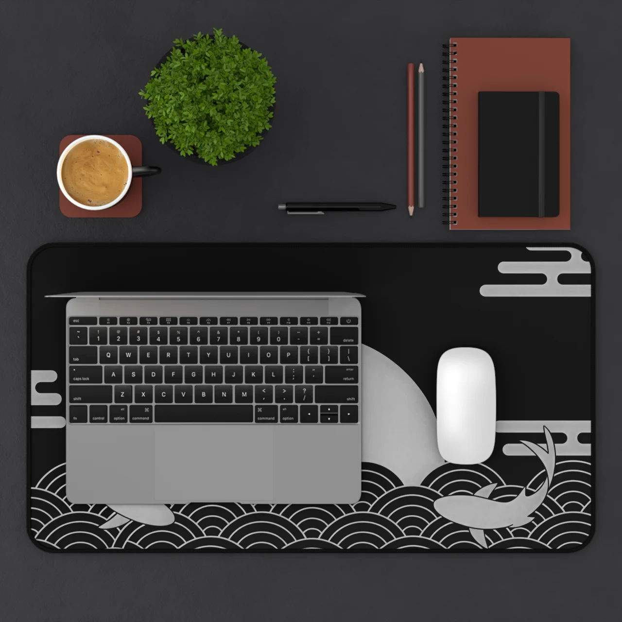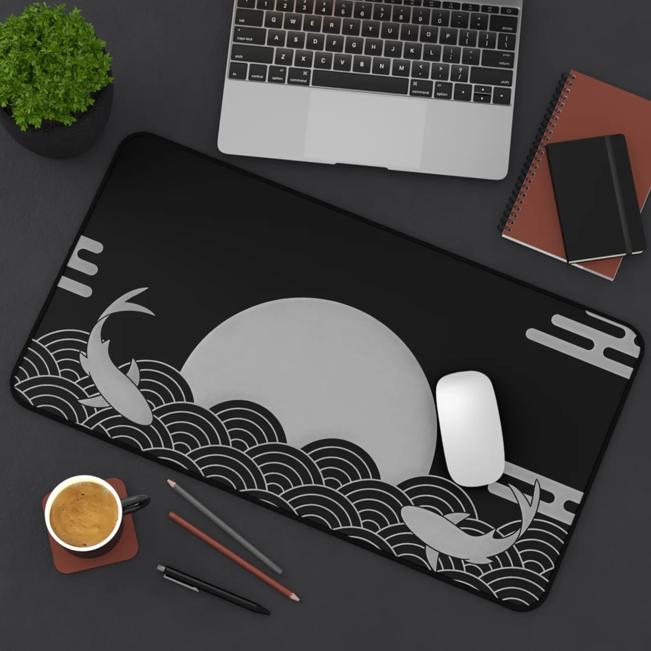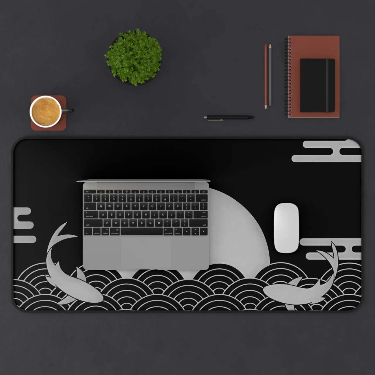 Japanese Koi Fish Desk Mat, Minimalist Zen Office Decor, Large Extended Mouse Pad, Seigaiha Wave & Rising Sun Desk Pad, Black and Grey Japanese Art Gaming Mat, Aesthetic Workspace Accessories, Great Gift for Minimalists