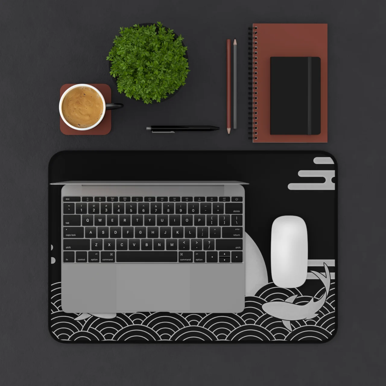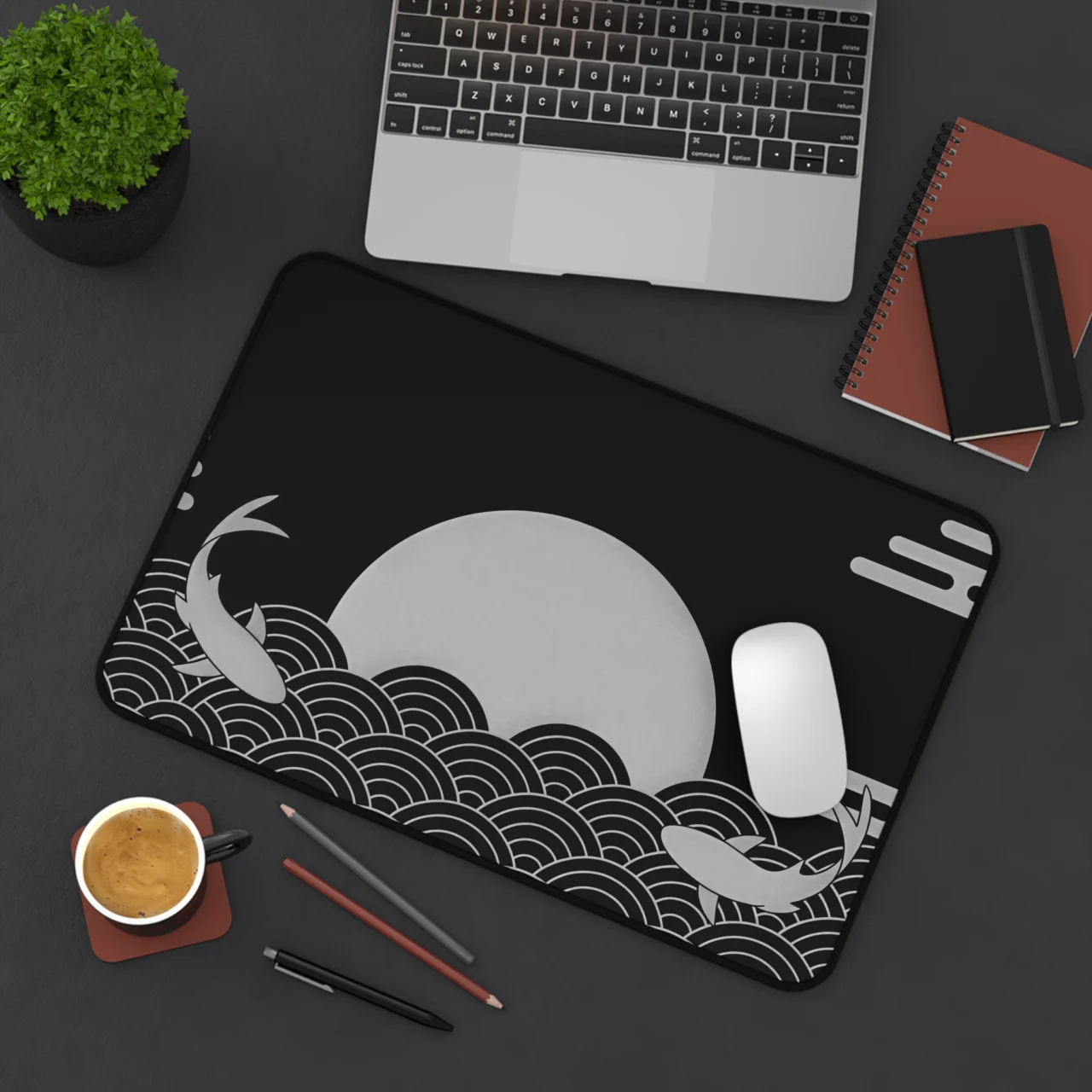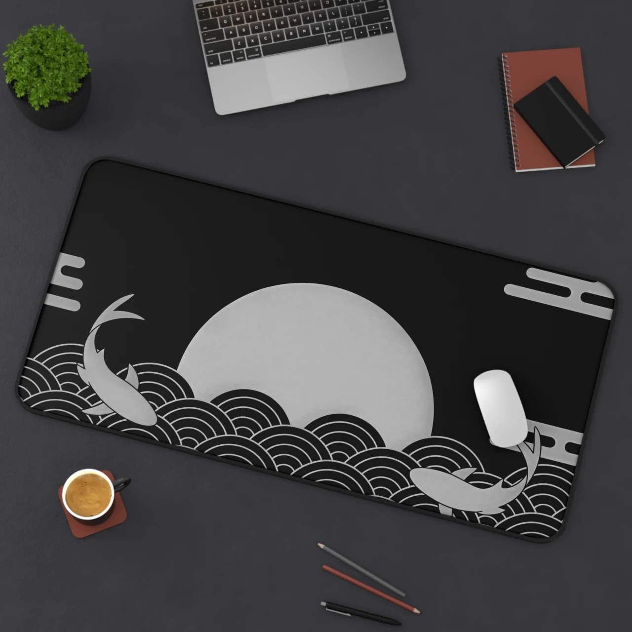 Japanese Koi Fish Desk Mat, Minimalist Zen Office Decor, Large Extended Mouse Pad, Seigaiha Wave & Rising Sun Desk Pad, Black and Grey Japanese Art Gaming Mat, Aesthetic Workspace Accessories, Great Gift for Minimalists