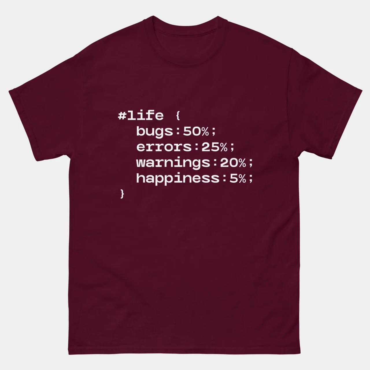 Life Bugs Errors Warnings Happiness T-Shirt – Life: 50% bugs, 25% errors, 20% warnings, 5% happiness.
