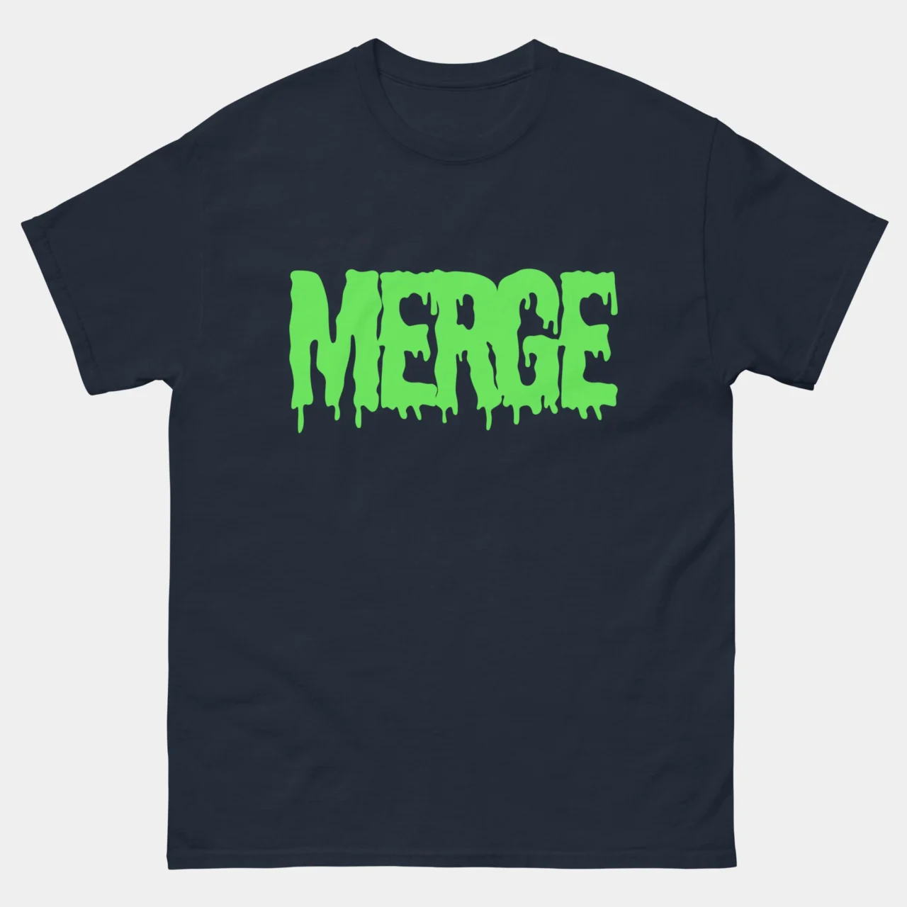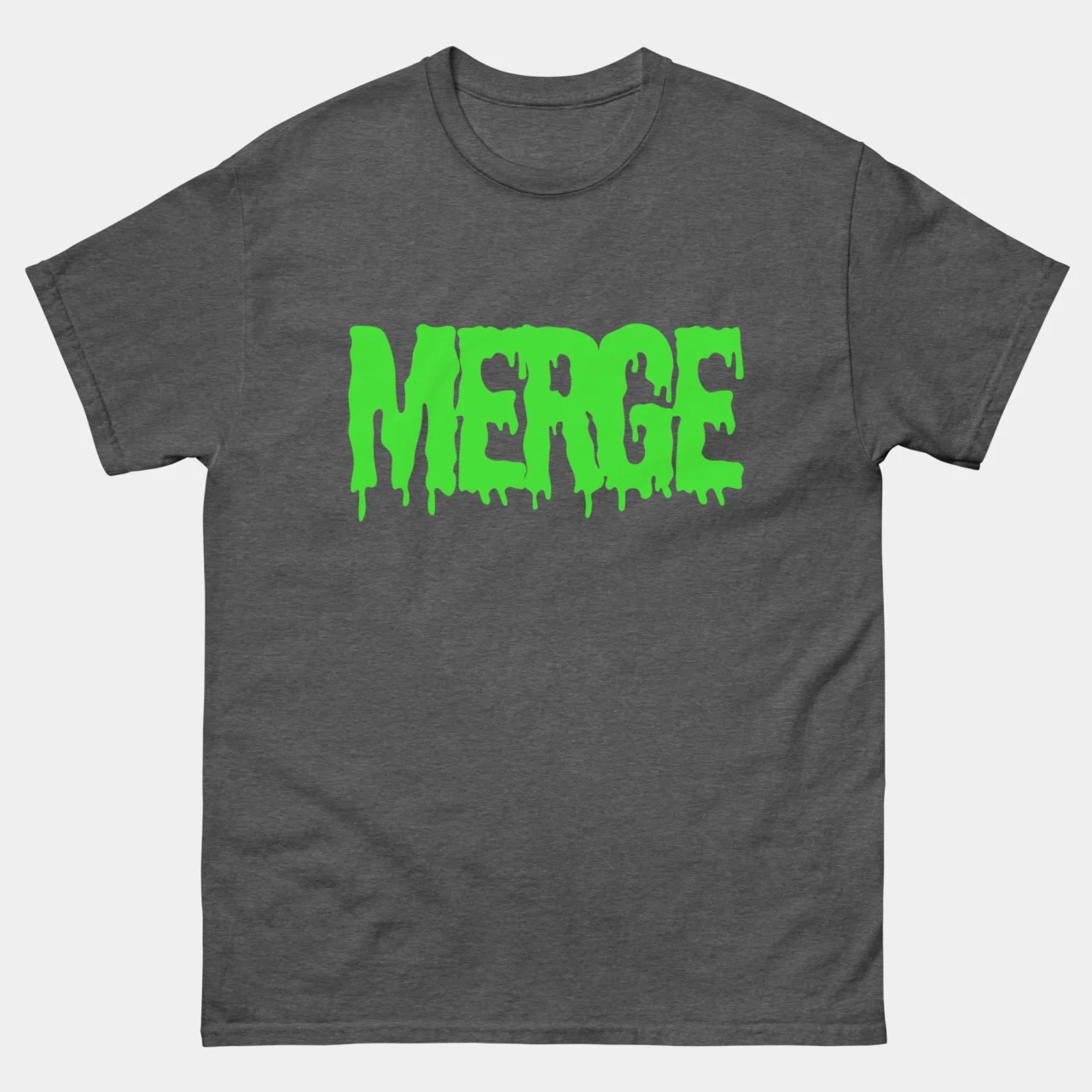 Because every pull request is a little bit of a gamble. This striking black Merge Funny Programmer T-Shirt features the word that defines teamwork (and occasionally conflict) in a vibrant, oozing font: