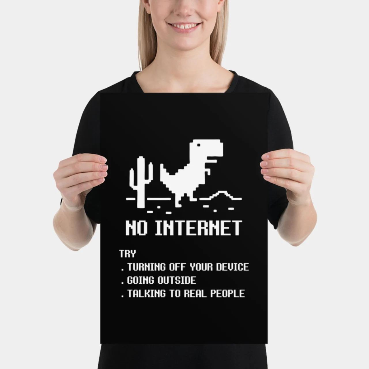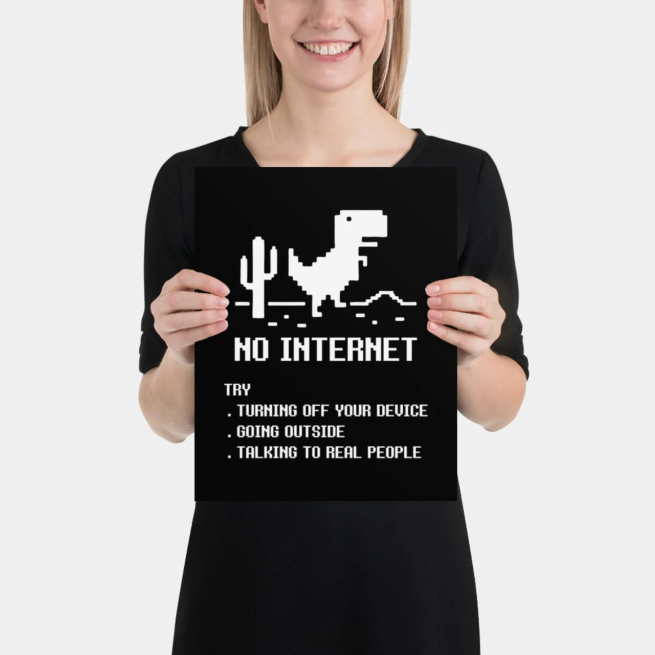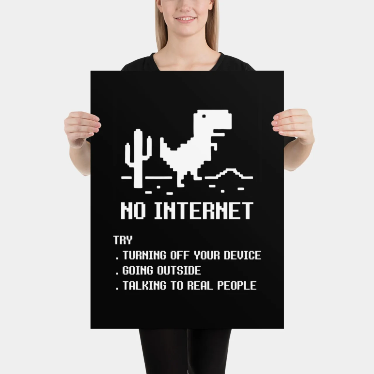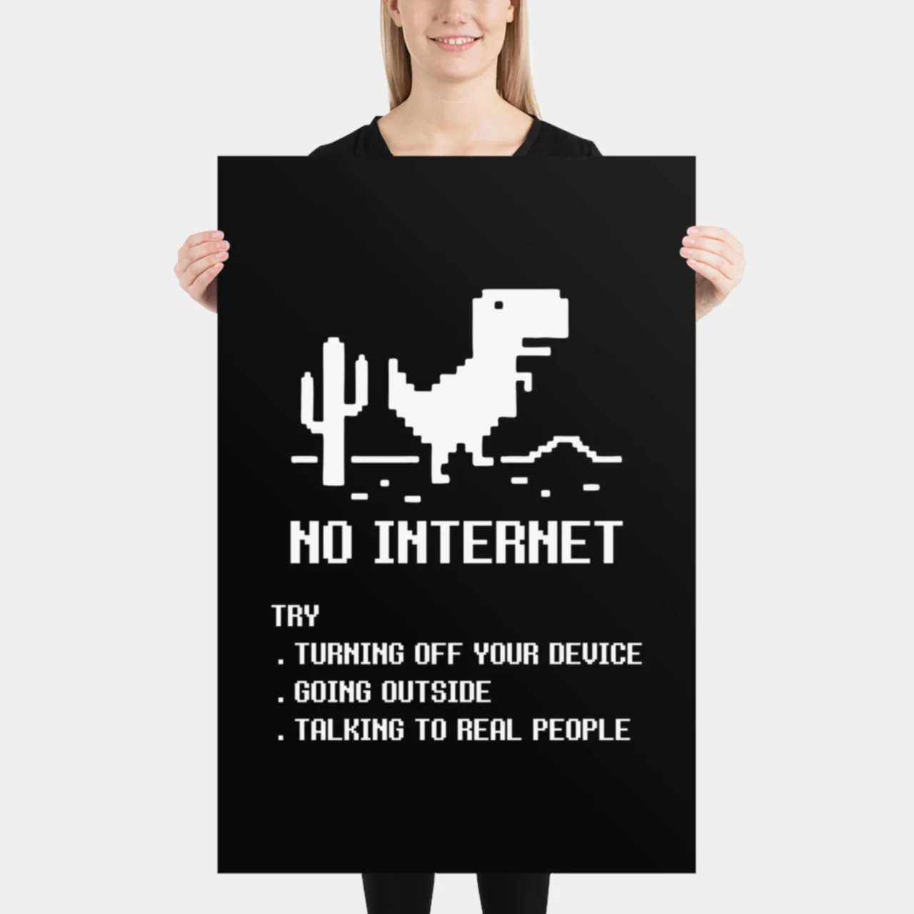 Every coder, gamer, and digital native knows the existential dread of seeing this screen. Celebrate the iconic Browser Dinosaur Game with this witty art print that offers three hilariously unhelpful “solutions” to life without Wi-Fi: Turning Off Your Device, Going Outside, and Talking to Real People.