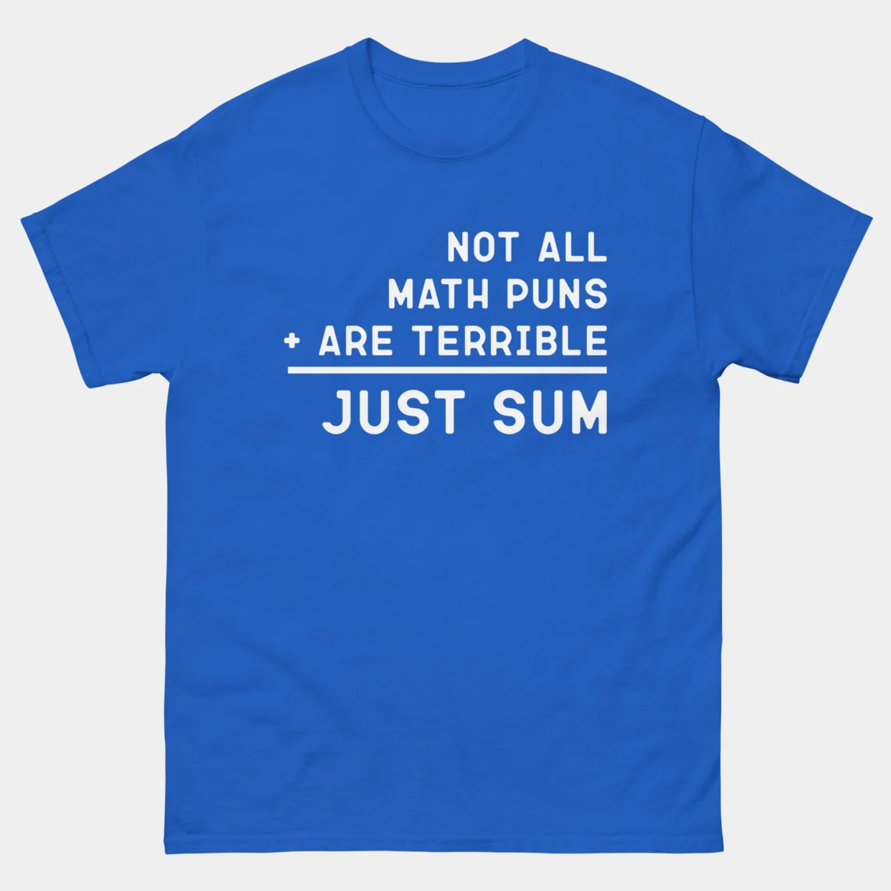 Inject some mathematical humor into your wardrobe with our Not All Math Puns Are Terrible Just Sum T-Shirt! This shirt is designed for math enthusiasts, teachers, and anyone who appreciates a good pun. With a clever and amusing design, it features the text “Not All Math Puns Are Terrible Just Sum,” playing on the word “sum” to highlight the fun side of math-related humor.
