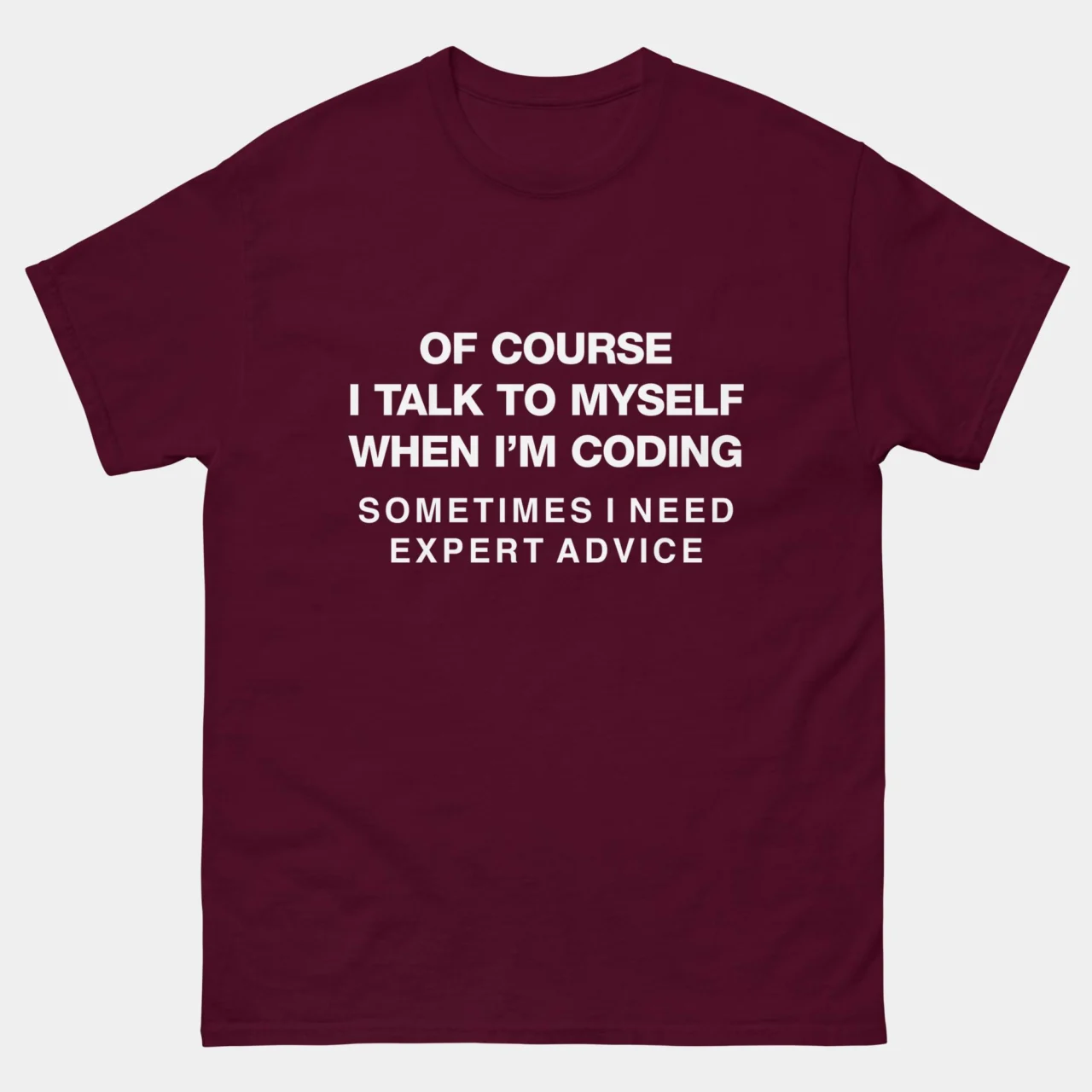 “Of course I talk to myself when Im coding—sometimes I need expert advice!” Every programmer knows that the best debugging happens out loud. This funny coding t-shirt is perfect for software engineers, developers, and IT professionals who know that self-talk is just part of the coding process.