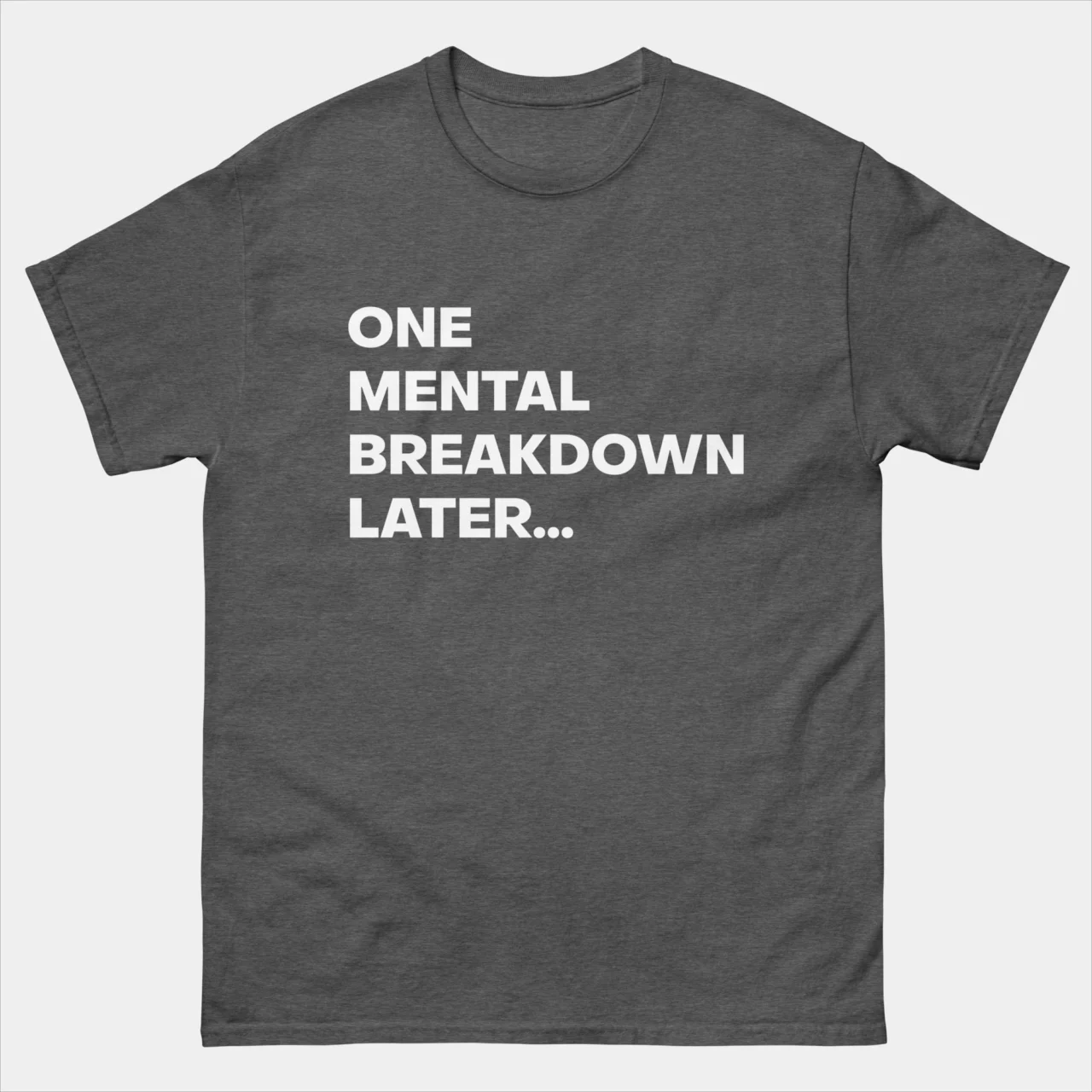 One Mental Breakdown Later T-Shirt! This sarcastic mental health tee serves as a reminder of your strength and ability to overcome challenges. Perfect for those who appreciate humor as a coping mechanism, this shirt embraces the ups and downs of mental health journeys. It also serves as a conversation starter, helping to destigmatize mental health topics. Wear it proudly and share a lighthearted message of resilience and self-care
