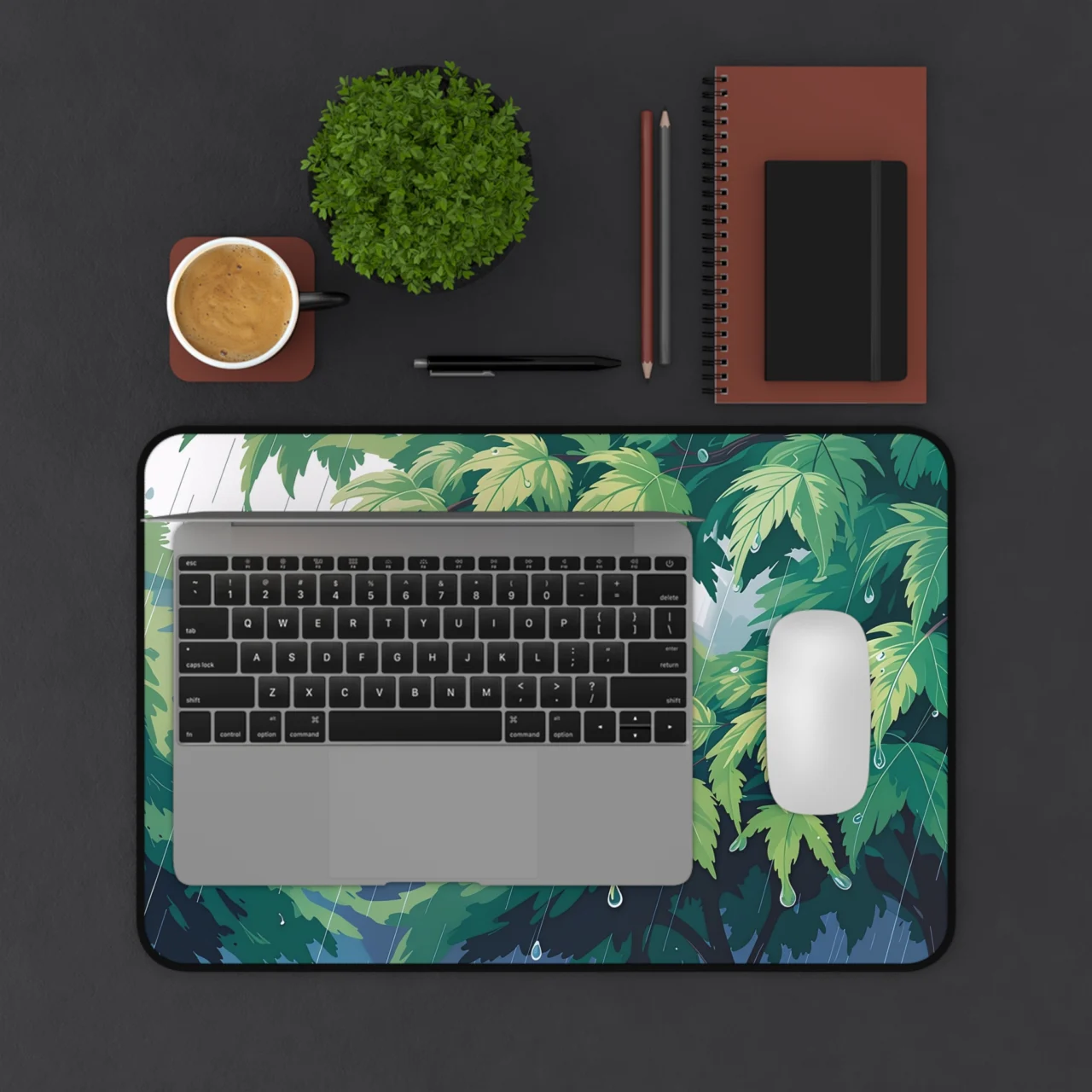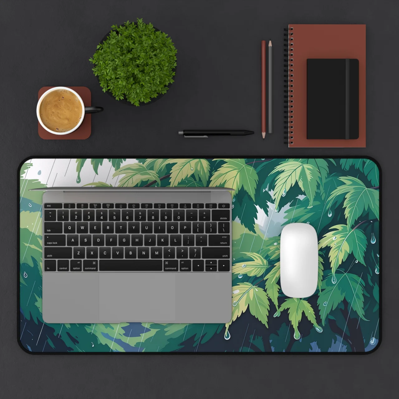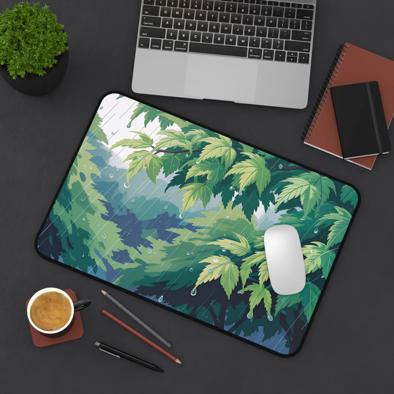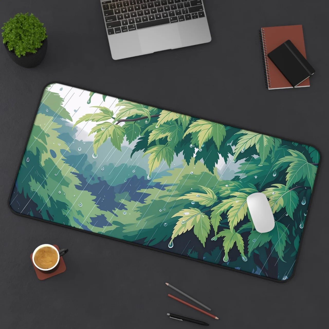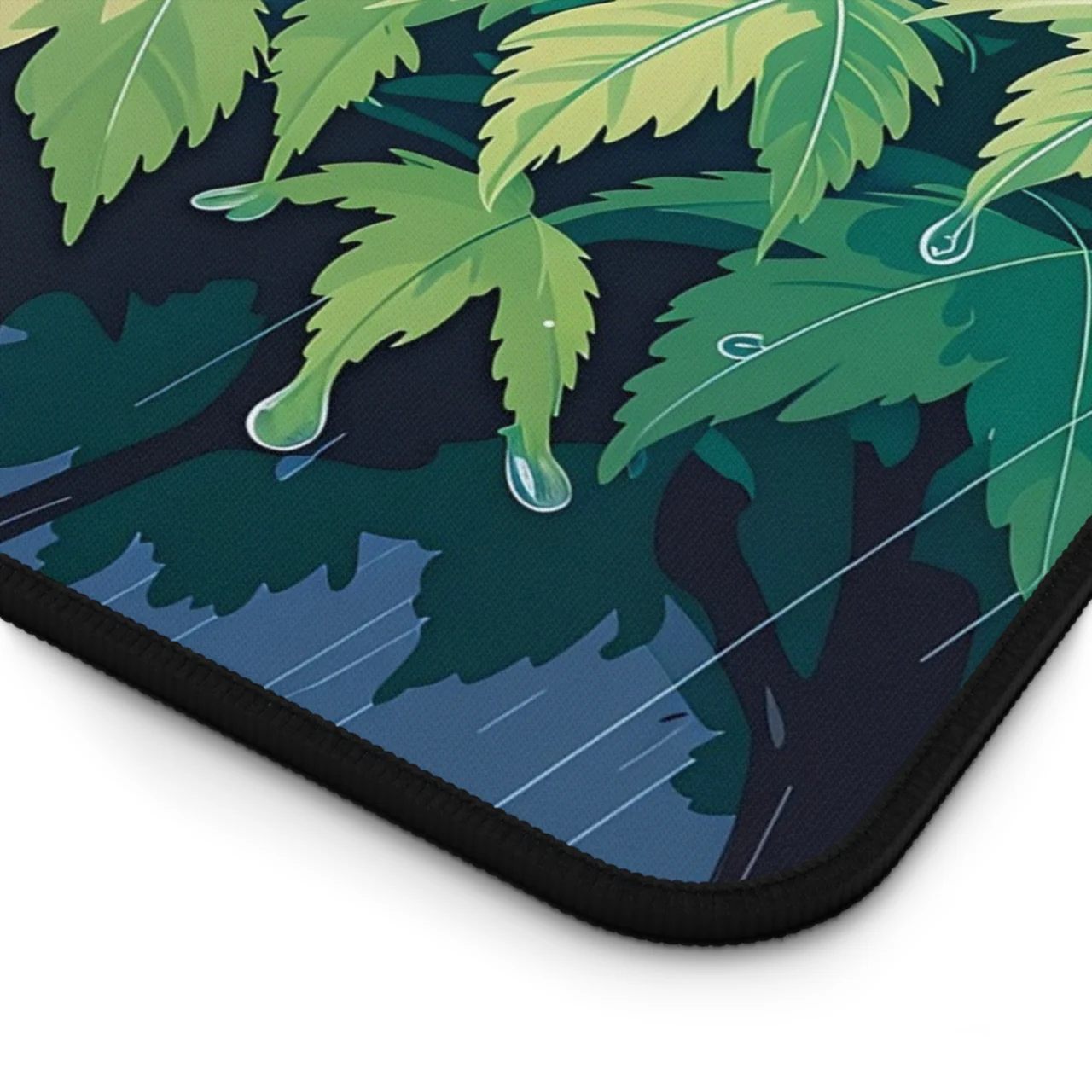 This isn’t just a mat; it’s a moment of zen in a digital downpour. Featuring a stunning, close-up illustration of lush green leaves glistening with raindrops. The dynamic yet peaceful composition perfectly captures the tranquil beauty of a rainy forest. It brings an instant sense of calm, refreshing nature to your workspace, making even the most intense coding sessions feel a little more grounded.